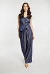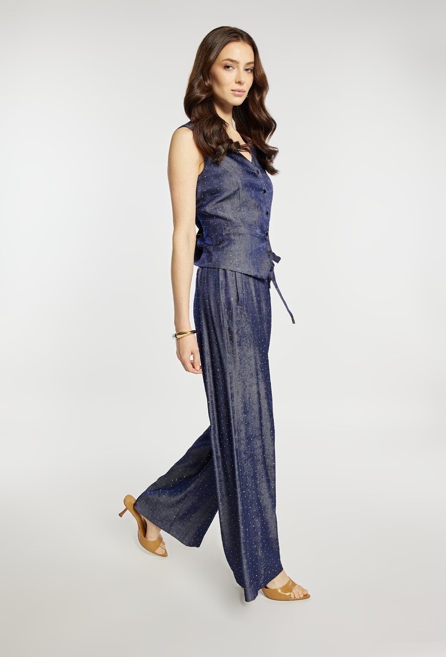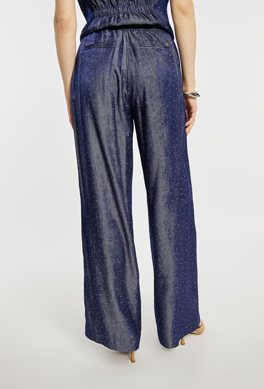 Spodnie o luźnym, prostym kroju z długą nogawką, które zapewniają swobodę ruchu i lekkość noszenia. Spodnie wyróżniają się delikatnymi, drobnymi dżetami rozmieszczonymi na całej powierzchni. Spodnie mają klasyczną talię i miękko układają się na sylwetce, dzięki czemu sprawdzą się zarówno w codziennych stylizacjach, jak i w bardziej dopracowanych zestawach, np. w komplecie z pasującą bluzką. Kod do bluzki: 26WL- BLU0300. Modelka na zdjęciu ma 177 cm wzrostu i prezentuje rozmiar 36.