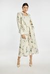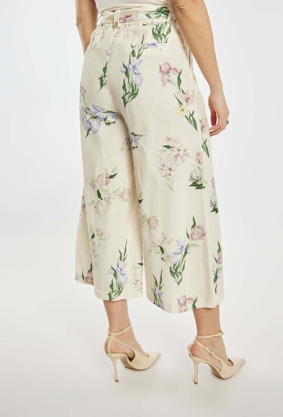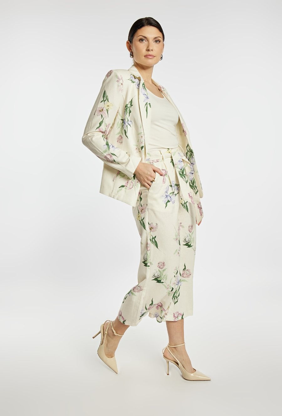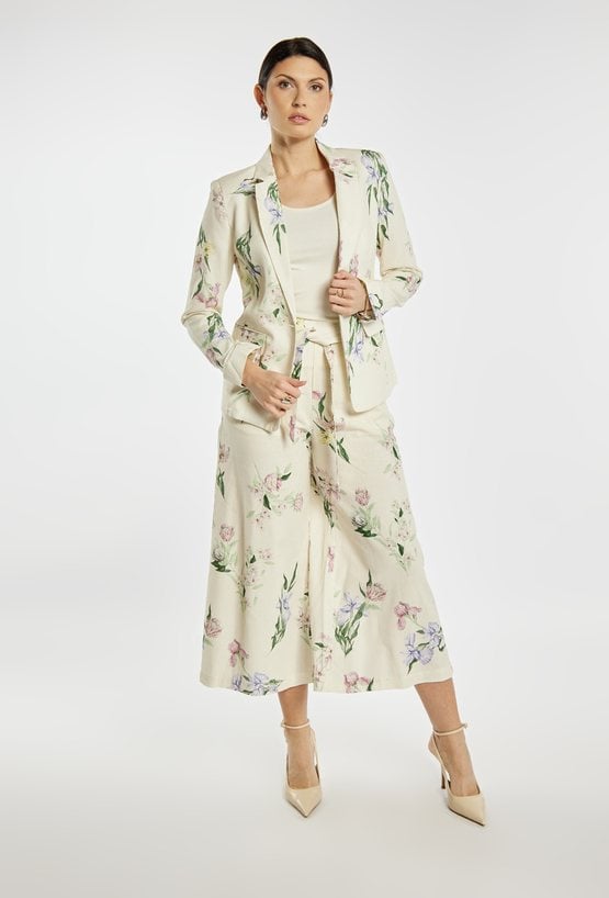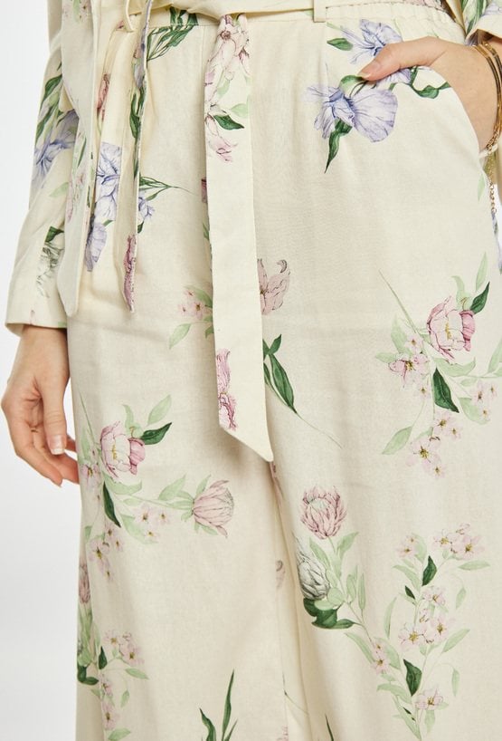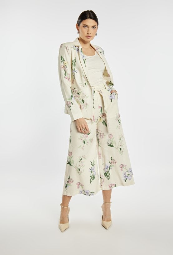 Spodnie damskie o eleganckim, szerokim kroju. Model z nogawką o długości midi oraz dopasowaną talią, która podkreśla sylwetkę. Całość zdobi subtelny, kwiatowy wzór nadający stylizacji kobiecego i lekkiego charakteru. Damskie spodnie doskonale sprawdzą się w stylizacjach wizytowych oraz eleganckich zestawach na co dzień. Modelka na zdjęciu ma 177 cm wzrostu i prezentuje rozmiar 36.