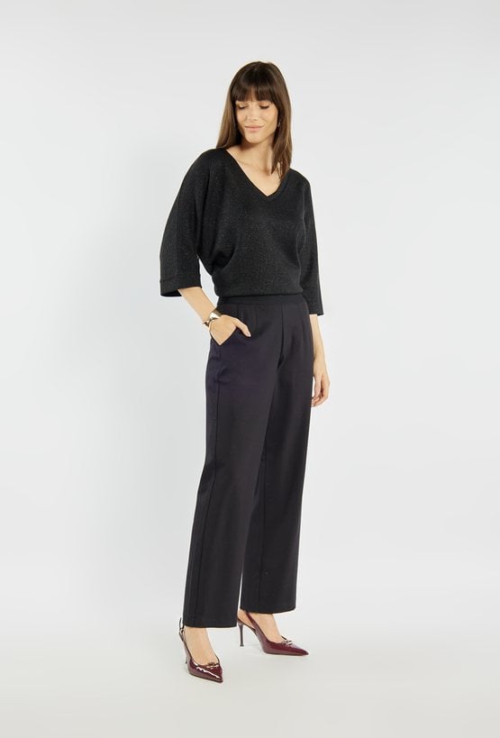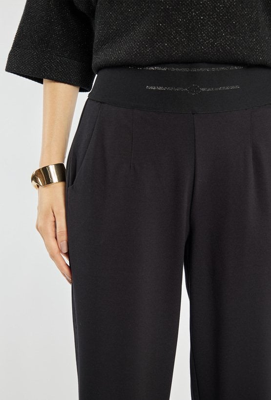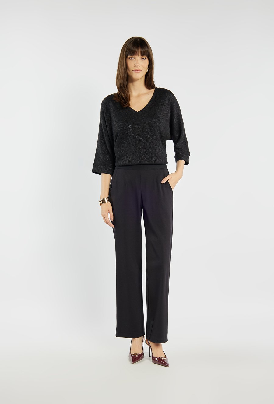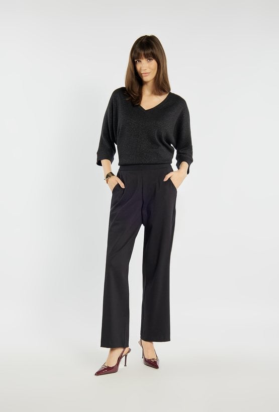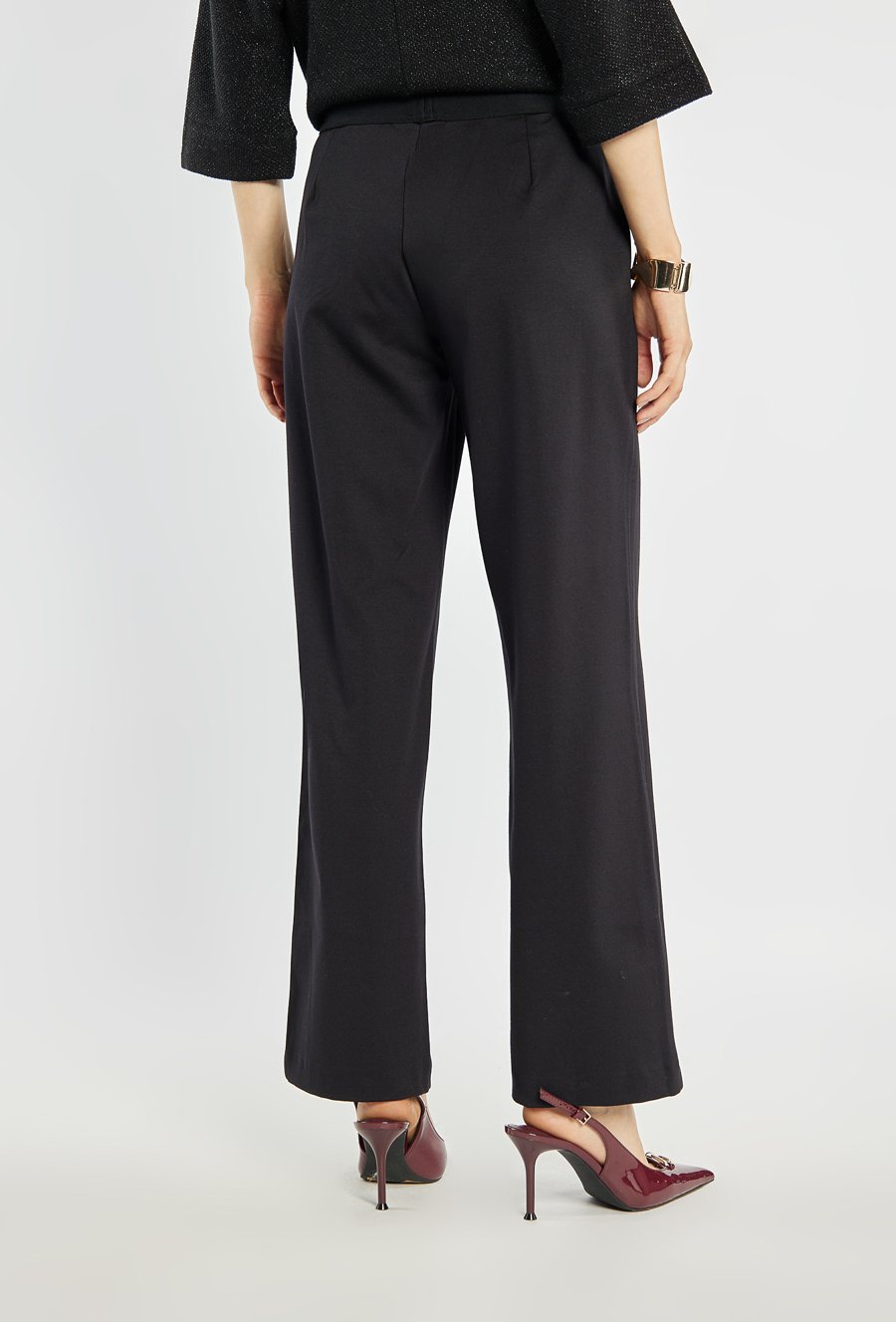 Spodnie o prostym, lekko rozszerzanym kroju. Eleganckie z bocznymi kieszeniami. Świetna baza zarówno do stylizacji codziennych, jak i bardziej formalnych. Modelka na zdjęciu ma 177 cm wzrostu i prezentuje rozmiar 36.