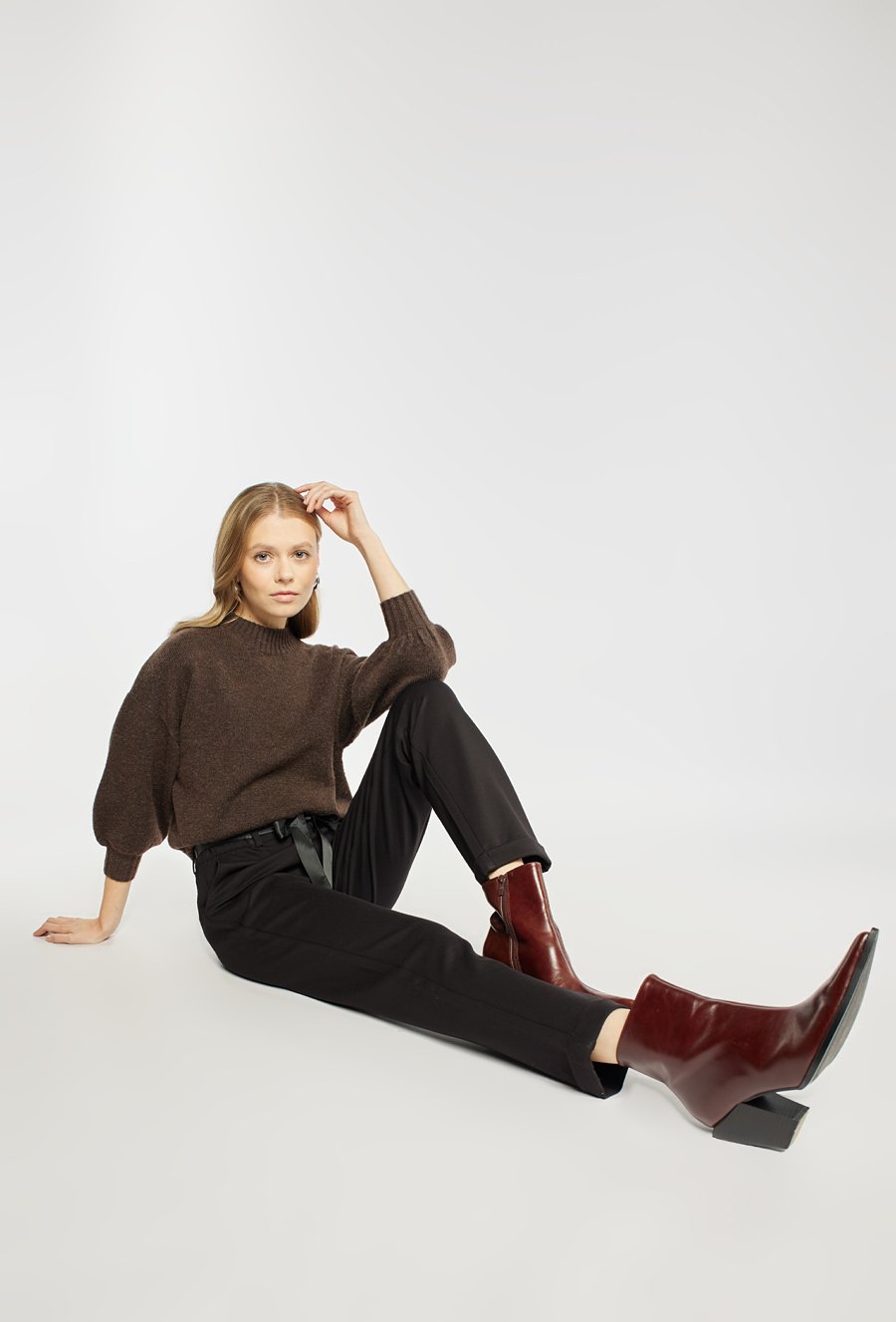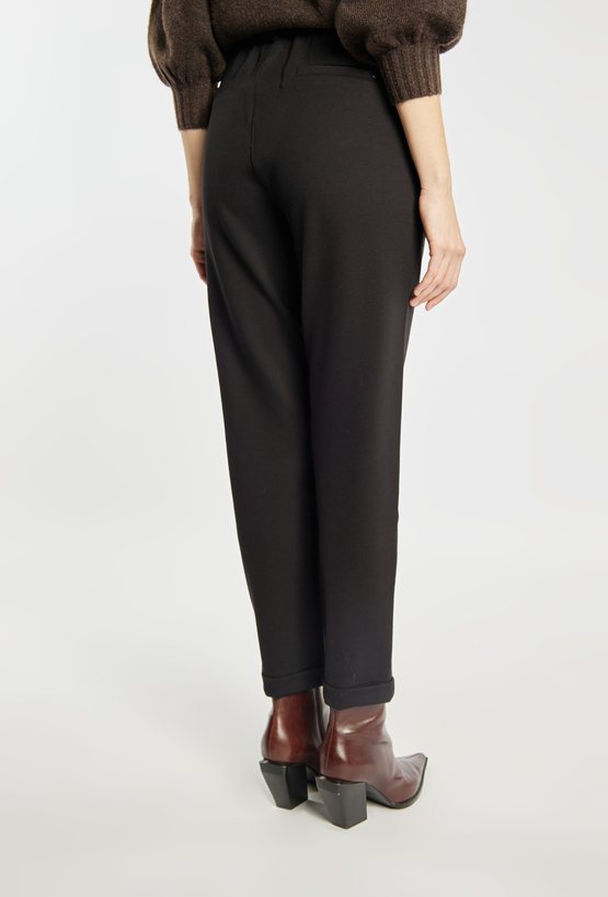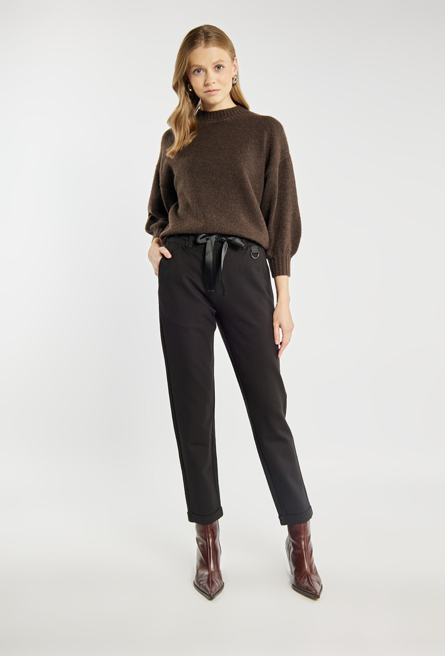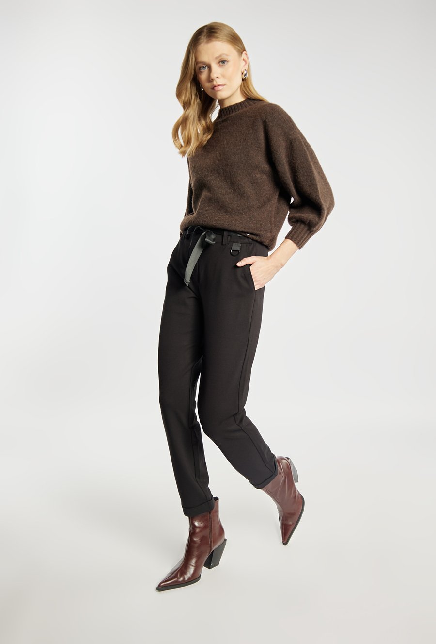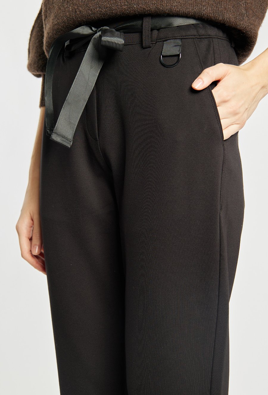 Spodnie damskie o prostym kroju, wykończone z mankietem na dole. W talii elastyczny pas z ozdobnym paskiem, który dodaje im nowoczesnego charakteru. Model z praktycznymi kieszeniami, idealny na co dzień, jak i w eleganckich stylizacjach. Modelka na zdjęciu ma 177 cm wzrostu i prezentuje rozmiar 36.
