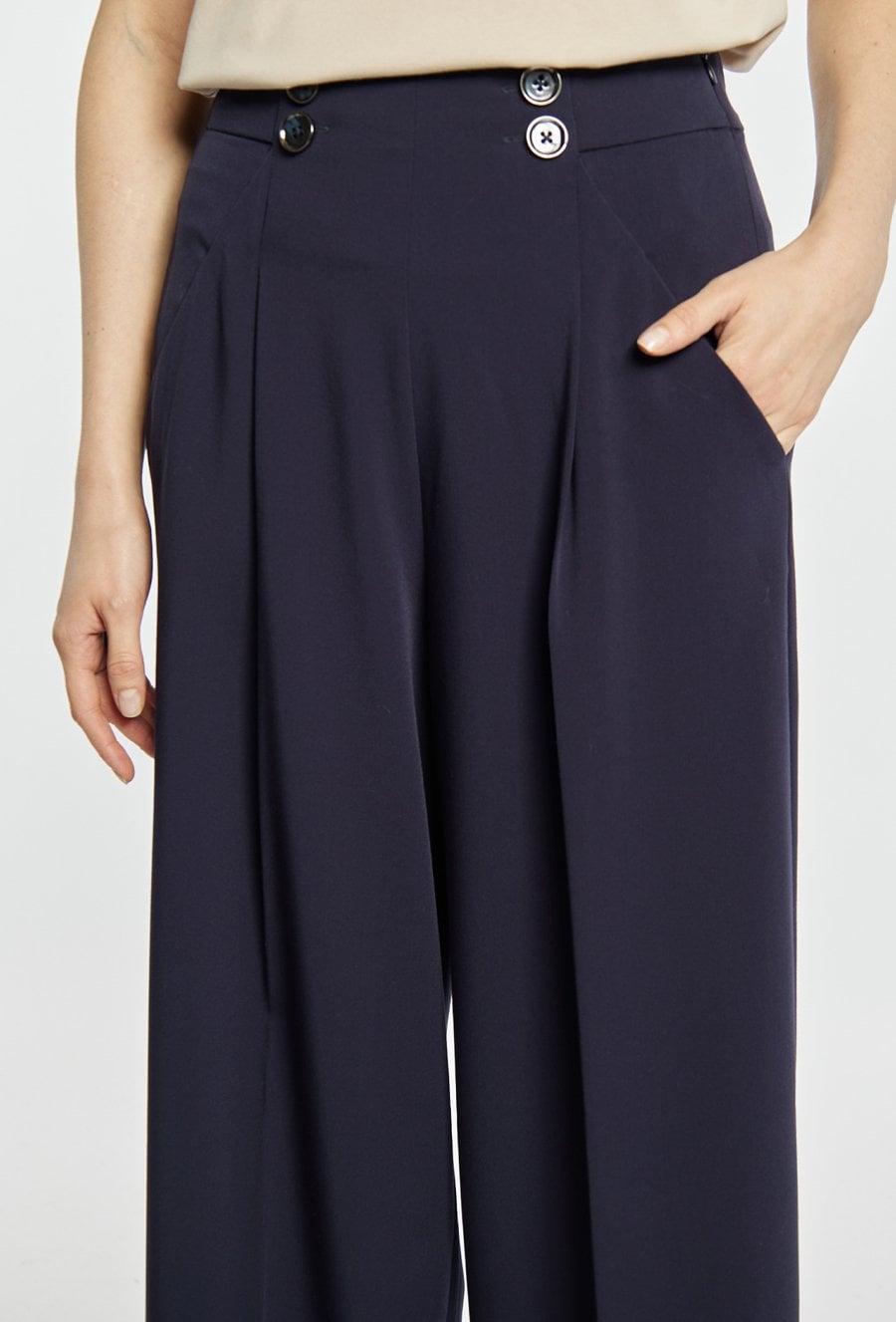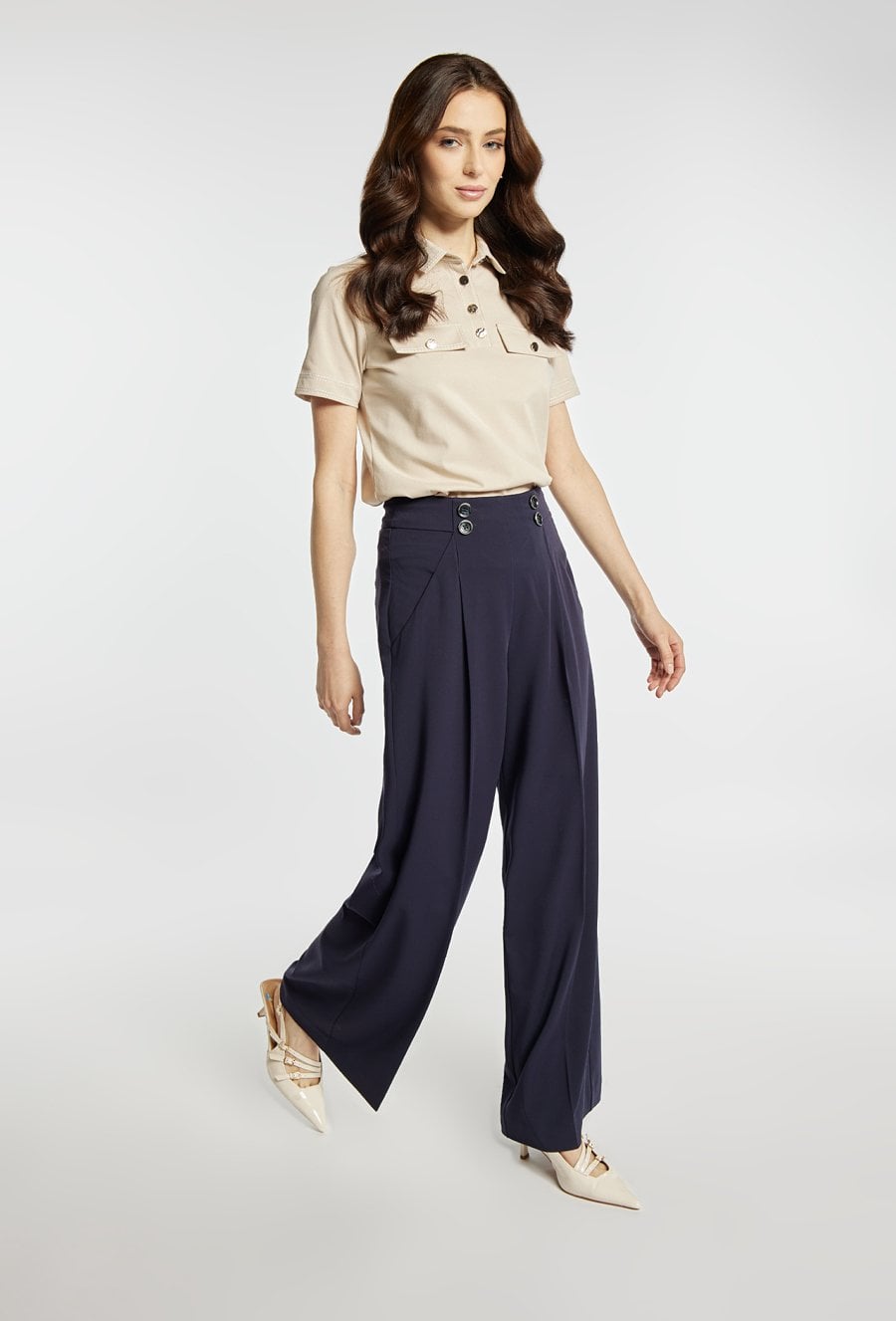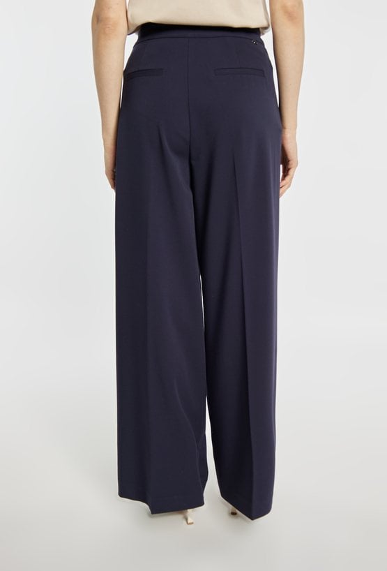 Spodnie damskie wykonane z eleganckiego materiału. Spodnie o szerokiej nogawce i wysokim stanie, z delikatnymi zakładkami z przodu, tworzą nowoczesną i wysmuklającą sylwetkę. Model idealny zarówno do codziennych, jak i bardziej formalnych stylizacji. Polecamy zestawić z pasującą marynarką: 26W-BZR0040. Modelka na zdjęciu ma 177 cm wzrostu i prezentuje rozmiar 36.