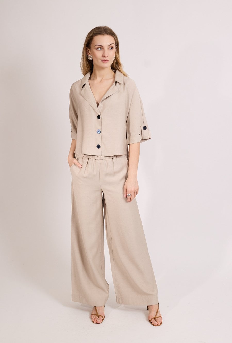 Stylowe spodnie damskie o luźnym kroju z szeroką nogawką. Model z elastycznym pasem oraz praktycznymi kieszeniami, które zapewniają wygodę i swobodę noszenia. Spodnie doskonale sprawdzą się w codziennych i eleganckich stylizacjach, tworząc modny i komfortowy zestaw. Modelka na zdjęciu ma 177 cm wzrostu i prezentuje rozmiar 36.