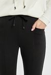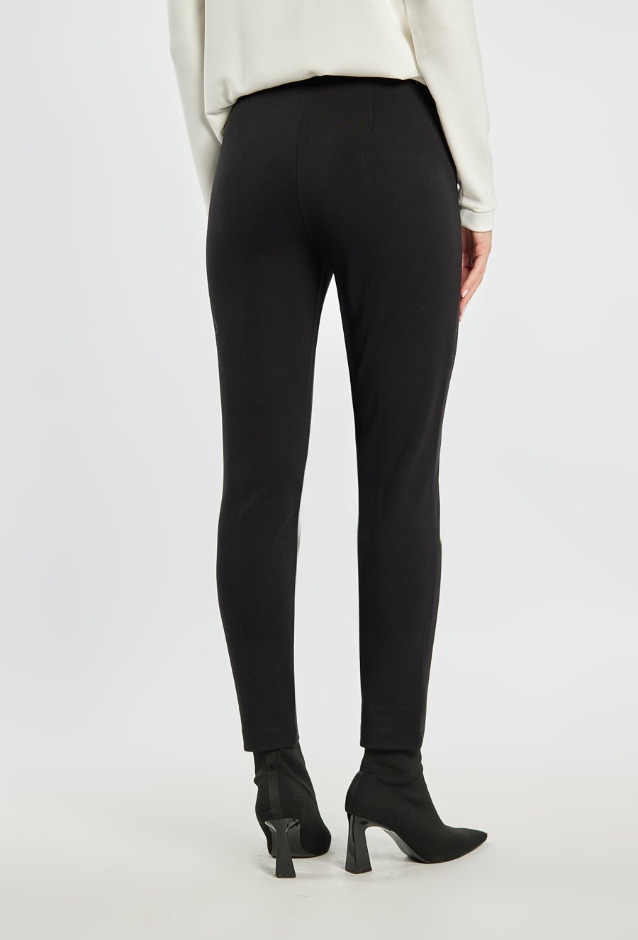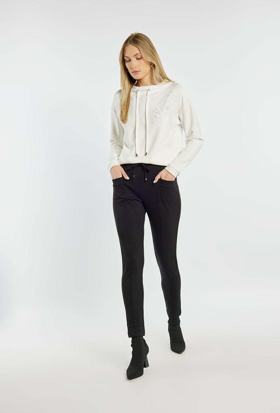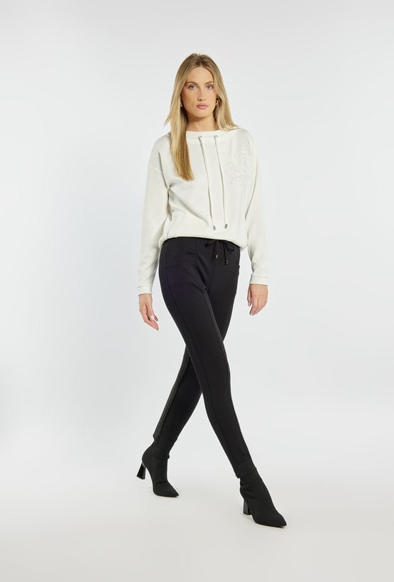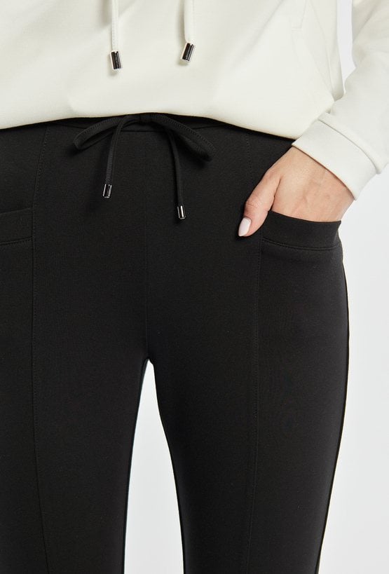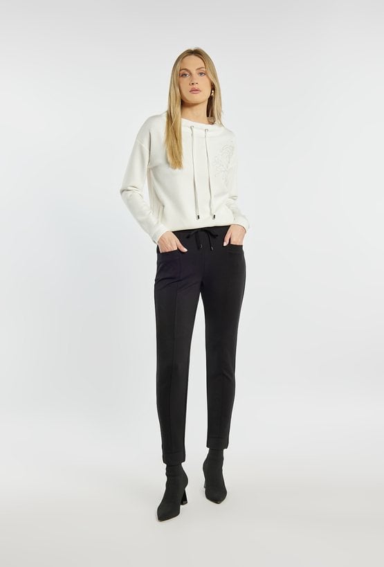 Spodnie o prostym kroju z lekko zwężanymi nogawkami, zakończone mankietem. W pasie wygodna guma z troczkiem do regulacji oraz praktyczne kieszenie. Idealne połączenie elegancji i komfortu na co dzień. Modelka na zdjęciu ma 177 cm wzrostu i prezentuje rozmiar S