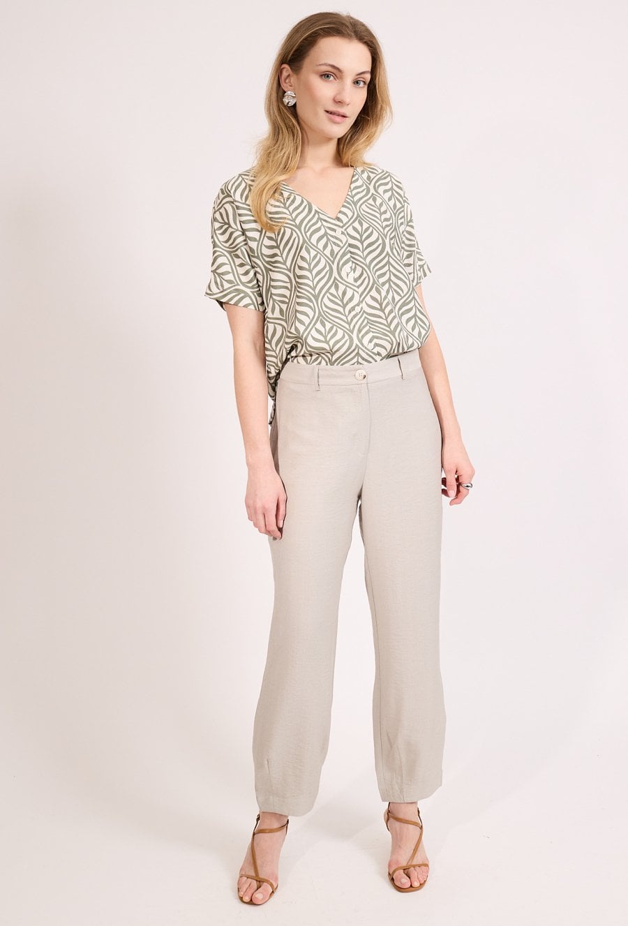 Stylowe spodnie damskie o luźnym kroju z prostą nogawką. Model z wysokim stanem oraz klasycznym zapięciem, który zapewnia wygodę i elegancki wygląd. Spodnie doskonale sprawdzą się w codziennych i biznesowych stylizacjach, do pracy oraz na spotkania. Modelka na zdjęciu ma 177 cm wzrostu i prezentuje rozmiar 36.