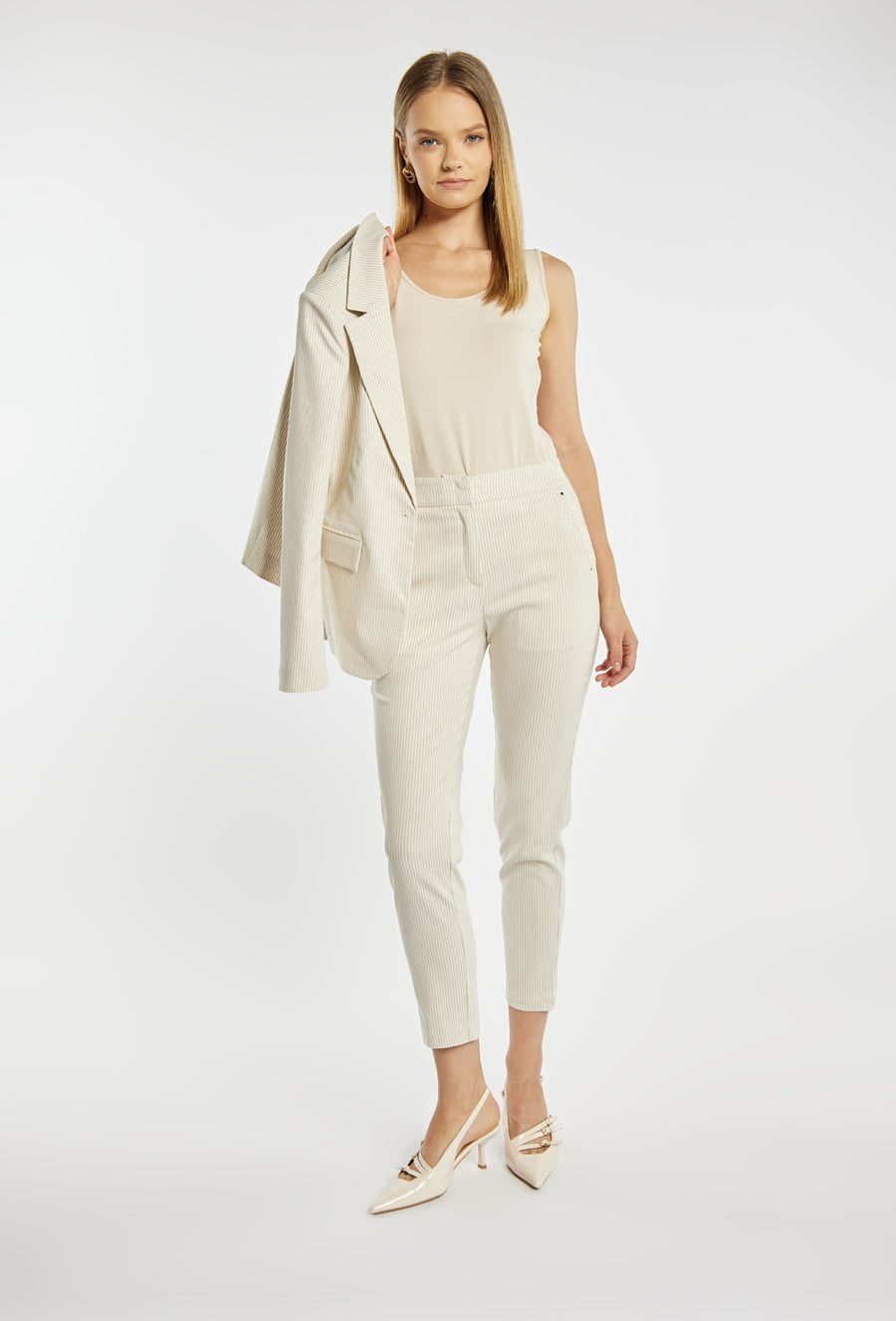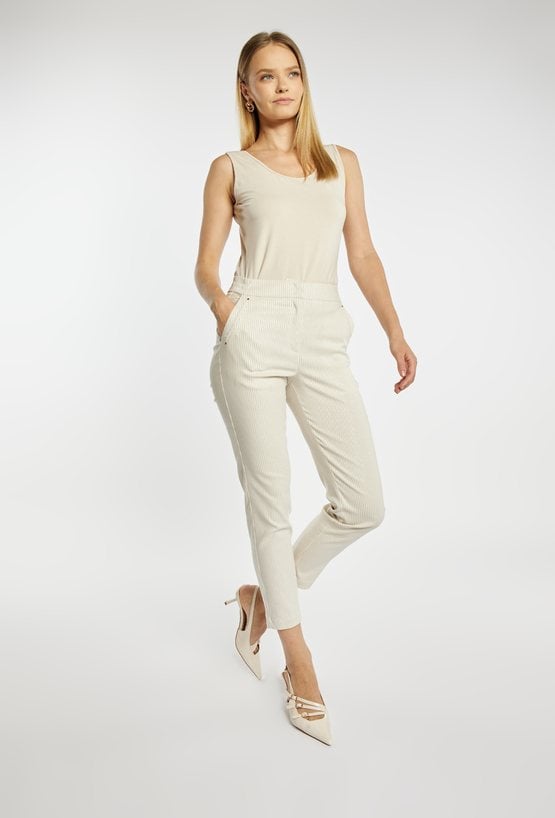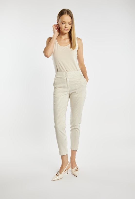Spodnie damskie o dopasowanym, lekko zwężanym kroju. Model z delikatnym, pionowym prążkiem, który optycznie wydłuża i wysmukla sylwetkę. Klasyczne kieszenie dodają funkcjonalności, a minimalistyczny design sprawia, że spodnie świetnie sprawdzą się zarówno w codziennych, jak i bardziej eleganckich stylizacjach. Modelka na zdjęciu ma 177 cm wzrostu i prezentuje rozmiar 36.