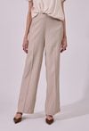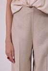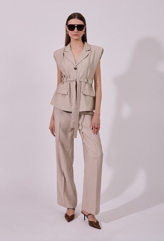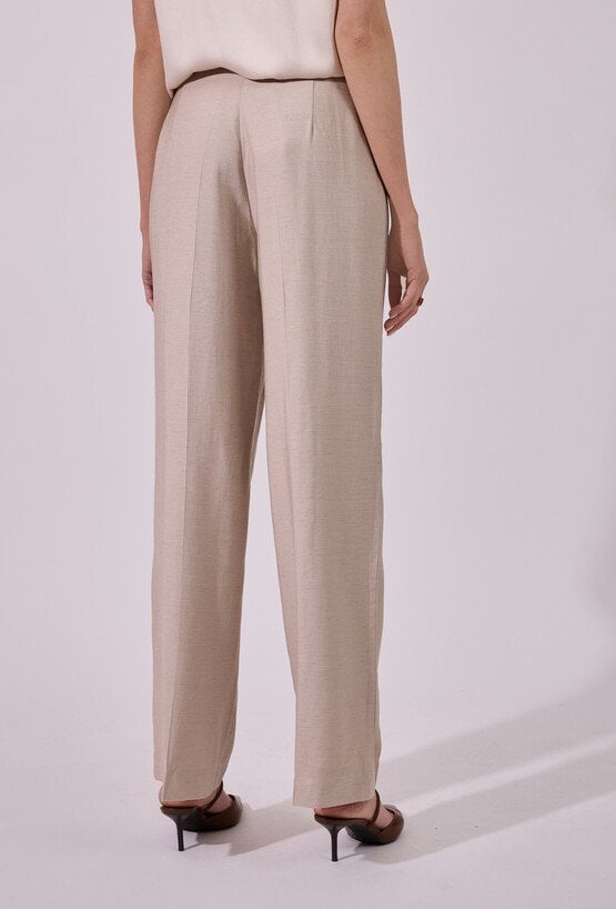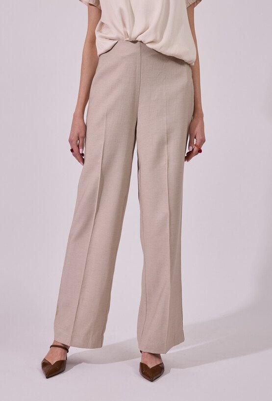 Spodnie damskie o eleganckim, lekko rozszerzanym kroju. Model z wysokim stanem, który podkreśla talię i optycznie wydłuża sylwetkę. Prosta linia z delikatnym kantem nadaje całości klasycznego charakteru, a lekko rozszerzana nogawka dodaje nowoczesnej elegancji. Modelka na zdjęciu ma 177 cm wzrostu i prezentuje rozmiar 36.