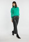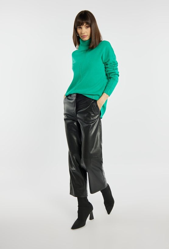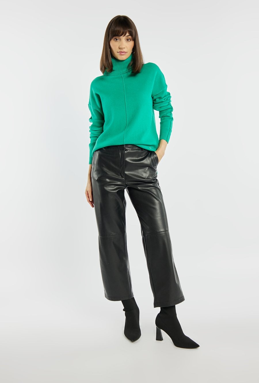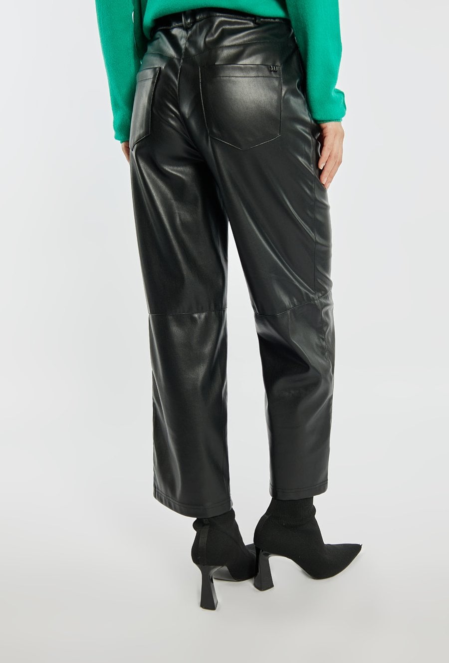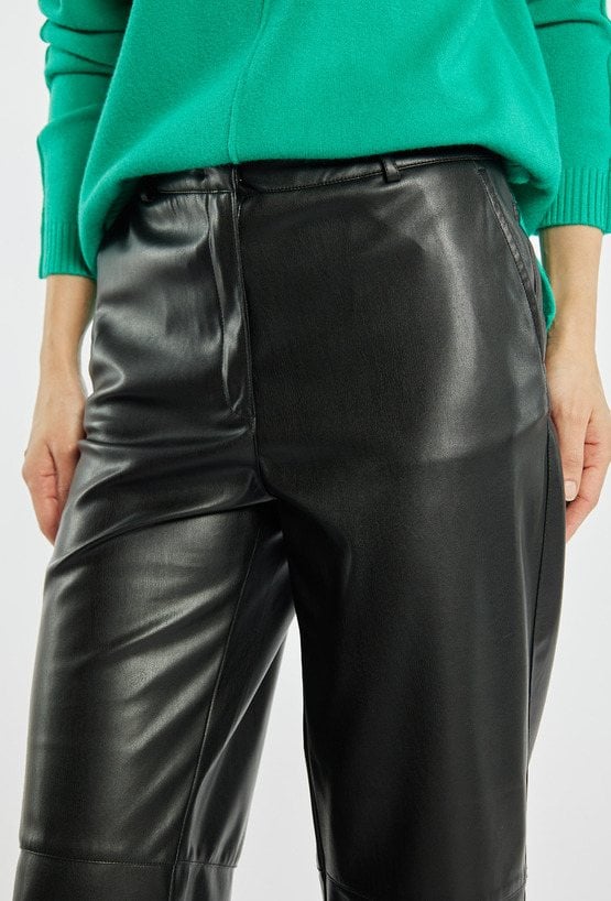 Spodnie damskie o prostym kroju, wykonane z imitacji skóry. Model z wysokim stanem oraz praktycznymi kieszeniami. Nogawki o lekko rozszerzanym fasonie nadają całości nowoczesnego charakteru. Doskonała propozycja zarówno do eleganckich stylizacji, jak i codziennych zestawów z nutą szyku. Modelka na zdjęciu ma 177 cm wzrostu i prezentuje rozmiar 36.