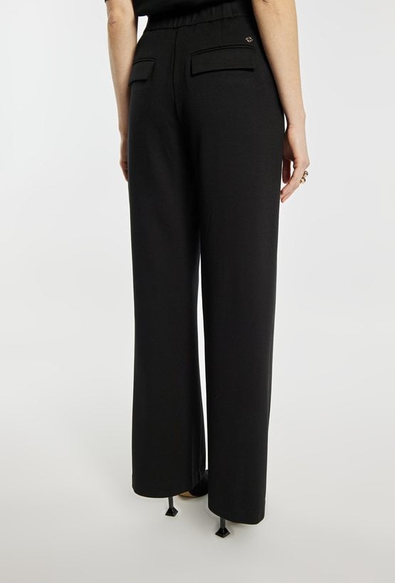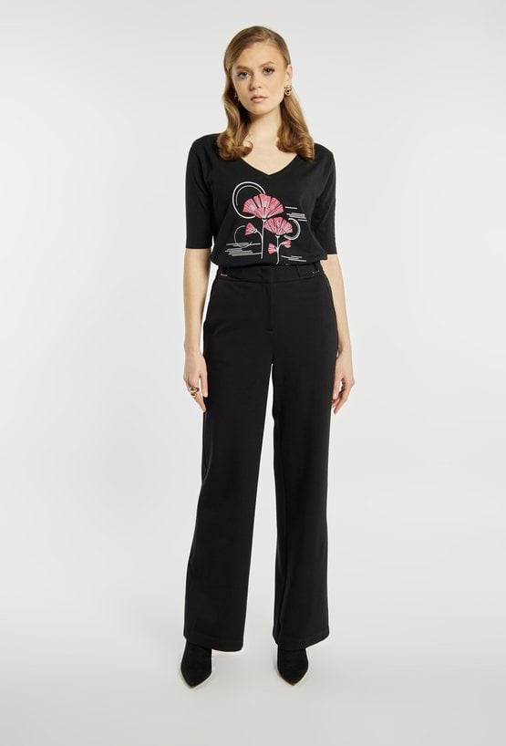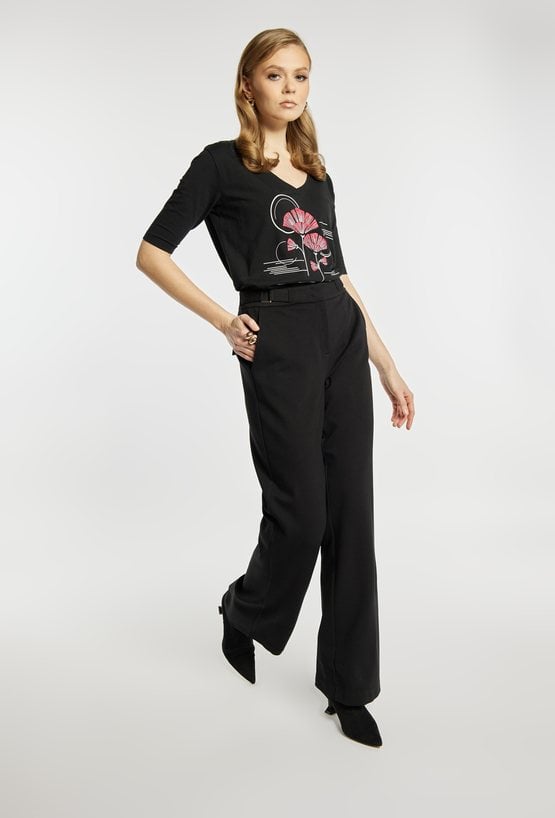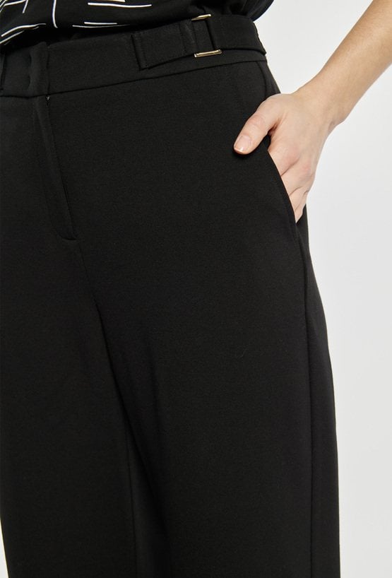 Spodnie damskie o prostym, eleganckim kroju. Model z wysokim stanem i długimi, lekko rozszerzanymi nogawkami, które optycznie wydłużają sylwetkę. Doskonale sprawdzą się w stylizacjach biurowych i formalnych. Można je zestawić z pasującą marynarką, tworząc stylowy garnitur damski. Kod do marynarki: 26W-BZR0070. Modelka na zdjęciu ma 177 cm wzrostu i prezentuje rozmiar 36.