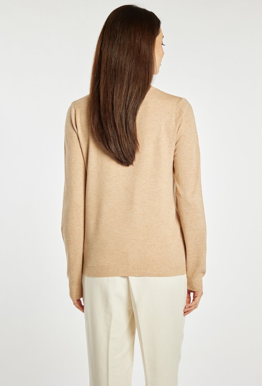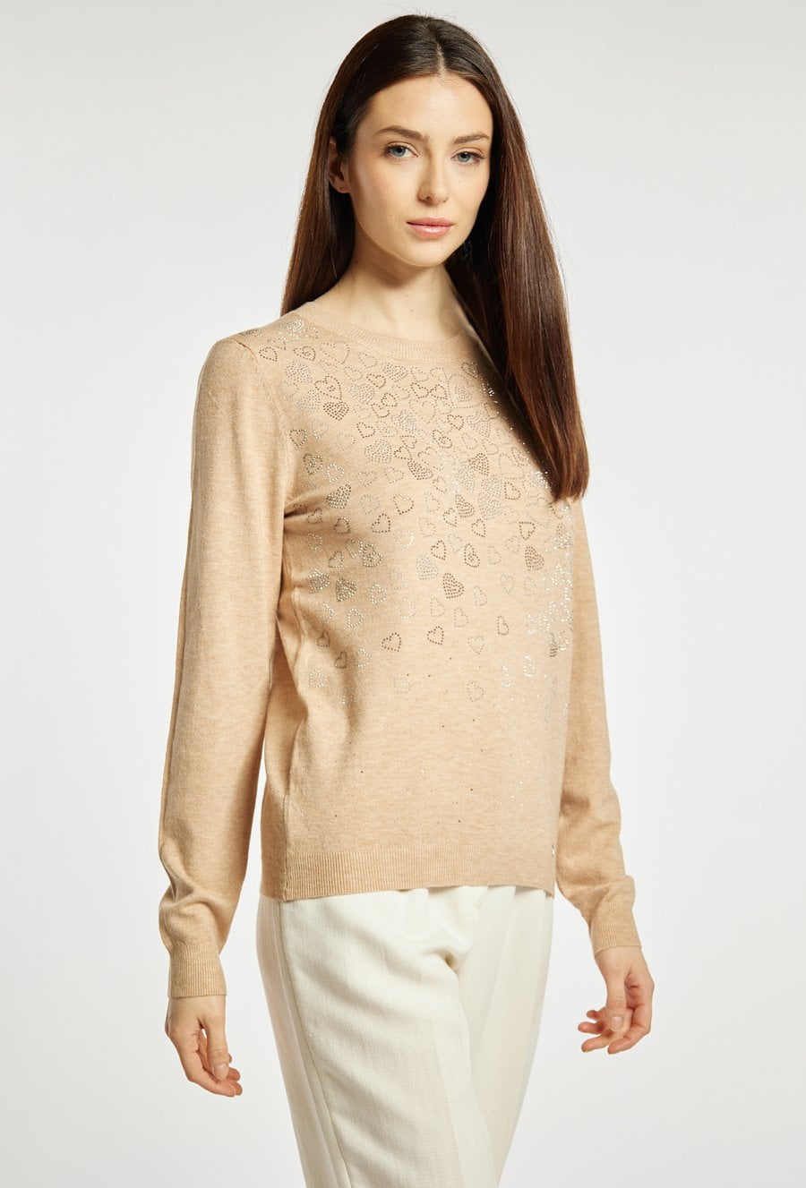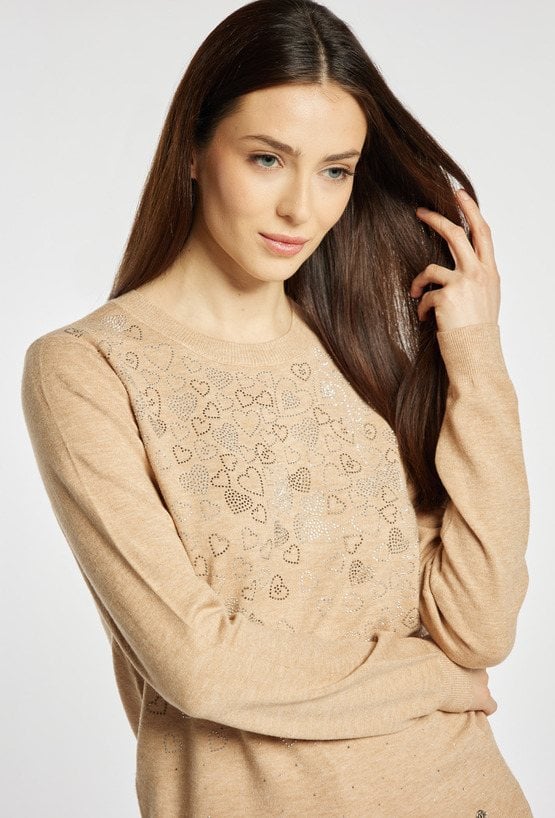 Sweter damski o klasycznym, dopasowanym kroju. Model z długim rękawem oraz półokrągłym dekoltem. Przód zdobi subtelna aplikacja w kształcie serc z delikatnie połyskującymi elementami, która nadaje całości kobiecego i eleganckiego charakteru. Sweter doskonale sprawdzi się w codziennych oraz bardziej stylowych zestawach. Modelka na zdjęciu ma 177 cm wzrostu i prezentuje rozmiar S/M.
