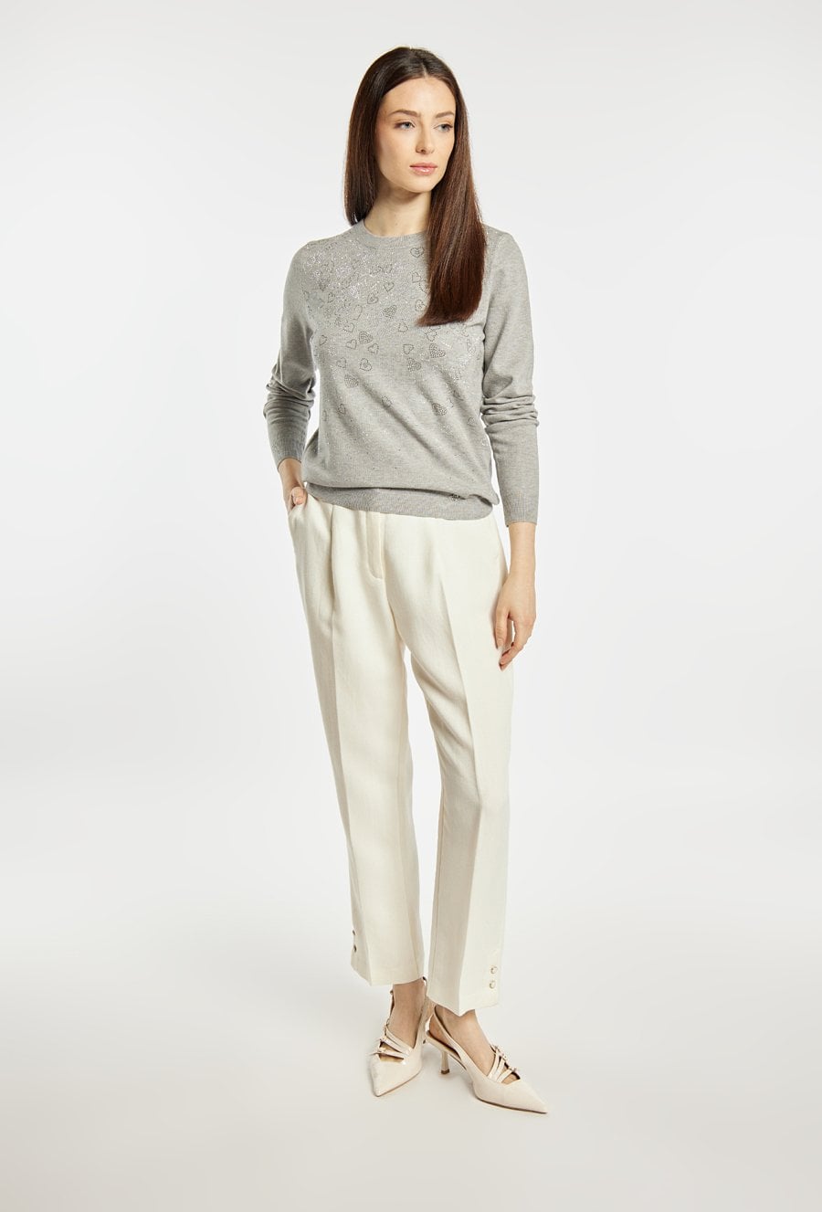 Sweter damski o klasycznym, dopasowanym kroju. Model z długim rękawem oraz półokrągłym dekoltem. Przód zdobi subtelna aplikacja w kształcie serc z delikatnie połyskującymi elementami, która nadaje całości kobiecego i eleganckiego charakteru. Sweter doskonale sprawdzi się w codziennych oraz bardziej stylowych zestawach. Modelka na zdjęciu ma 177 cm wzrostu i prezentuje rozmiar S/M.