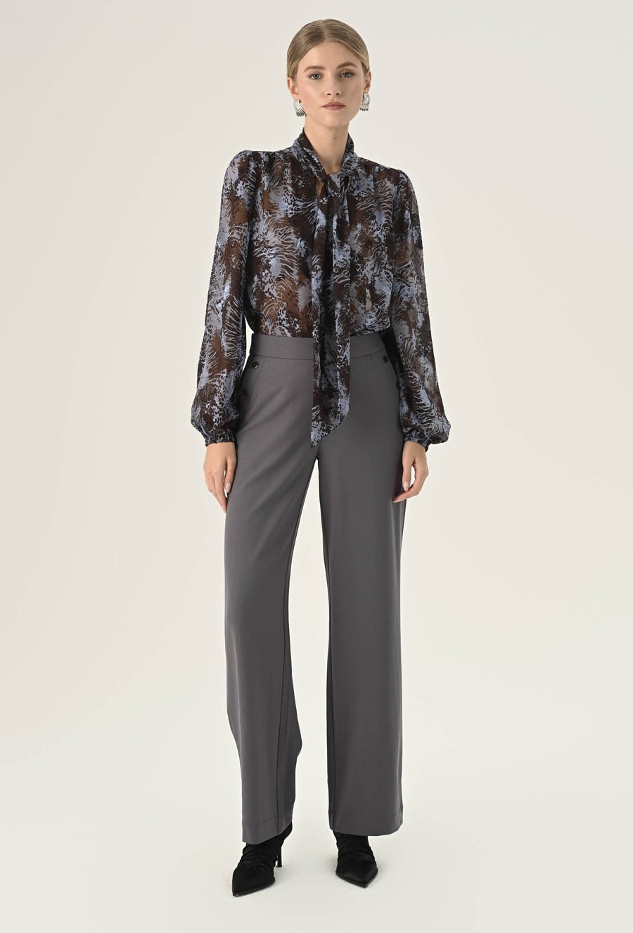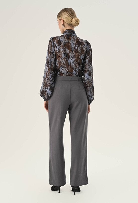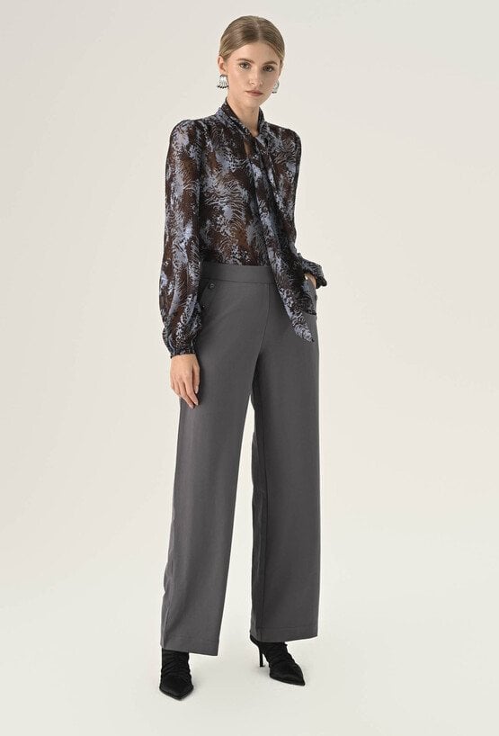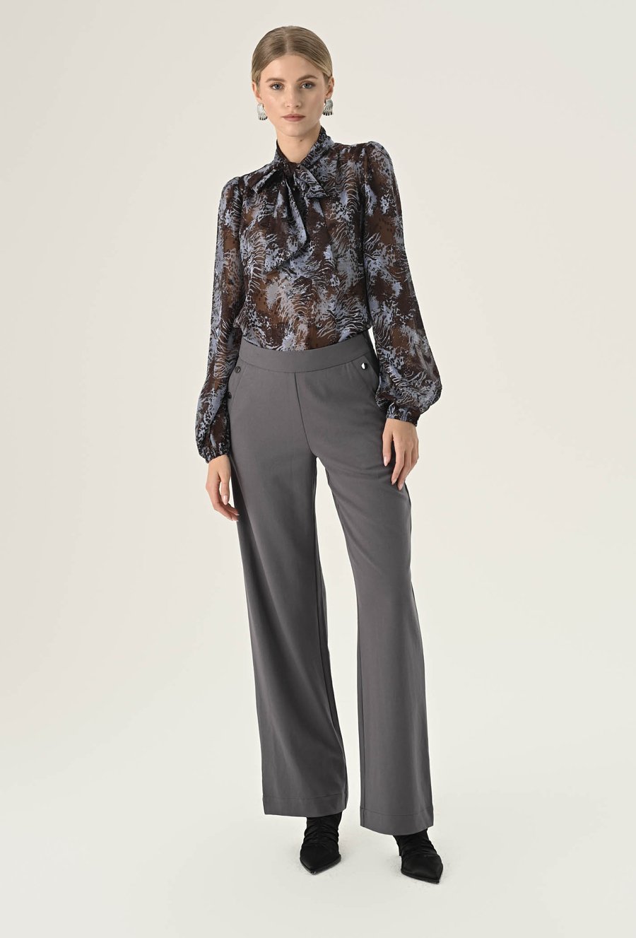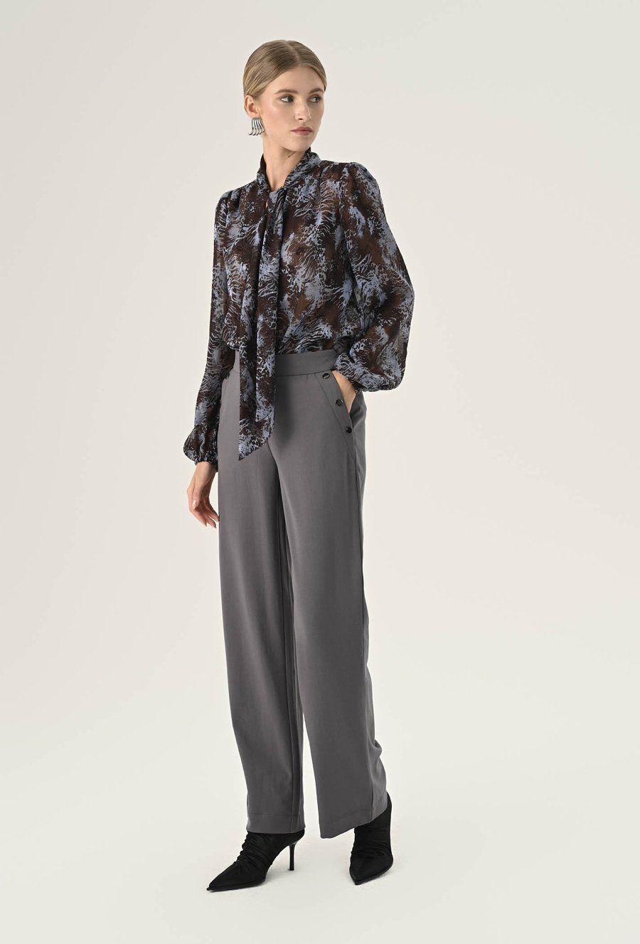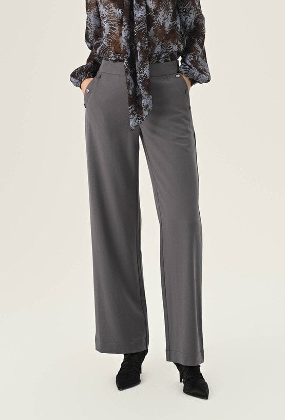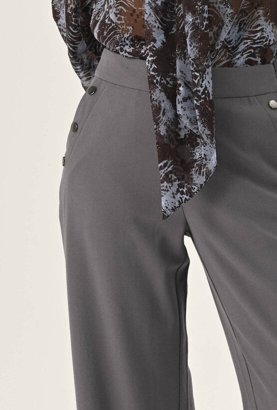 Eleganckie spodnie z wysokim stanem w klasycznym szarym kolorze to kluczowy element każdej jesiennej garderoby, który łączy w sobie wygodę i styl. Stylu dodają i ozdobne guziki. Rozszerzane ku dołowi nogawki dodają lekkości i sprawiają, że spodnie są bardzo stylowe. Wysoki stan podkreśla talię, co wysmukla sylwetkę i czyni te spodnie idealnym wyborem do różnych stylizacji. Modelka na zdjęciu ma 179 cm wzrostu i prezentuje rozmiar 36.