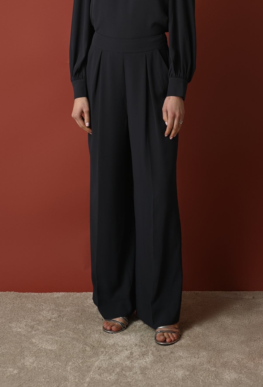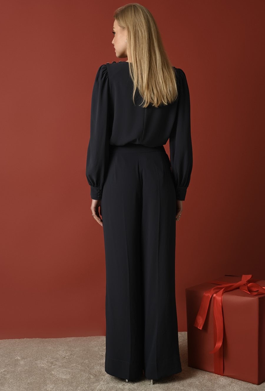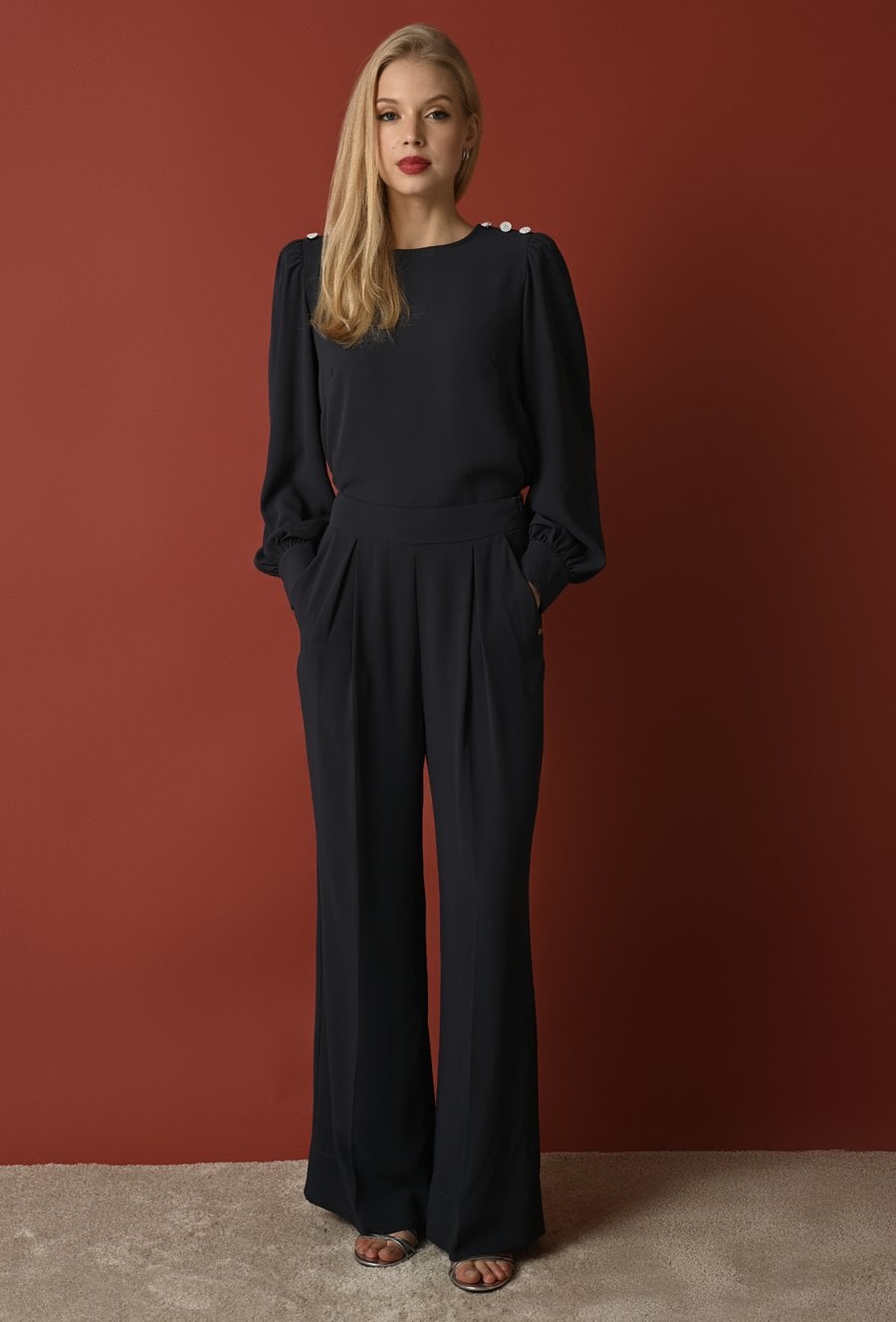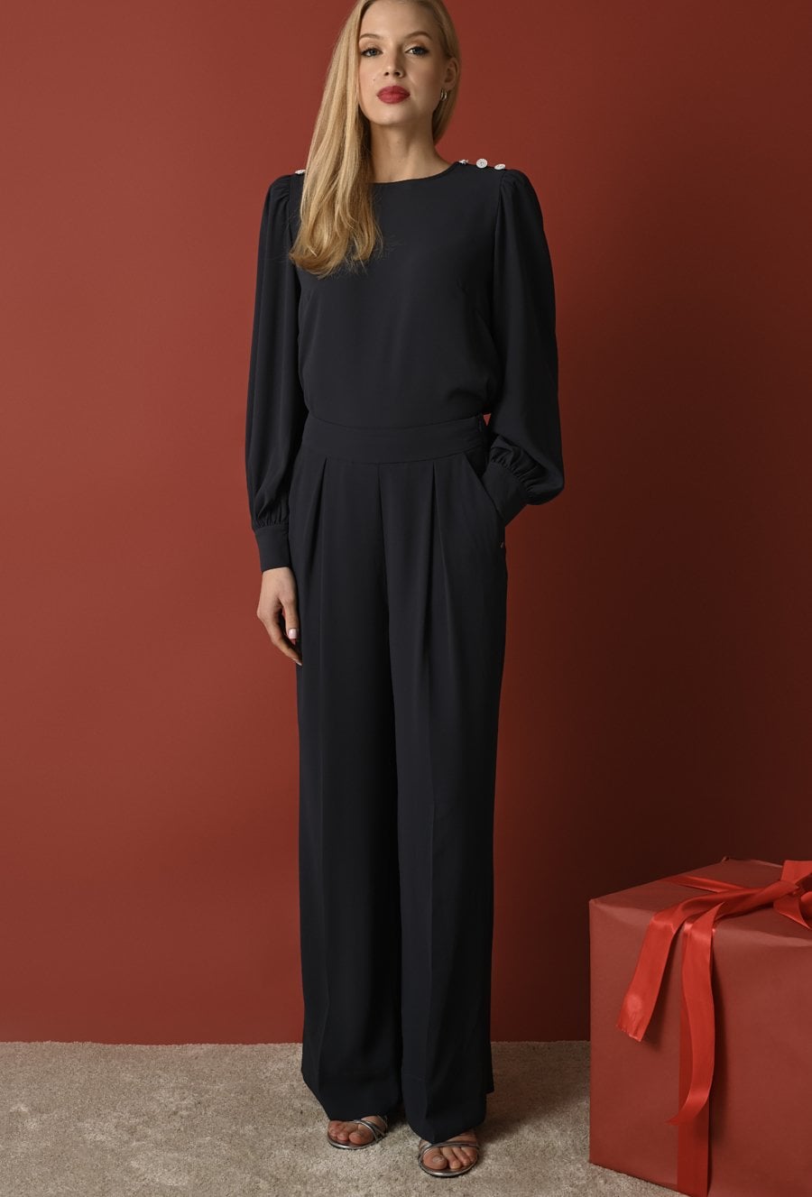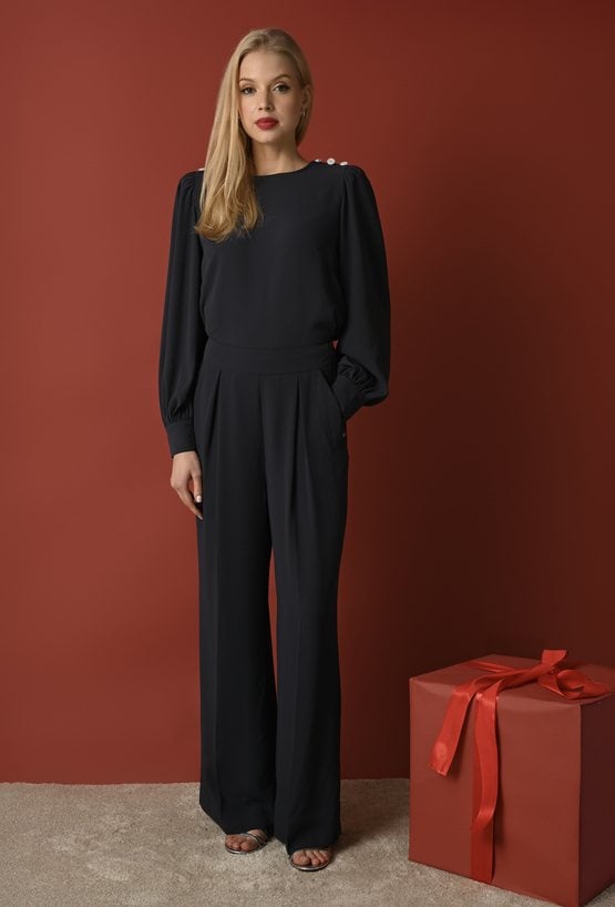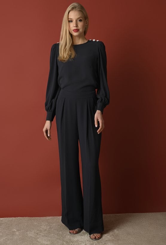 Eleganckie spodnie z szeroką nogawką to doskonały wybór dla miłośniczek ponadczasowego stylu z nutą nowoczesnej elegancji. Wysoki stan pięknie podkreśla talię, a szerokie, lekko wydłużone nogawki optycznie wysmuklają sylwetkę. Dwie zaszewki z przodu dodają całości elegancji i wyrafinowanego charakteru. spodnie występuję w komplecie z bluzką. Modelka na zdjęciu ma 177 cm wzrostu i prezentuje rozmiar 36.