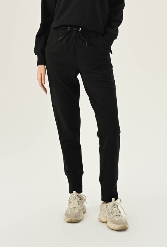 Stylowe i wygodne spodnie dresowe wykonane z miękkiej bawełnianej dzianiny to idealny wybór na co dzień. Zwężane nogawki zakończone wysokim ściągaczem nadają sylwetce lekkości i podkreślają sportowy charakter. Wysoka guma w pasie zapewnia świetne dopasowanie i komfort noszenia. Doskonałe do aktywnego trybu życia i codziennego relaksu. Modelka na zdjęciu ma 177 cm wzrostu i prezentuje rozmiar S.