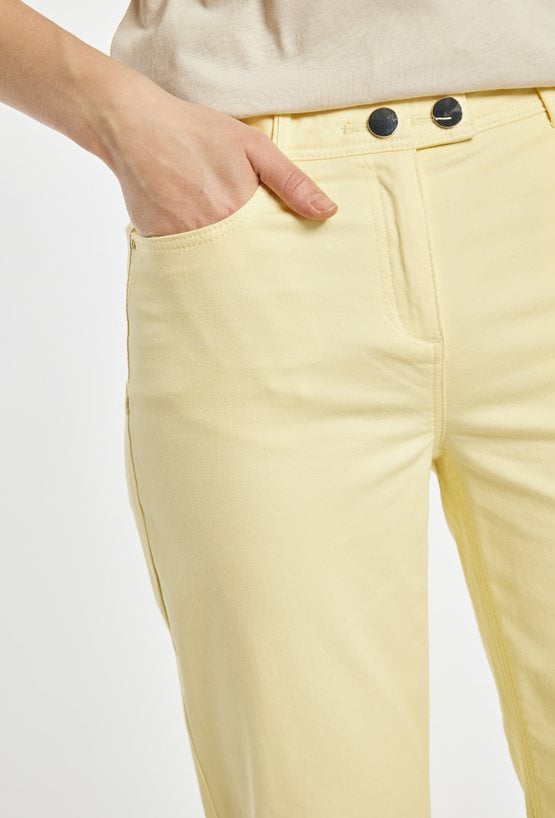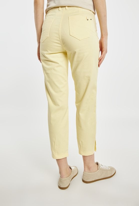Spodnie damskie o eleganckim, prostym kroju. Model z klasycznym stanem, zapinany na guziki, z długimi nogawkami delikatnie zwężanymi ku dołowi. Subtelne detale przy nogawkach nadają całości nowoczesnego charakteru.