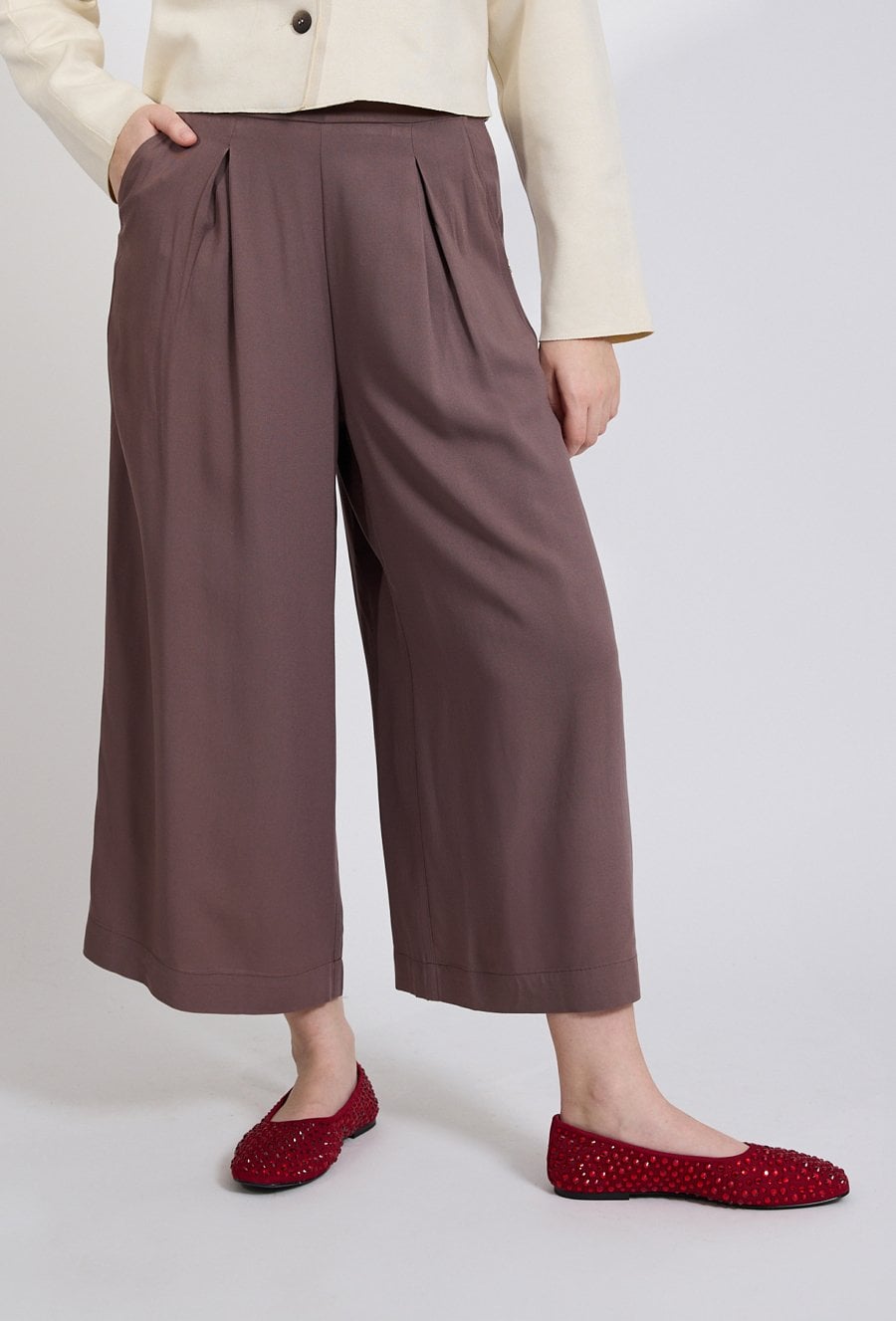 Spodnie damskie o szerokim, eleganckim kroju. Model z wysokim stanem oraz szerokimi nogawkami o długości 7/8, które nadają stylizacji lekkości i nowoczesnego charakteru. Z przodu znajdują się subtelne zakładki, a po bokach praktyczne kieszenie. Damskie spodnie doskonale sprawdzą się zarówno w stylizacjach eleganckich, jak i codziennych. Modelka na zdjęciu ma 177 cm wzrostu i prezentuje rozmiar 36.