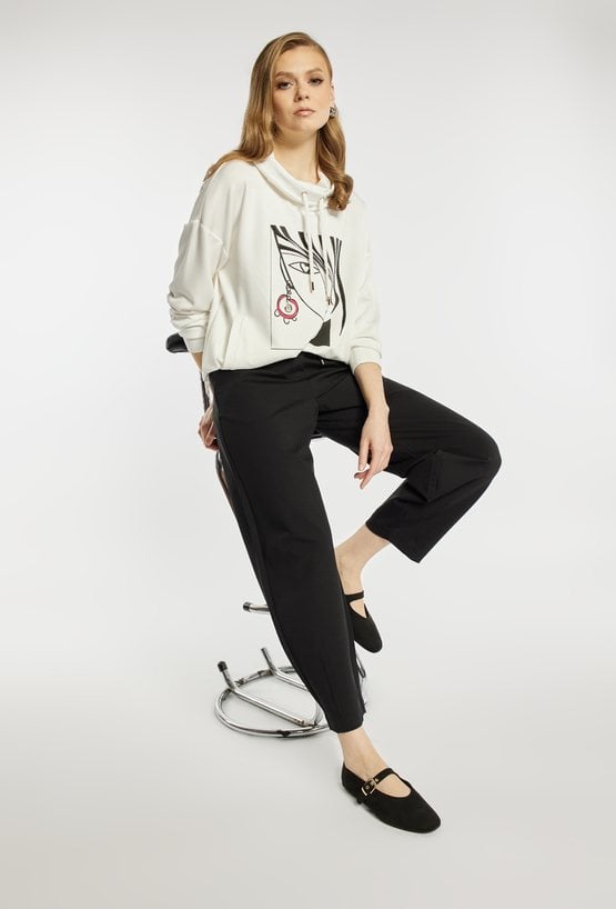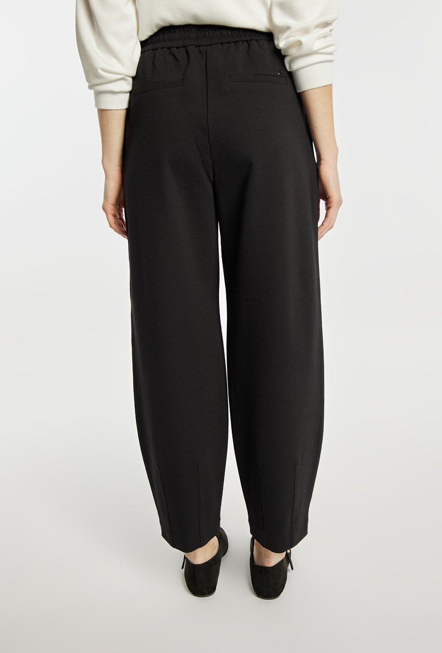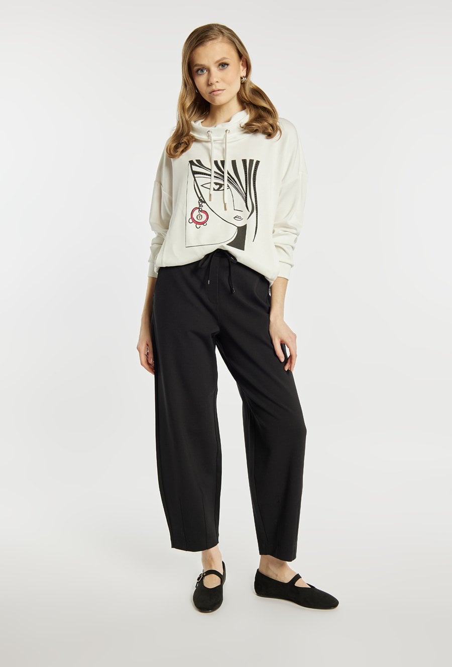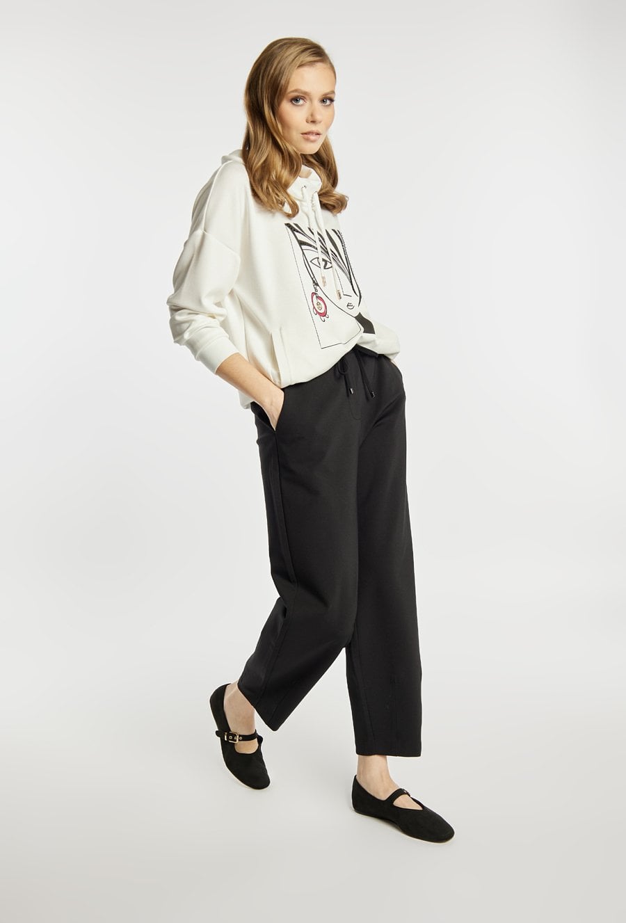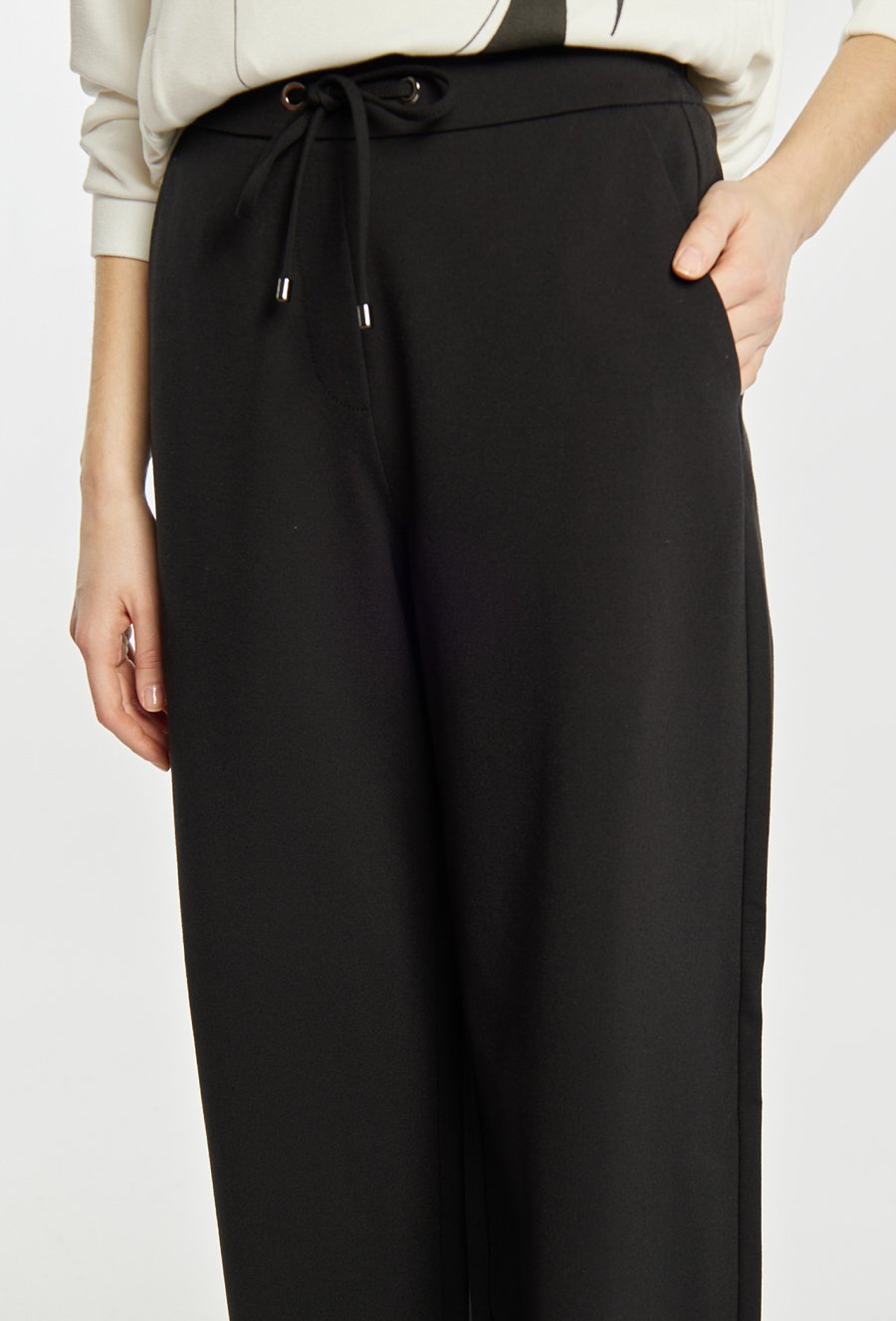 Spodnie o luźniejszym kroju z prostą nogawką oraz elastyczną talią ze sznurkiem zapewniają wygodę i swobodę ruchów. Uniwersalny fason świetnie sprawdza się na co dzień, a model można łatwo zestawiać zarówno z bluzami, jak i bardziej klasycznymi bluzkami. Modelka na zdjęciu ma 177 cm wzrostu i prezentuje rozmiar 36.