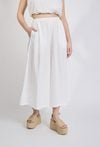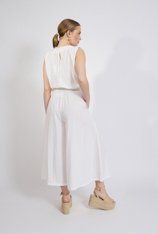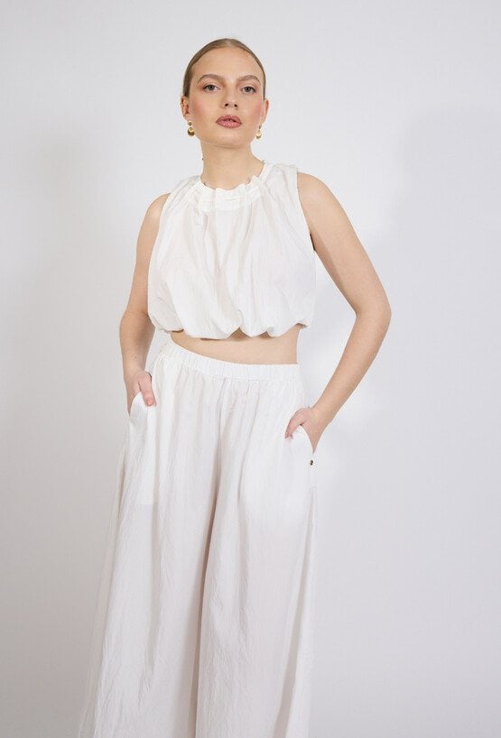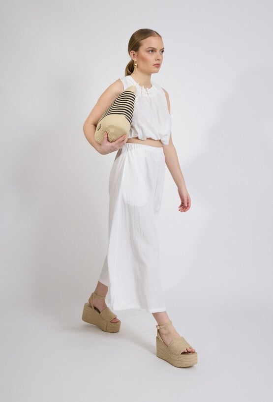 Stylowe spodnie damskie o luźnym kroju z szeroką nogawką o długości 7/8. Model z elastycznym pasem, który zapewnia wygodę i dobre dopasowanie do sylwetki. Spodnie doskonale sprawdzą się w letnich stylizacjach, na spotkania oraz wakacyjne wyjazdy, dodając stylizacji lekkości i koloru. Modelka na zdjęciu ma 177 cm wzrostu i prezentuje rozmiar 36.