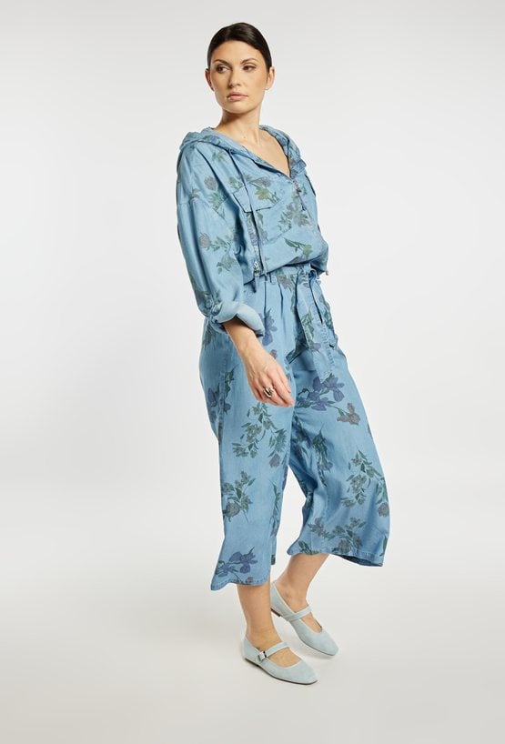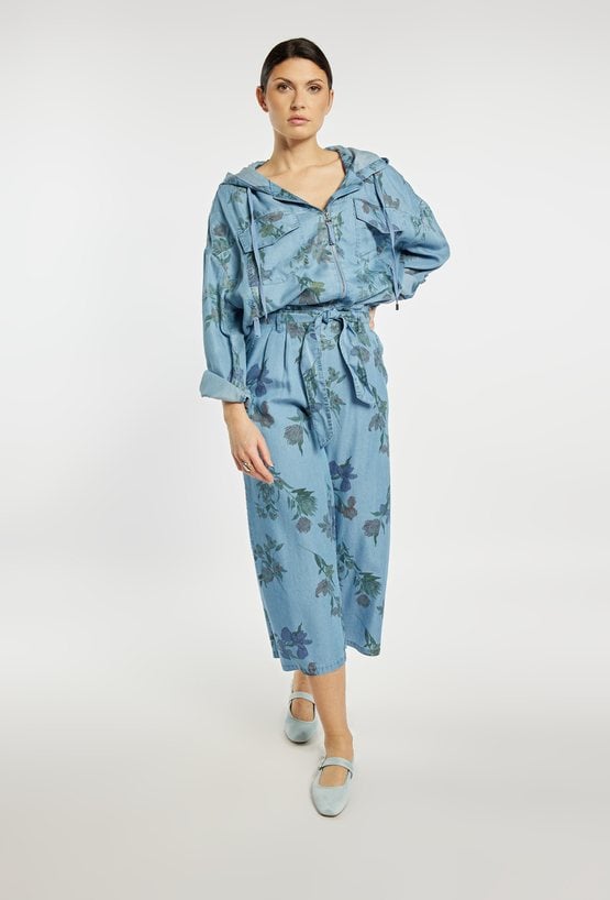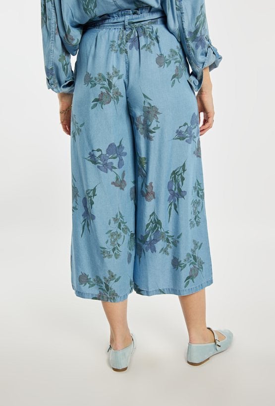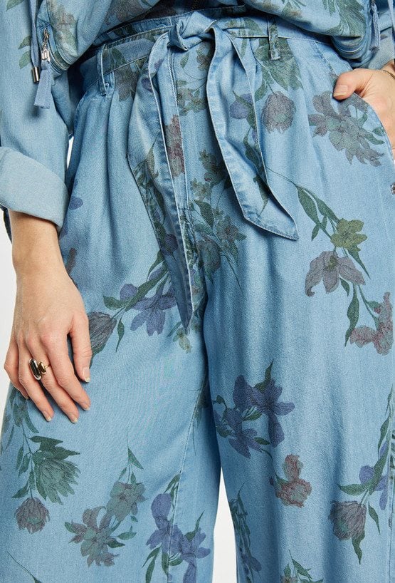 Stylowe spodnie damskie o luźnym kroju z szeroką nogawką o długości 7/8. Model z delikatnym kwiatowym wzorem oraz wiązaniem w pasie, które zapewnia wygodę i dobre dopasowanie. Spodnie doskonale sprawdzą się w codziennych i letnich stylizacjach, na spotkania oraz wakacyjne wyjazdy. Modelka na zdjęciu ma 177 cm wzrostu i prezentuje rozmiar 36.