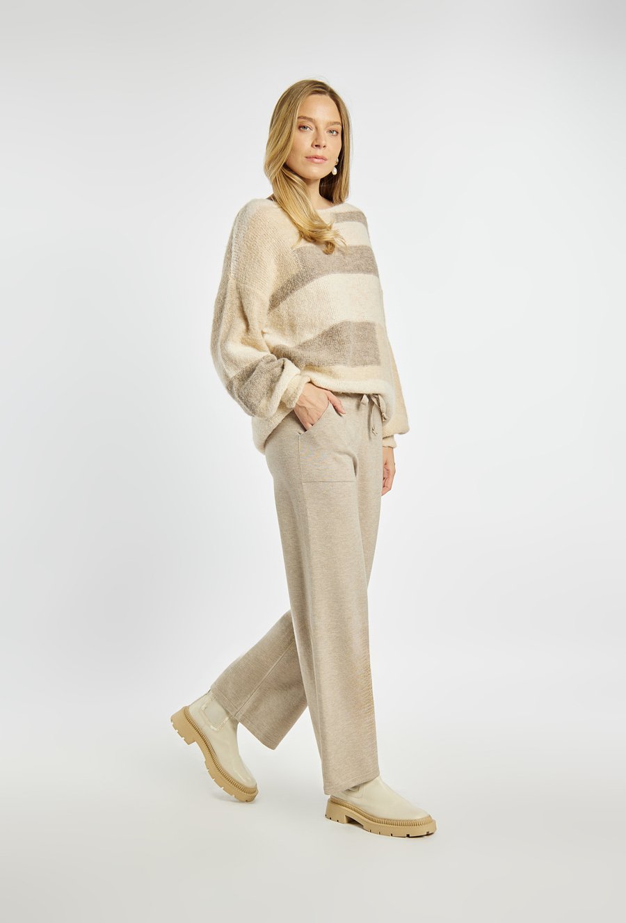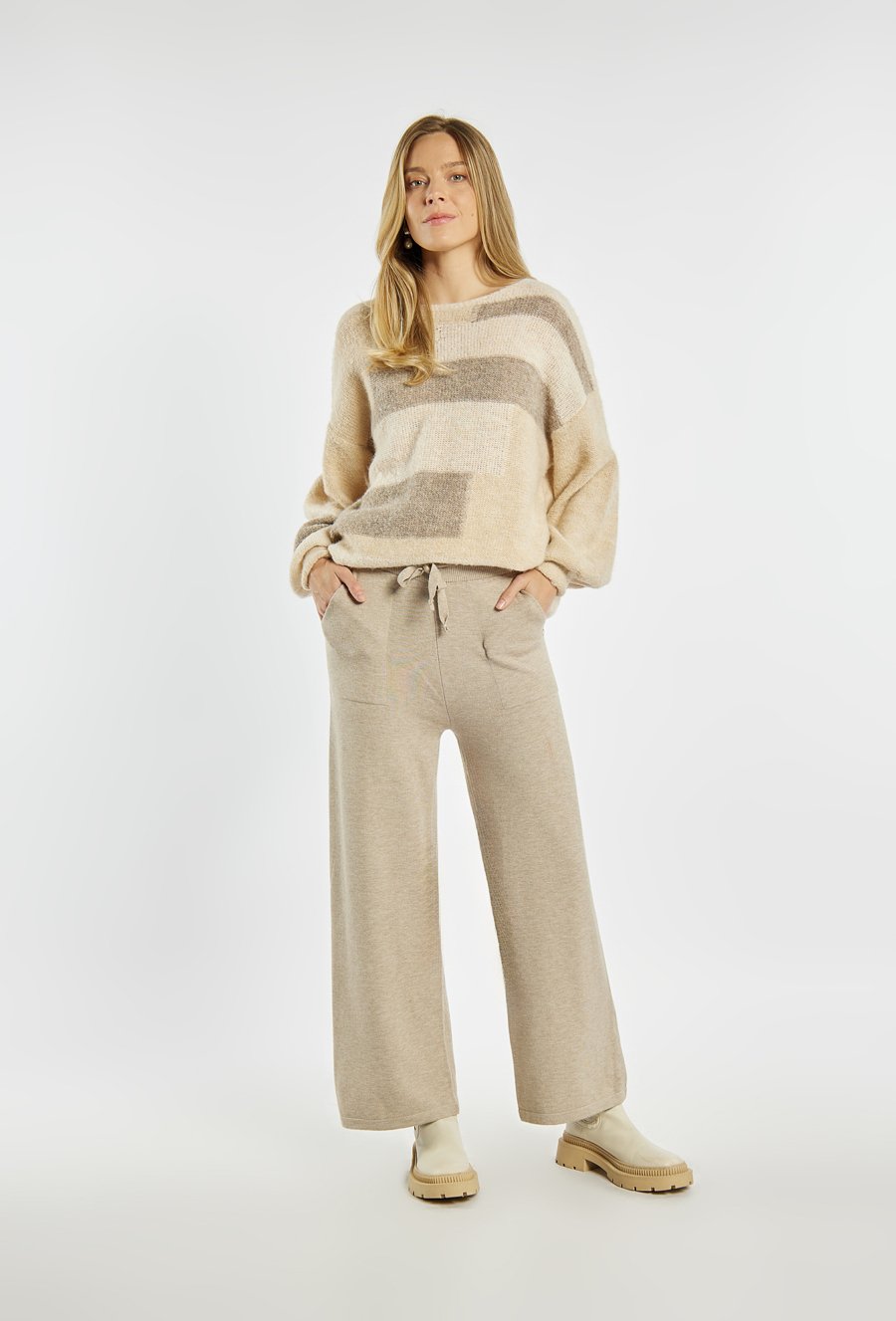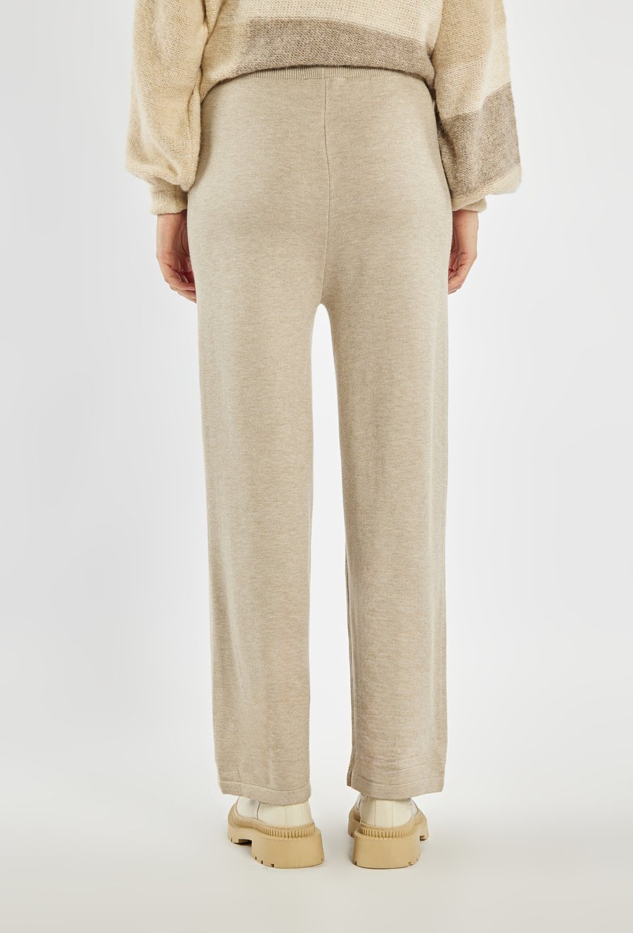 Spodnie o swobodnym fasonie z szerokimi nogawkami. W pasie elastyczna guma ze sznurkiem do regulacji, co zapewnia wygodne dopasowanie. Z przodu znajdują się praktyczne kieszenie. Modelka na zdjęciu ma 177 cm wzrostu i prezentuje rozmiar S/M.