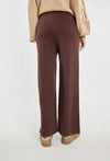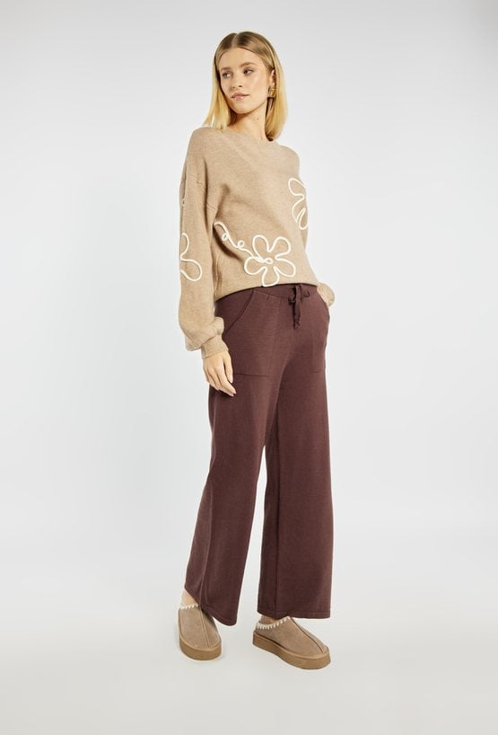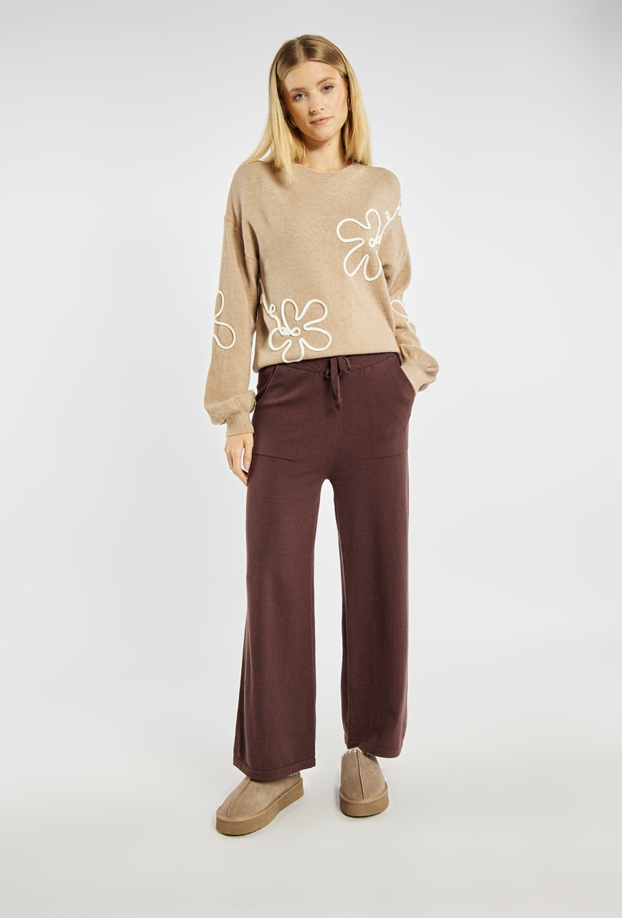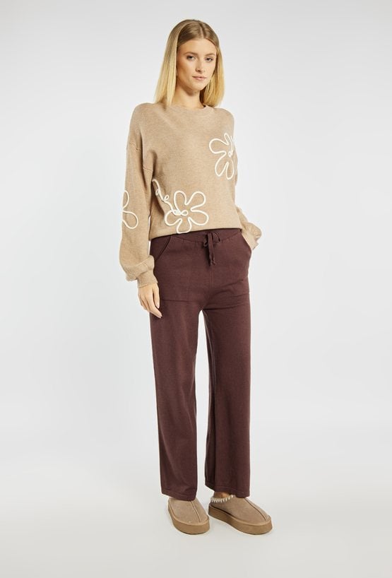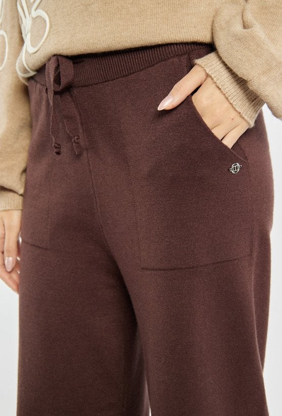 Spodnie o swobodnym fasonie z szerokimi nogawkami. W pasie elastyczna guma ze sznurkiem do regulacji, co zapewnia wygodne dopasowanie. Z przodu znajdują się praktyczne kieszenie. Modelka na zdjęciu ma 177 cm wzrostu i prezentuje rozmiar S/M.
