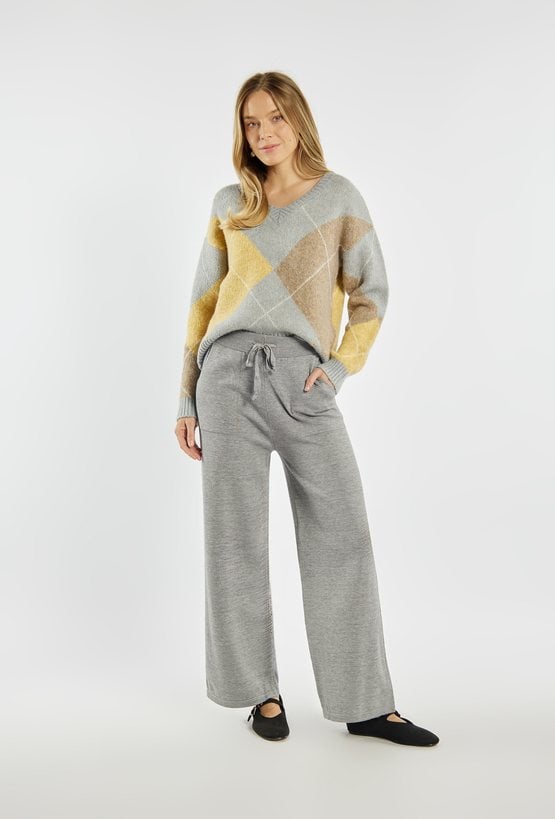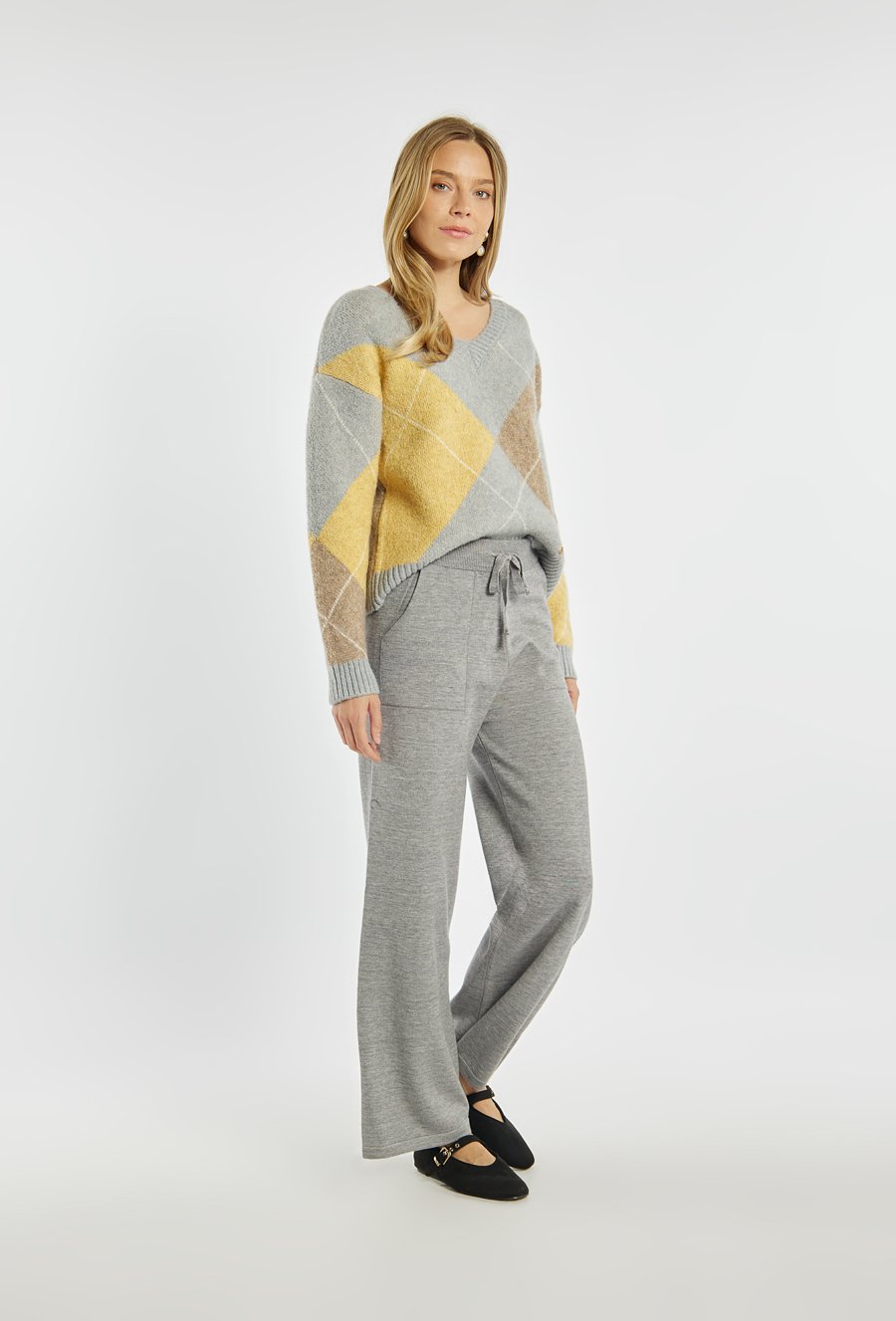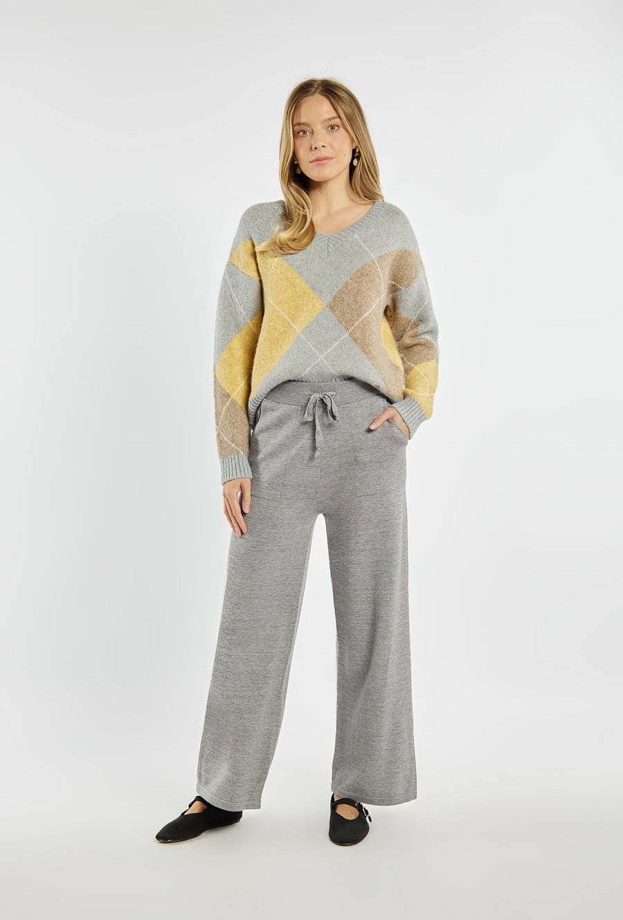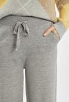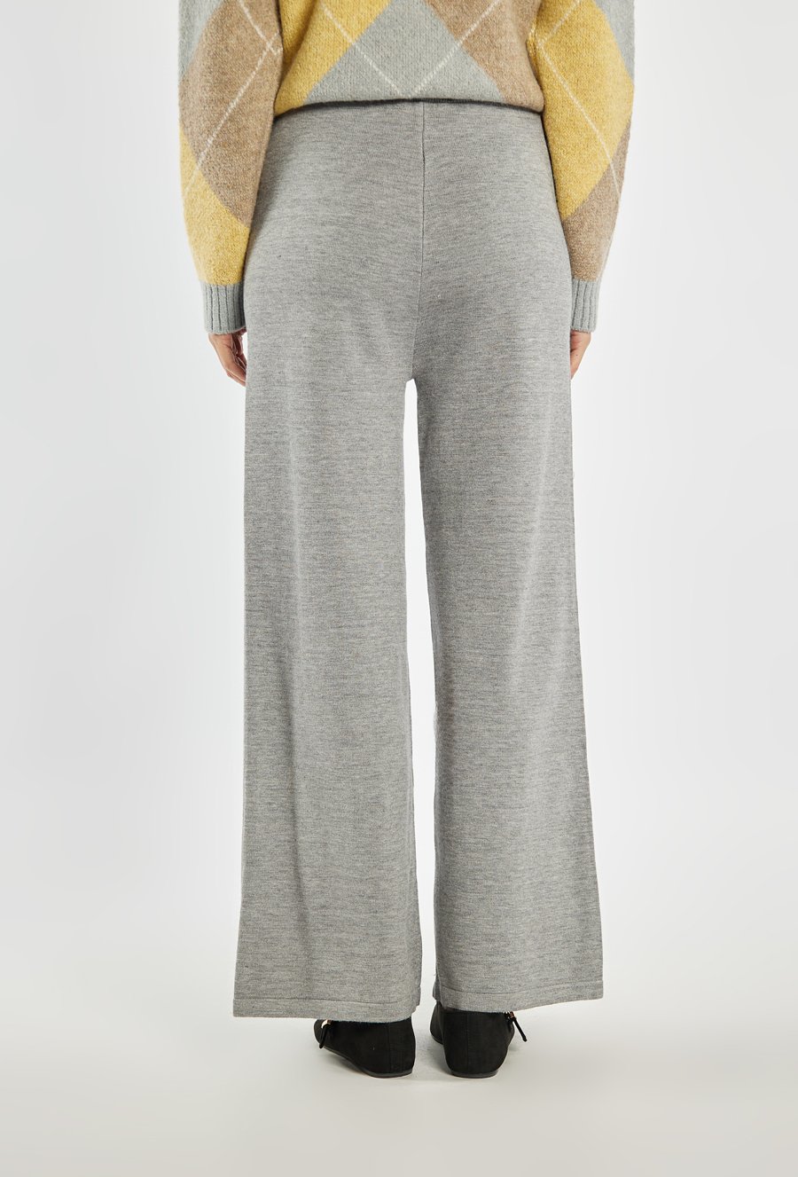 Spodnie o swobodnym fasonie z szerokimi nogawkami. W pasie elastyczna guma ze sznurkiem do regulacji, co zapewnia wygodne dopasowanie. Z przodu znajdują się praktyczne kieszenie. Modelka na zdjęciu ma 177 cm wzrostu i prezentuje rozmiar S/M.