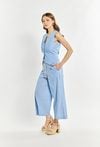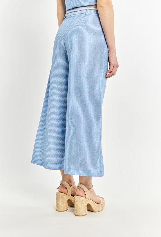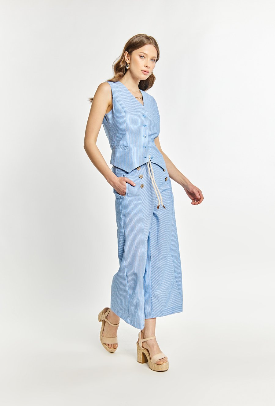 Materiałowe spodnie damskie wykonane z lekkiej bawełny. Spodnie z długimi, szerokimi nogawkami, kieszeniami oraz szlufkami w pasie z wiązaniem. Spodnie z przodu zdobione są guzikami. Model ten zapinany jest z boku na kryty suwak. W tych spodniach poczujesz się wyjątkowo i stylowo. Modelka prezentuje produkt w rozmiarze S. Wzrost modelki: 177 cm
