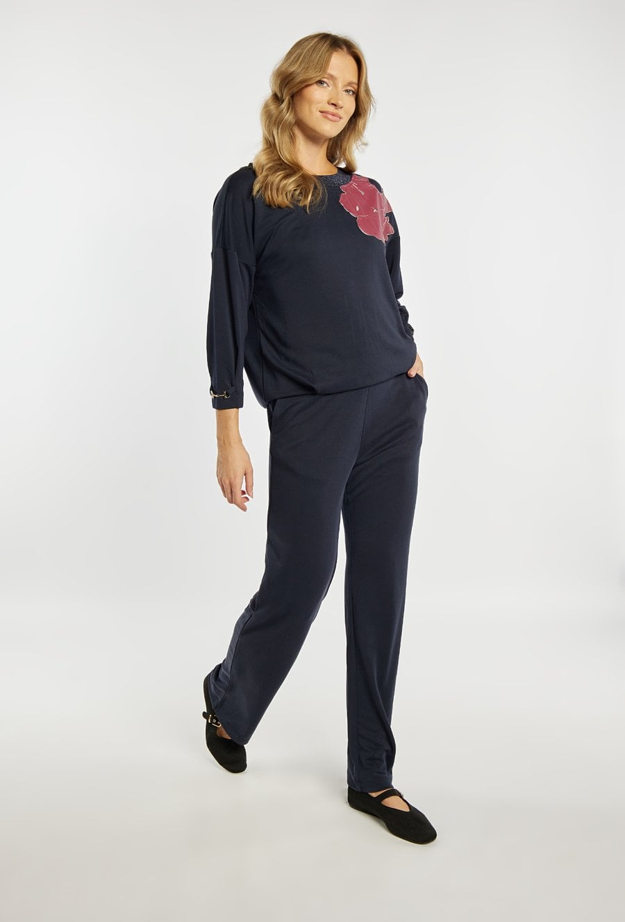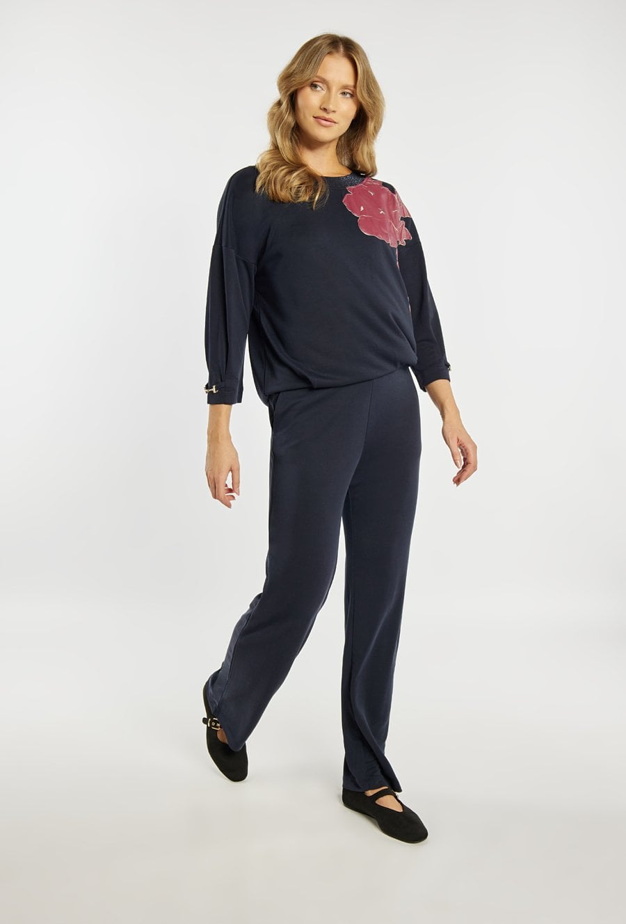 Spodnie damskie o luźnym, komfortowym kroju. Model z prostą, szeroką nogawką oraz elastycznym pasem, który zapewnia wygodne dopasowanie do sylwetki. Po bokach znajdują się praktyczne kieszenie, a ozdobny detal przy pasie nadaje całości stylowego charakteru. Model można zestawić z pasującą bluzą z tej samej linii, tworząc modny i spójny komplet. Kod do bluzy: 26W-JUM0360. Modelka na zdjęciu ma 177 cm wzrostu i prezentuje rozmiar S.