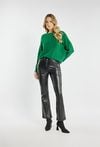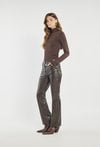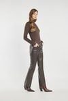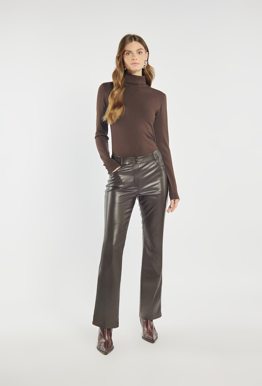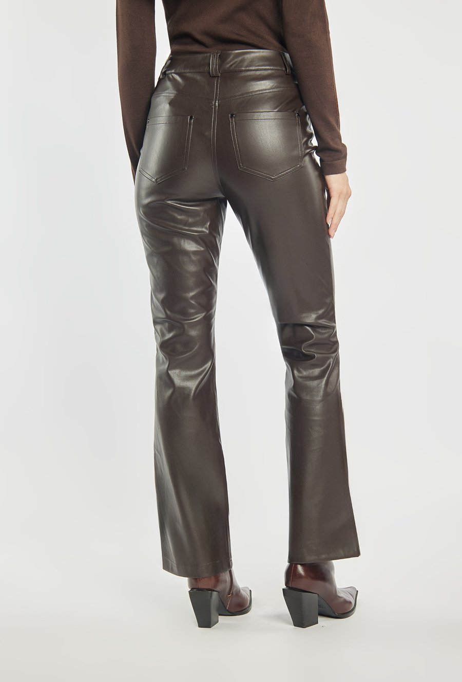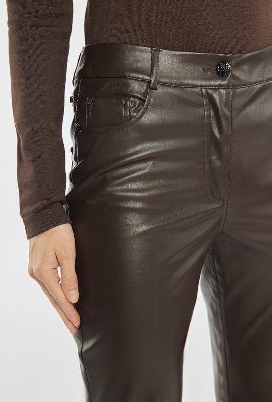 Spodnie damskie z efektem skóry, o lekko rozszerzanej nogawce. Klasyczny krój z zapięciem na guzik i zamek łączy elegancję z nowoczesnym stylem. Doskonałe do stylizacji na co dzień i na wieczór. Modelka na zdjęciu ma 177 cm wzrostu i prezentuje rozmiar 36.
