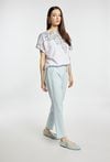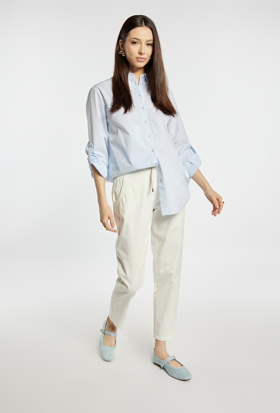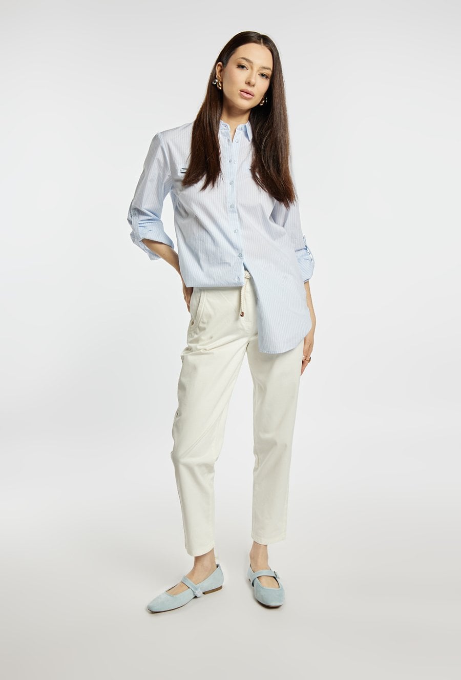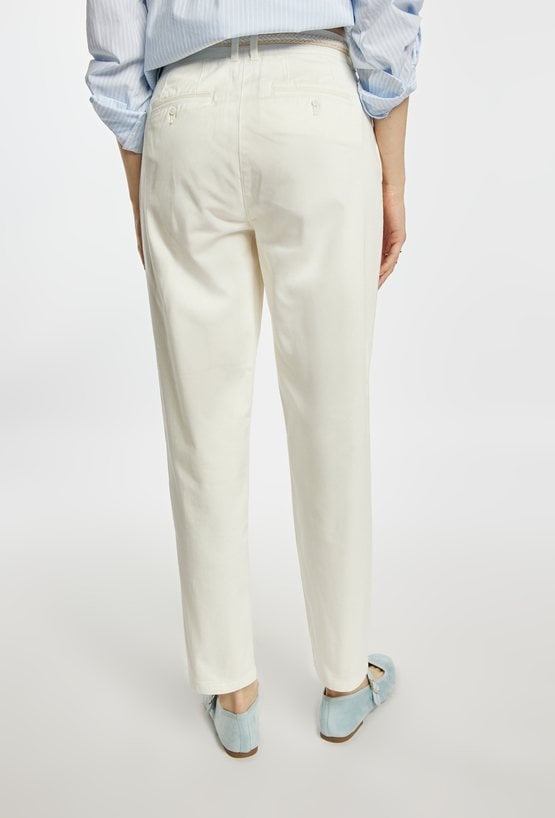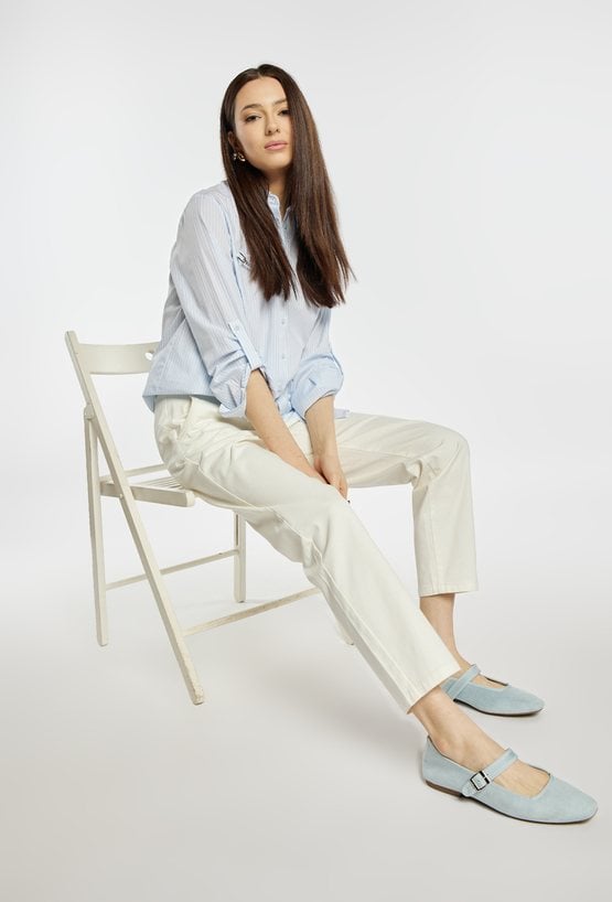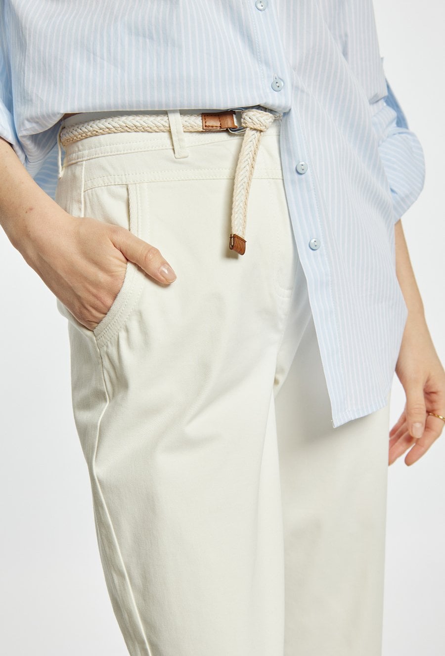 Spodnie o prostym, klasycznym kroju, wykonane z lekkiego materiału w jasnej, pastelowej kolorystyce. Model z wygodnym stanem i prostą nogawką, która subtelnie wydłuża sylwetkę. W komplecie znajduje się pleciony pasek, który podkreśla talię i dodaje całości casualowego charakteru. Modelka na zdjęciu ma 177 cm wzrostu i prezentuje rozmiar 36.