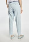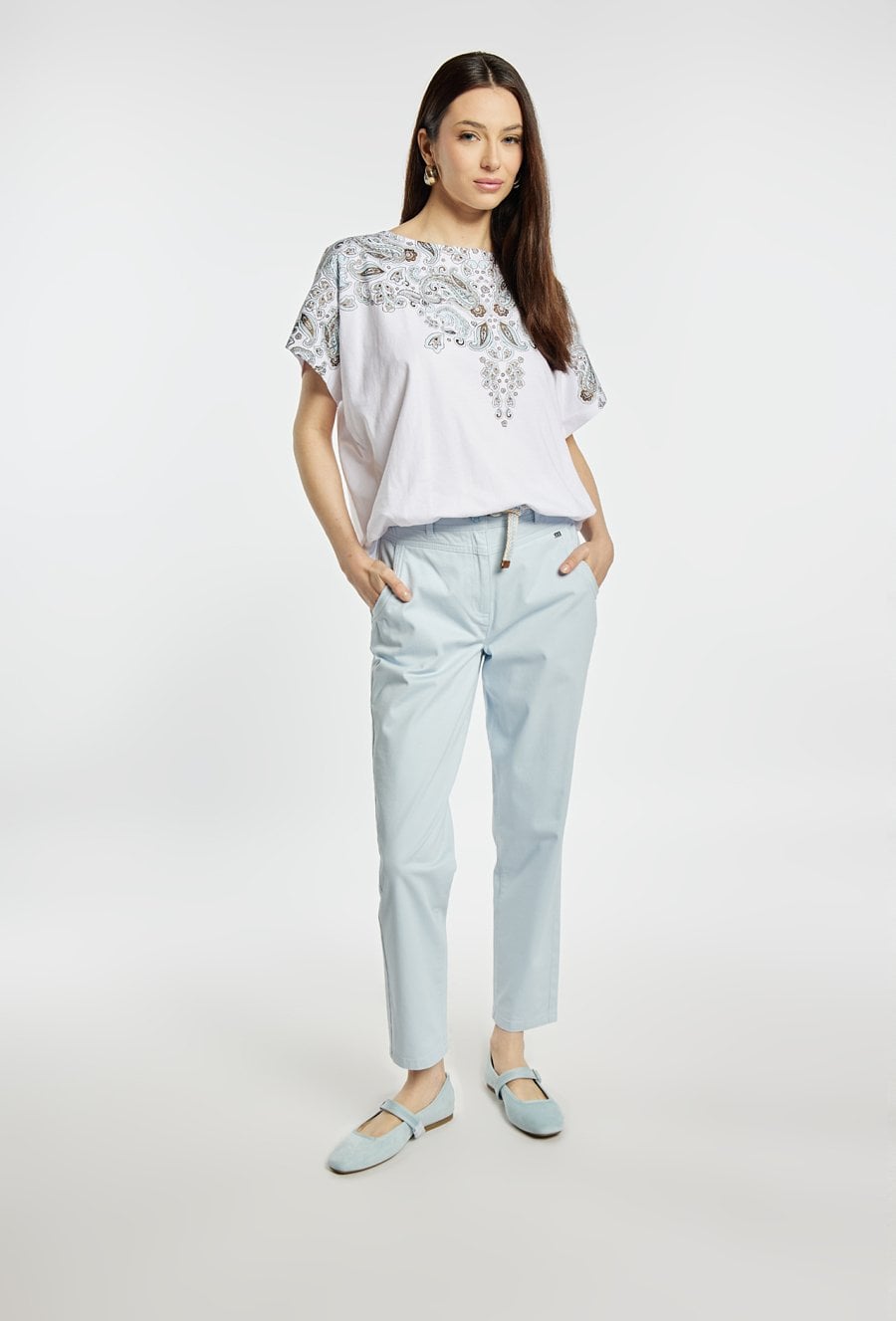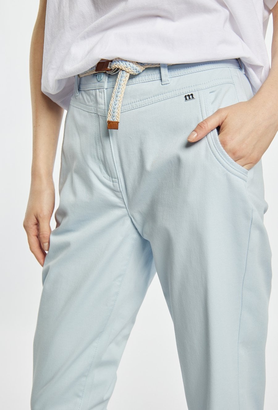 Spodnie o prostym, klasycznym kroju, wykonane z lekkiego materiału w jasnej, pastelowej kolorystyce. Model z wygodnym stanem i prostą nogawką, która subtelnie wydłuża sylwetkę. W komplecie znajduje się pleciony pasek, który podkreśla talię i dodaje całości casualowego charakteru. Modelka na zdjęciu ma 177 cm wzrostu i prezentuje rozmiar 36.