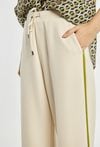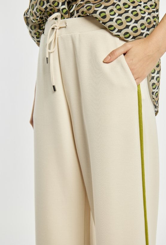 Spodnie damskie o swobodnym, szerokim kroju. Spodnie mają elastyczną talię z troczkami, praktyczne kieszenie oraz dekoracyjne lampasy biegnące wzdłuż nogawek. Spodnie zapewniają wygodę i nowoczesny wygląd, idealne do codziennych stylizacji. Modelka na zdjęciu ma 177 cm wzrostu i prezentuje rozmiar S.