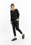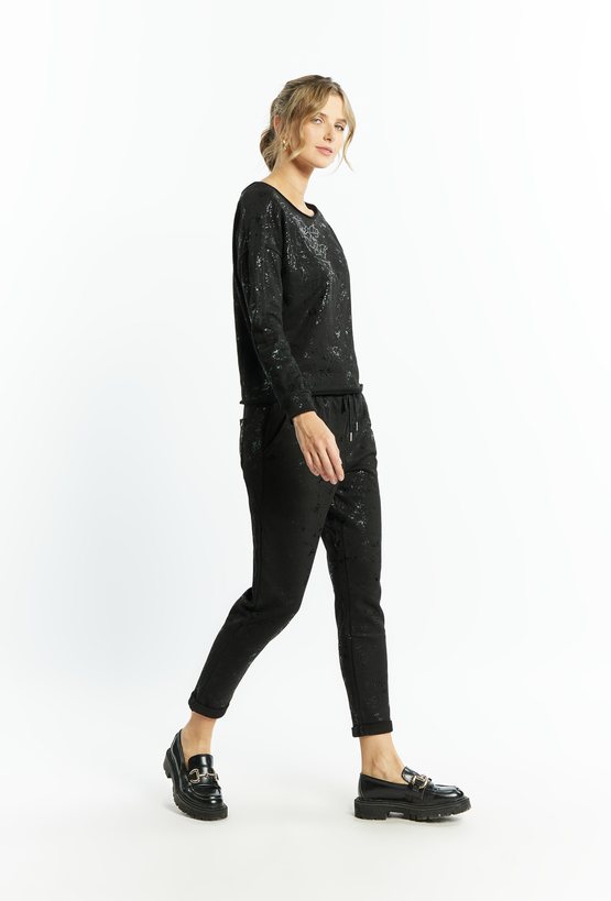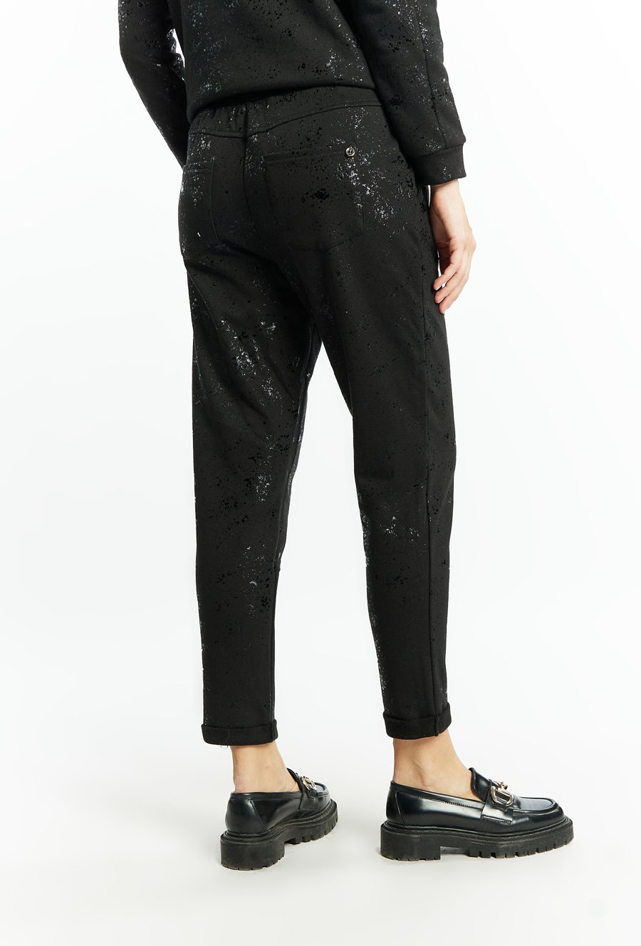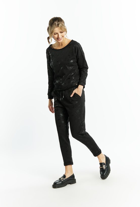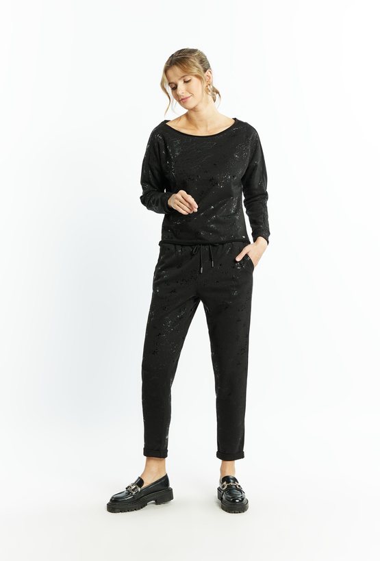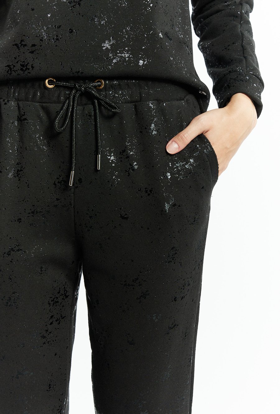 Spodnie dresowe o swobodnym fasonie, wykonane z dzianiny na bazie bawełny. Spodnie z wiązaniem oraz z elastyczną gumą w pasie. Model ten posiada dwie kieszenie wsuwane po bokach oraz dwie na tyle. Rekomendujemy górę do kompletu z tej samej linii o kodzie 23W-JUM0090-020. Modelka prezentuje rozmiar S i mierzy 177 centymetrów wzrostu.