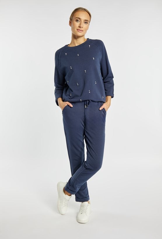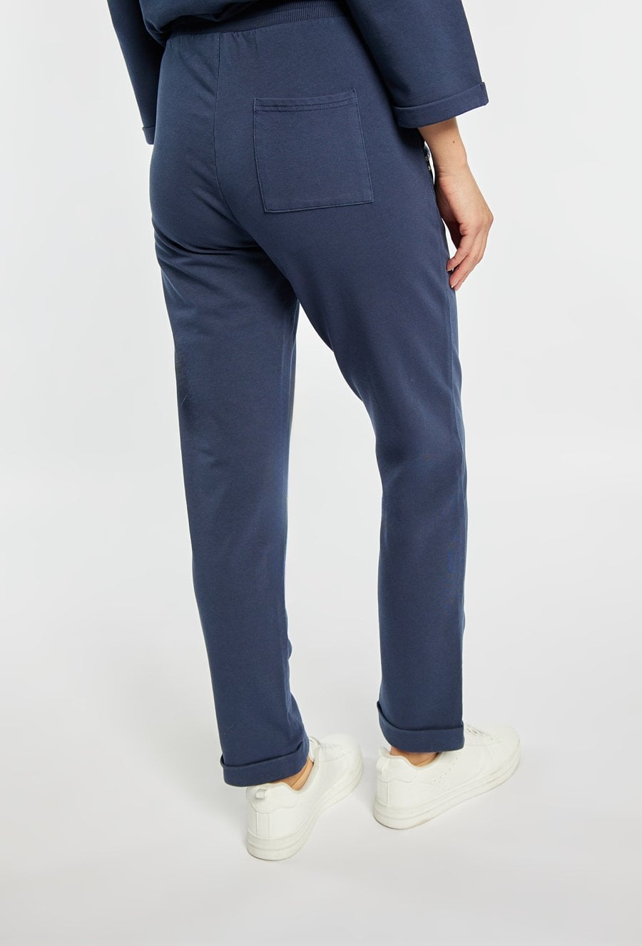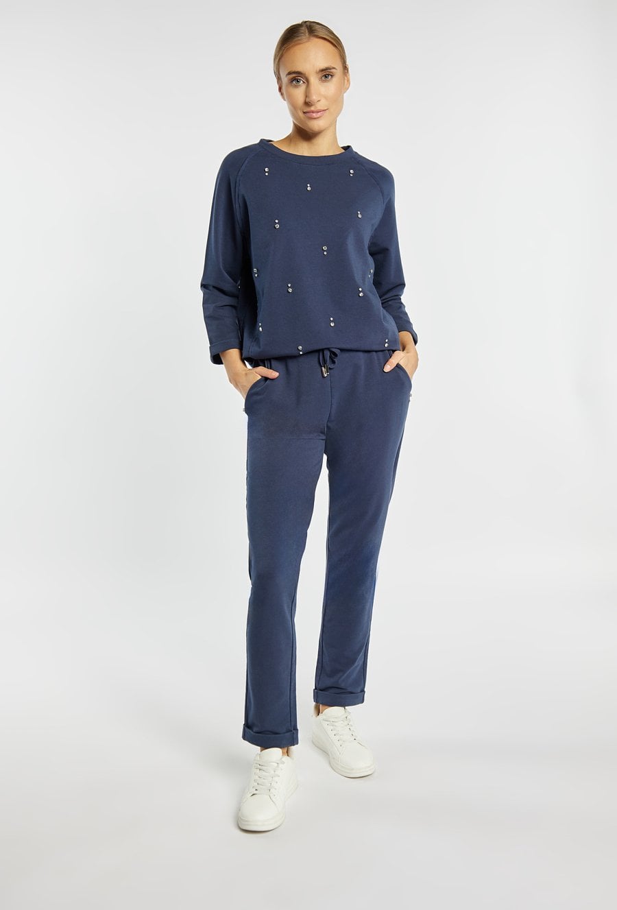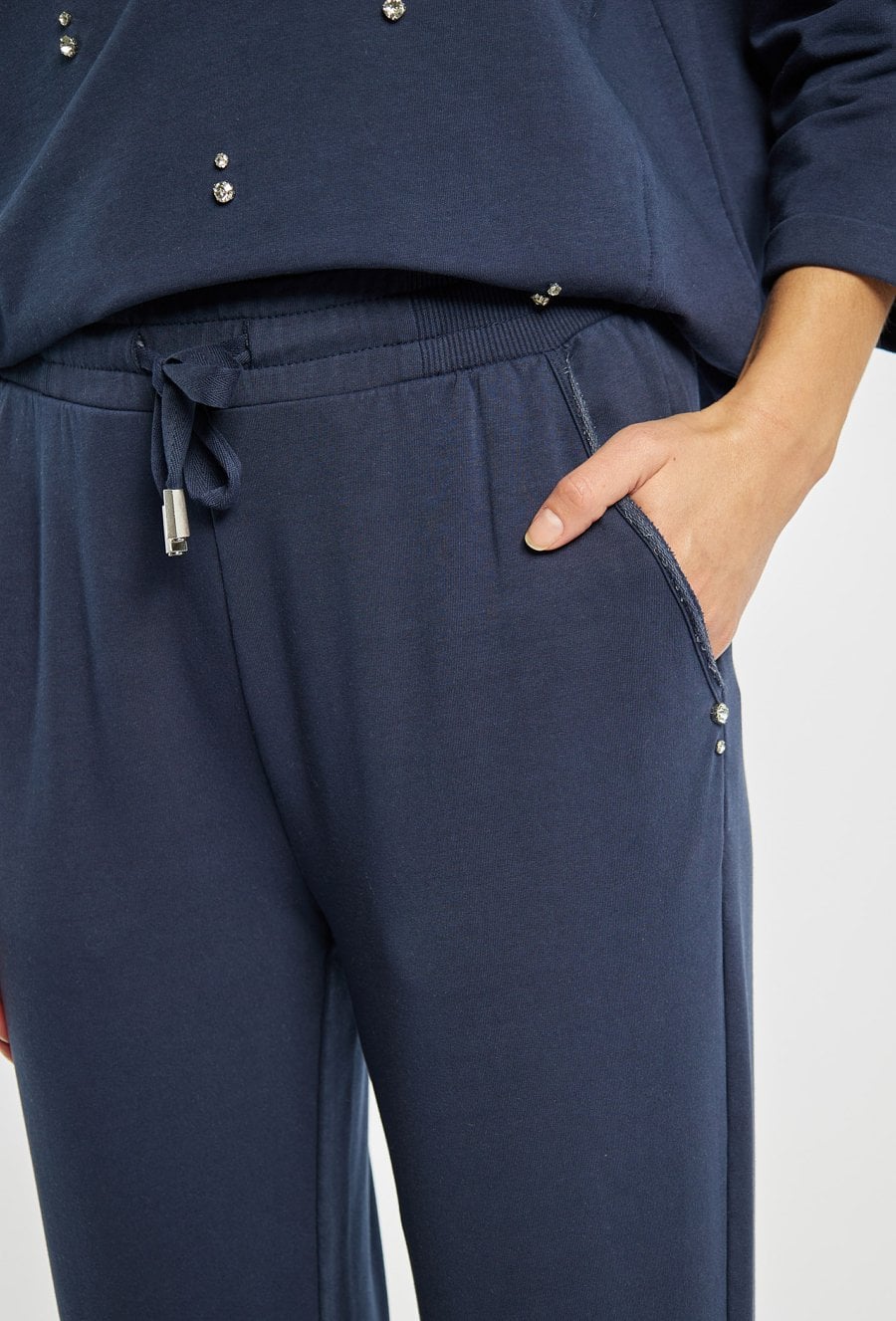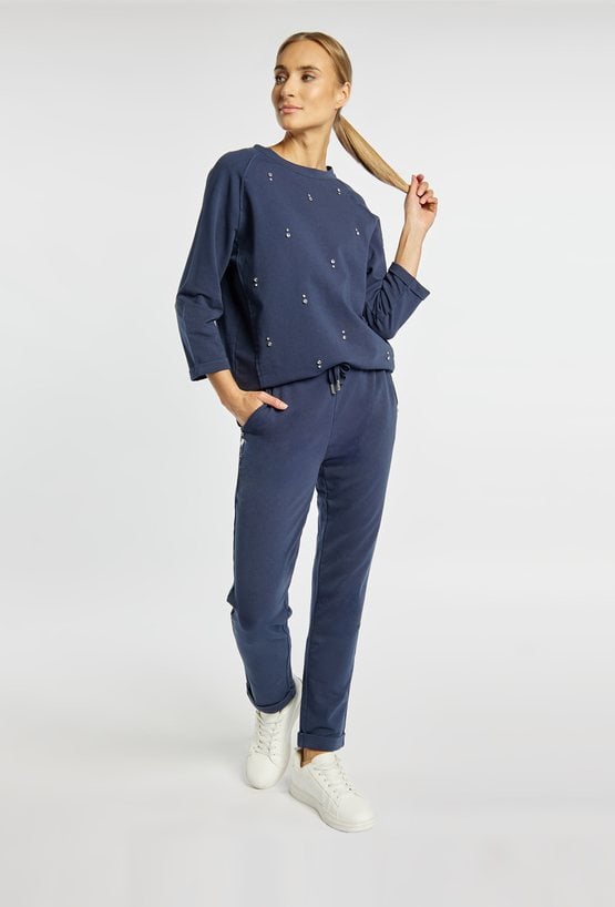 Spodnie dresowe o prostym kroju to wygodna propozycja na co dzień. Spodnie z elastyczną talią i troczkiem gwarantują komfort noszenia, a delikatne błyszczące detale przy kieszeniach dodają im subtelnej elegancji. Idealnie komponują się z pasującą bluzą, tworząc stylowy komplet. Kod do bluzy: 26W-JUM0040. Modelka na zdjęciu ma 177 cm wzrostu i prezentuje rozmiar S.