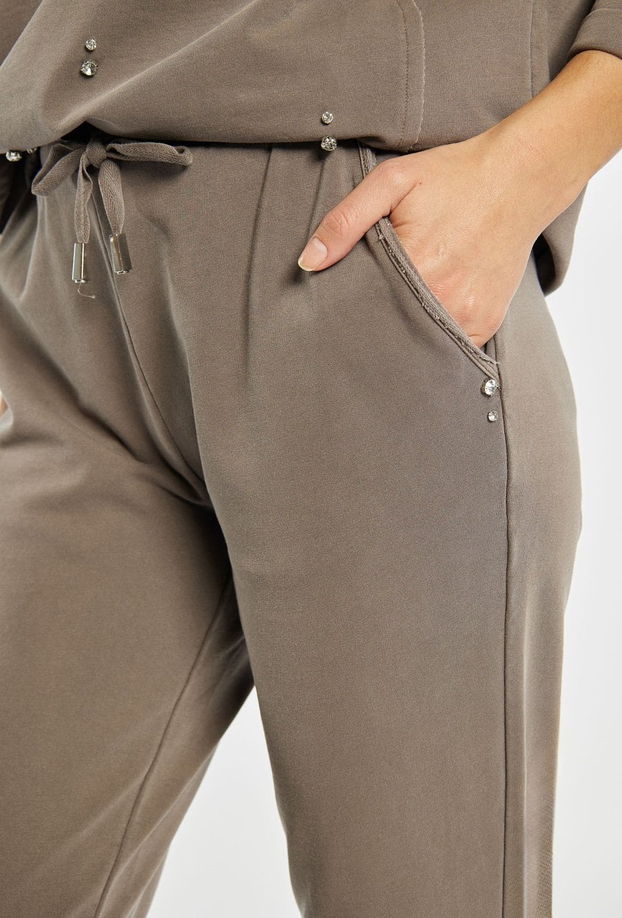 Spodnie dresowe o prostym kroju to wygodna propozycja na co dzień. Spodnie z elastyczną talią i troczkiem gwarantują komfort noszenia, a delikatne błyszczące detale przy kieszeniach dodają im subtelnej elegancji. Idealnie komponują się z pasującą bluzą, tworząc stylowy komplet. Kod do bluzy: 26W-JUM0040. Modelka na zdjęciu ma 177 cm wzrostu i prezentuje rozmiar S.