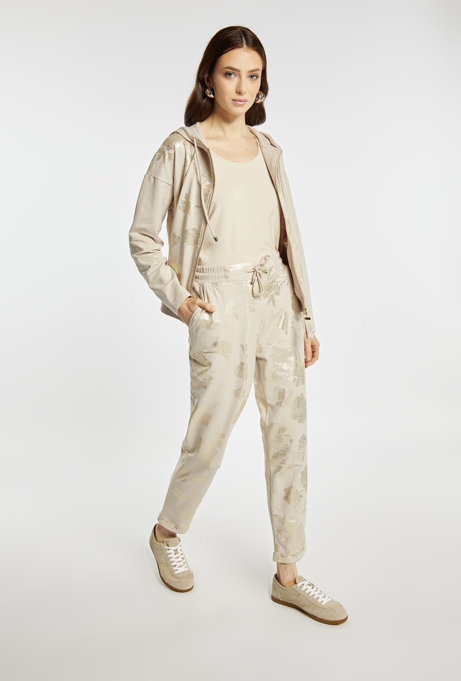 Spodnie dresowe o wygodnym, luźnym fasonie, z elastyczną talią regulowaną troczkiem i praktycznymi kieszeniami po bokach. Model wyróżnia się delikatnym, dekoracyjnym wzorem, który nadaje całości subtelnego charakteru. Nogawki o swobodnej linii zapewniają komfort noszenia na co dzień. Spodnie można zestawić z pasującą bluzą, tworząc spójny i stylowy komplet. Kod do bluzy: 26W-JUM0390 lub 26W-JUM0380. Modelka na zdjęciu ma 177 cm wzrostu i prezentuje rozmiar S.