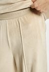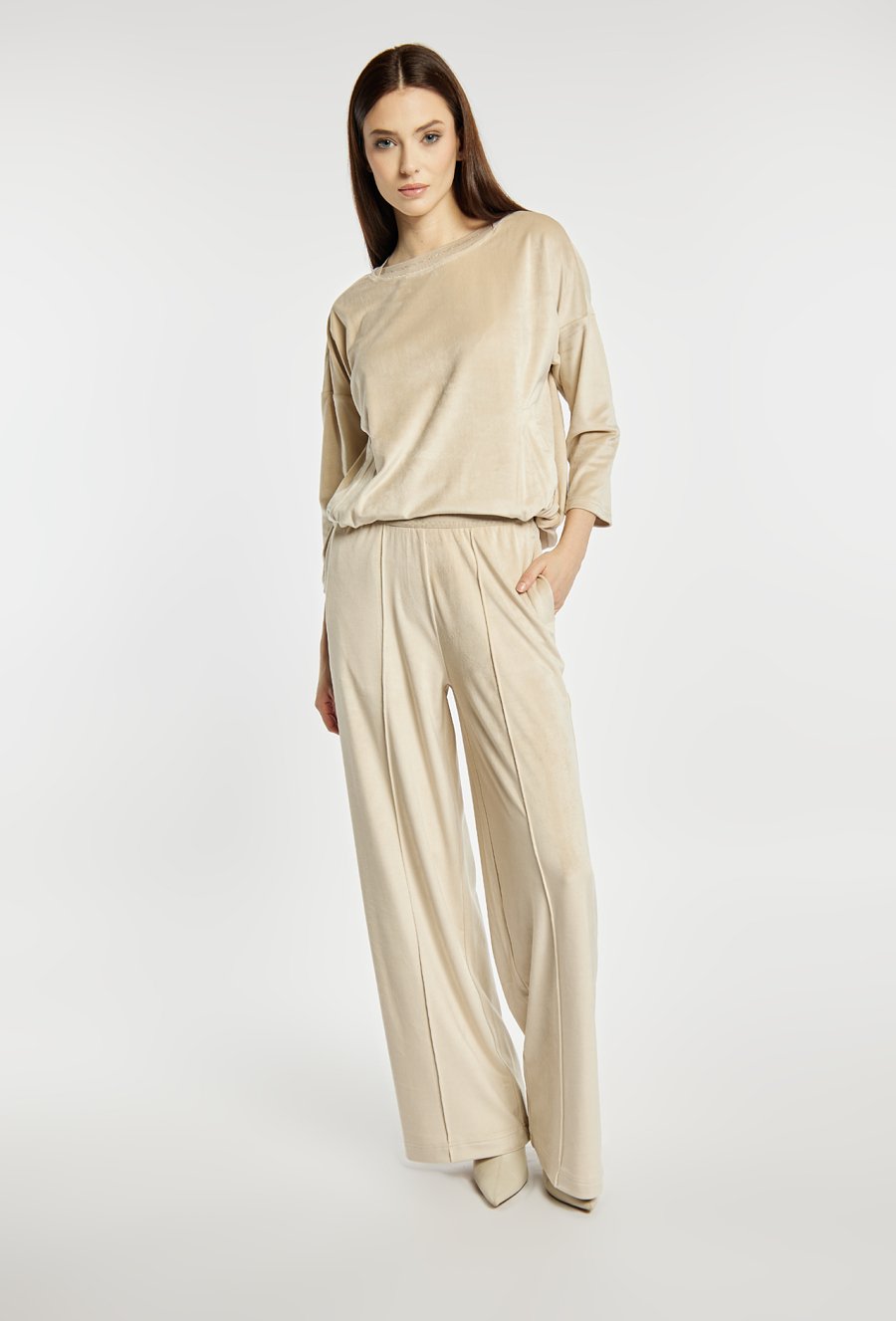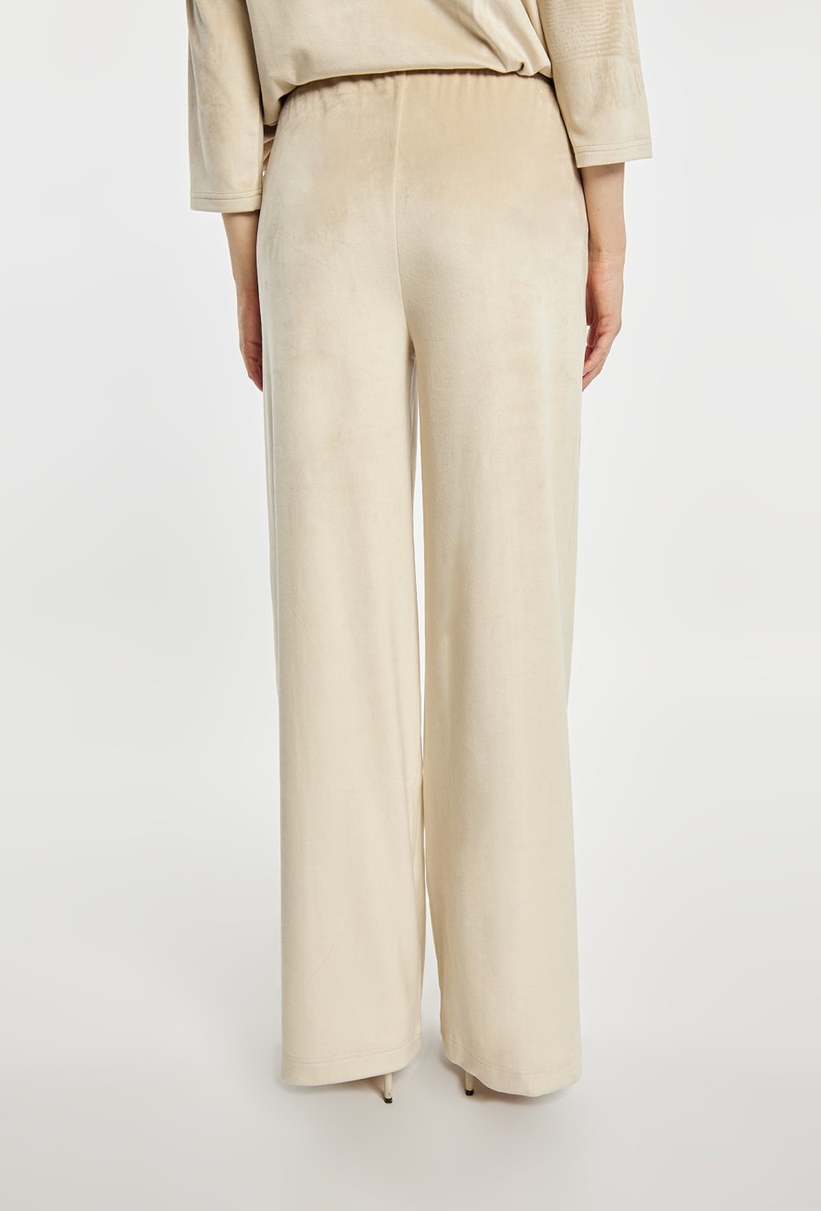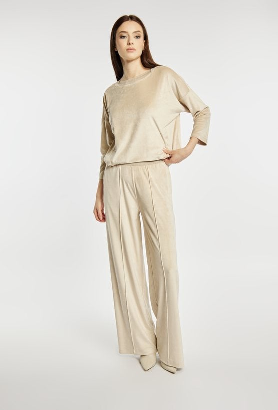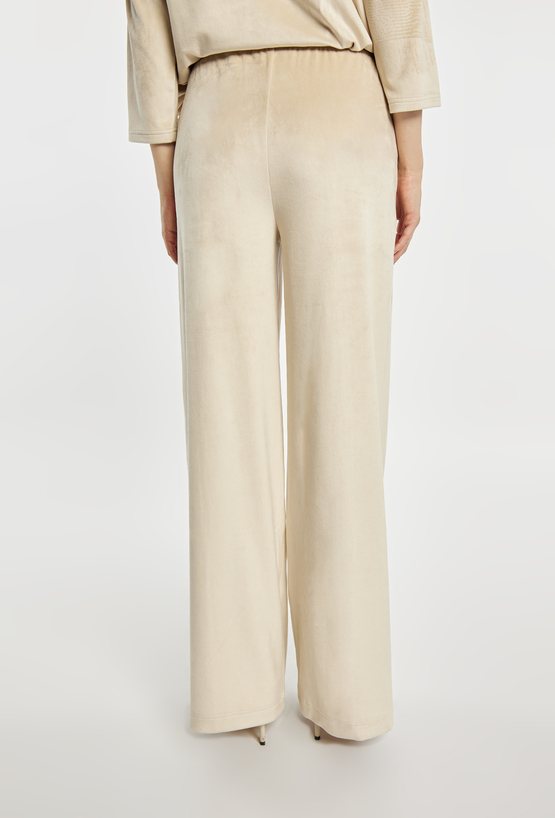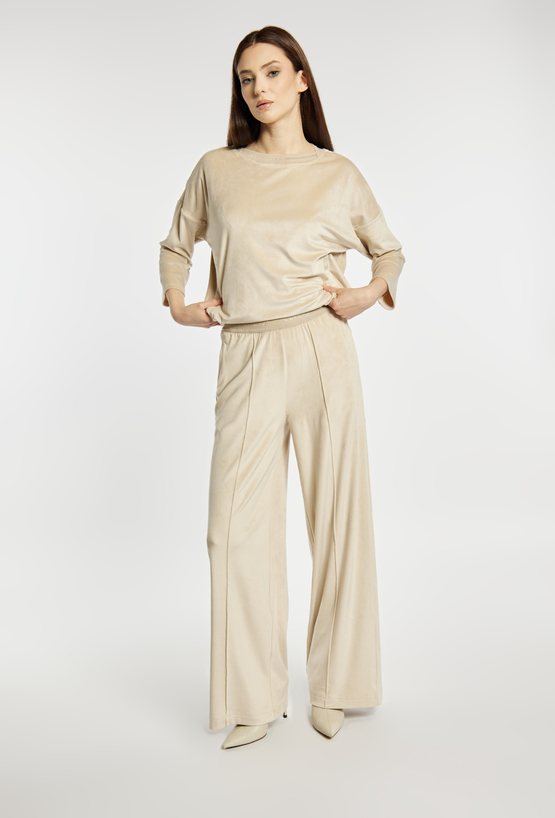 Spodnie o szerokiej, długiej nogawce wykonane z miękkiej, przyjemnej w dotyku tkaniny welurowej. Elastyczna gumka w pasie z napisem „LUXURY” dodaje wygody i subtelnego, modowego akcentu. Model idealny do eleganckich, jak i bardziej swobodnych stylizacji. Modelka na zdjęciu ma 177 cm wzrostu i prezentuje rozmiar S.