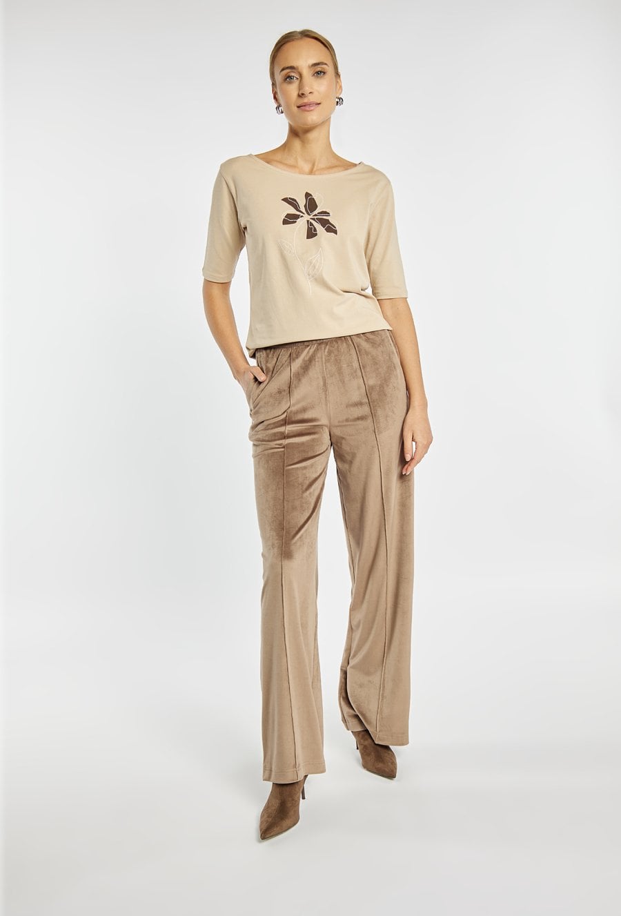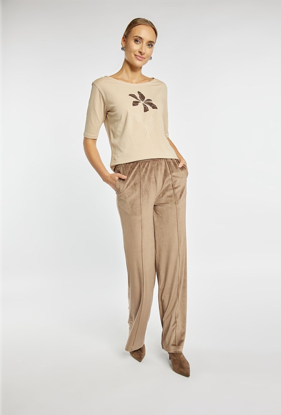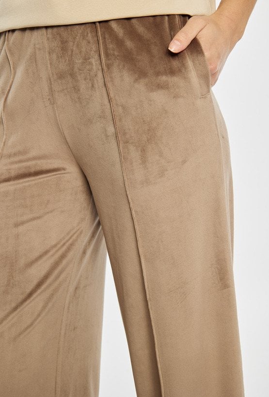 Spodnie o szerokiej, długiej nogawce wykonane z miękkiej, przyjemnej w dotyku tkaniny welurowej. Elastyczna gumka w pasie z napisem „LUXURY” dodaje wygody i subtelnego, modowego akcentu. Model idealny do eleganckich, jak i bardziej swobodnych stylizacji. Modelka na zdjęciu ma 177 cm wzrostu i prezentuje rozmiar S.