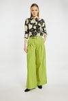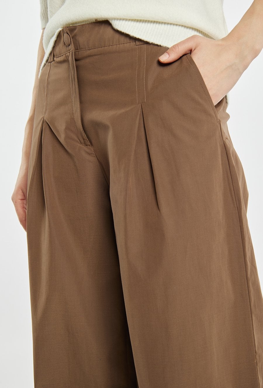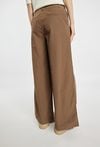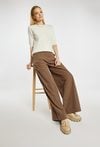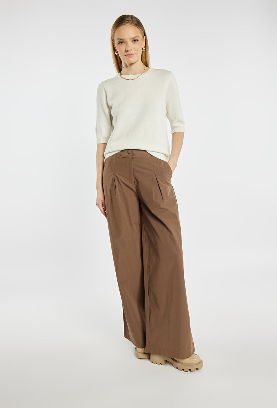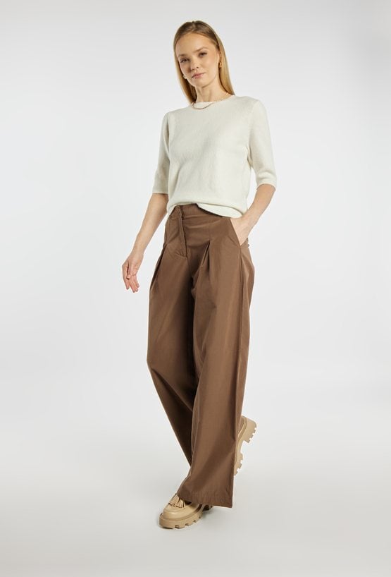 Spodnie o luźnym kroju z długą nogawką, o prostej, swobodnie opadającej linii. Model z wyższym stanem, zapinany na guzik i zamek, z praktycznymi kieszeniami. Nogawki szerokie i komfortowe, nadające całości nowoczesny, casualowy charakter. Idealne do codziennych stylizacji, dobrze komponują się zarówno ze swetrem, jak i prostą bluzką. Modelka na zdjęciu ma 177 cm wzrostu i prezentuje rozmiar 36.