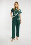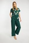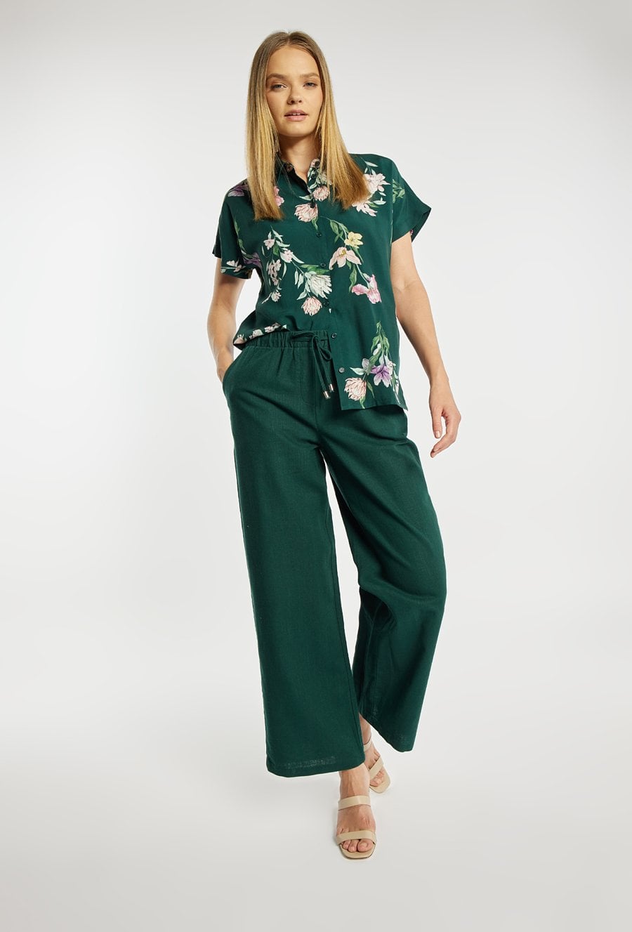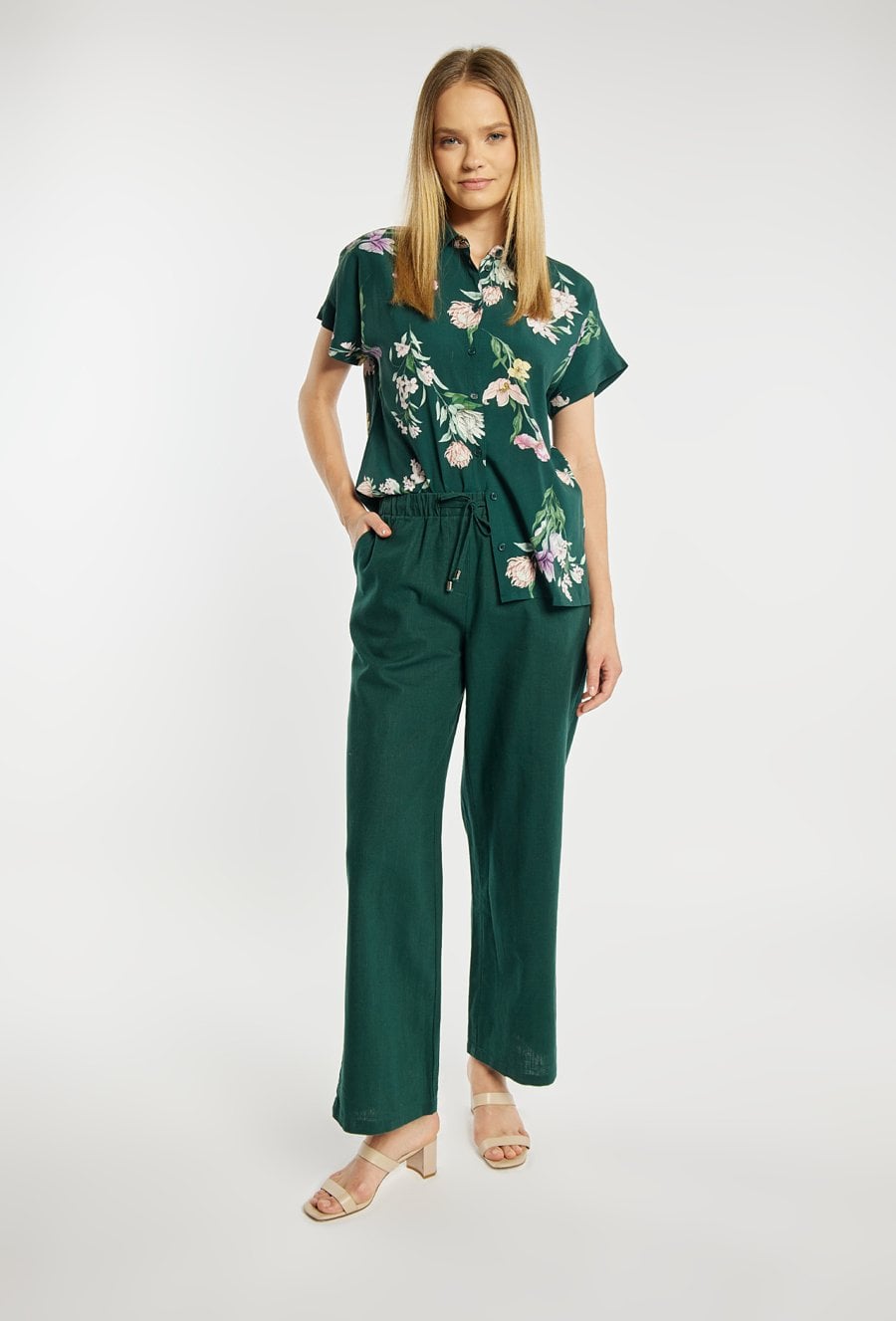 Spodnie damskie o luźnym, prostym kroju z szeroką nogawką. Model z wysokim stanem oraz elastycznym pasem z wiązaniem, który zapewnia wygodne dopasowanie i podkreśla talię. Gładki, lekki materiał nadaje całości swobodnego, letniego charakteru. Modelka na zdjęciu ma 177 cm wzrostu i prezentuje rozmiar 36.