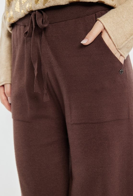 Spodnie z szeroką nogawką i elastyczną talią wiązaną na sznurek, łączące wygodę z nowoczesnym stylem. Miękki materiał zapewnia komfort noszenia, a uniwersalny fason sprawia, że doskonale komponują się zarówno z bluzami, jak i eleganckimi swetrami. Idealne do codziennych, luźnych stylizacji o modnym charakterze. Modelka na zdjęciu ma 177 cm wzrostu i prezentuje rozmiar S/M.