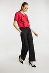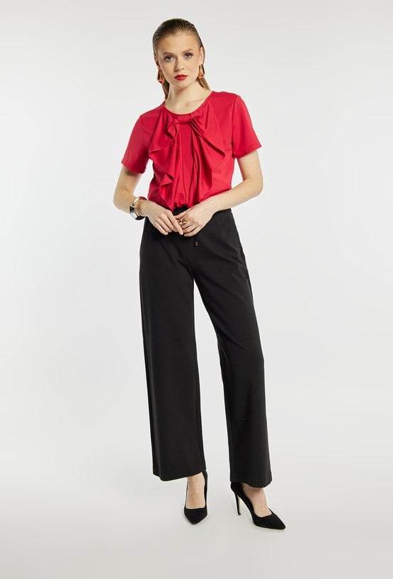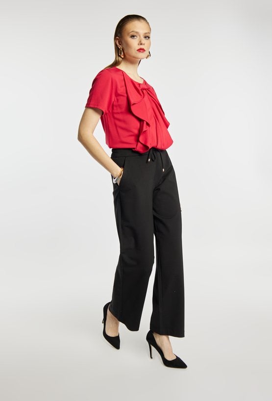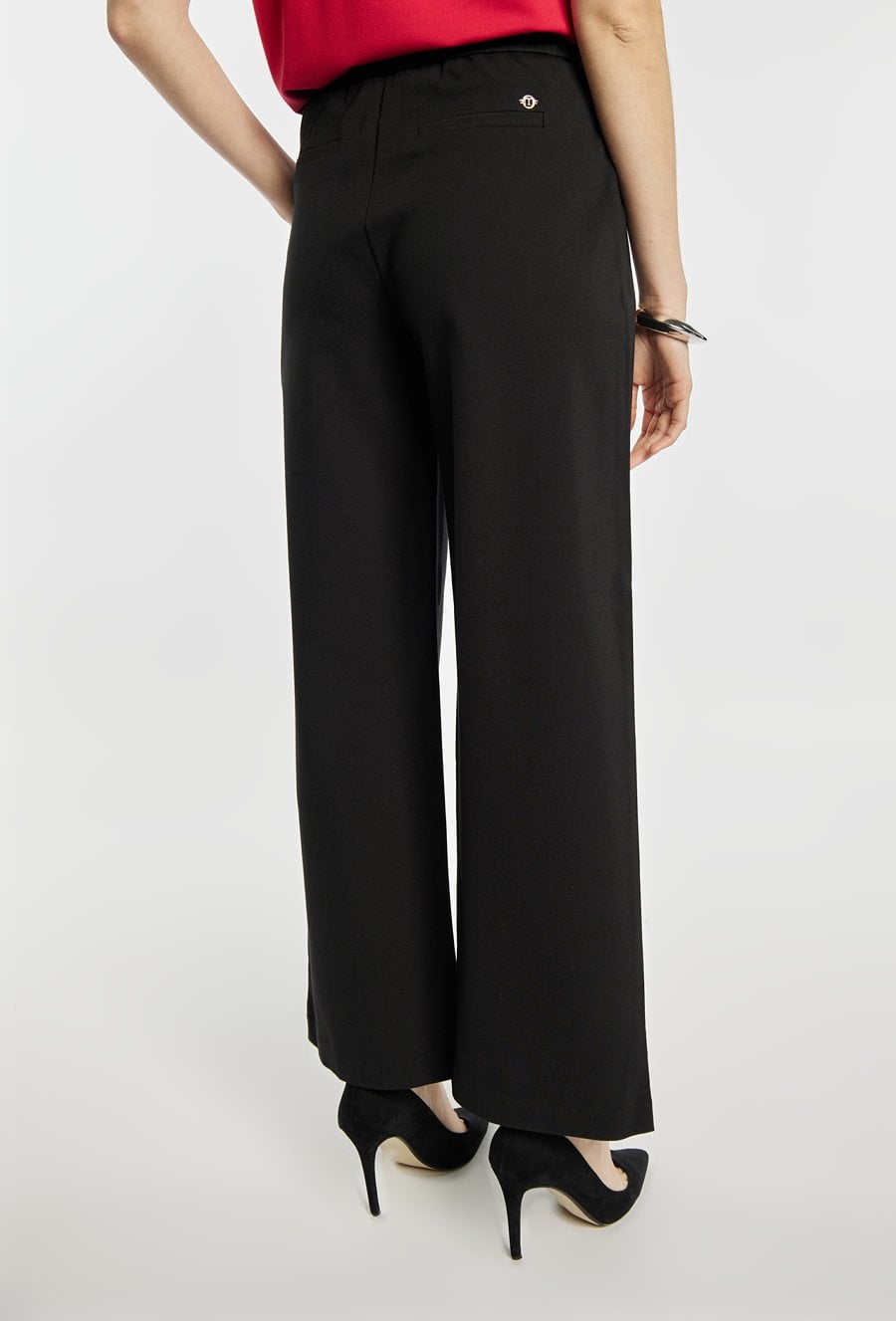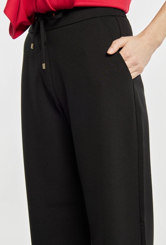 Spodnie o prostej, szerokiej nogawce i elastycznej talii z wiązaniem zapewniają wygodę oraz swobodę noszenia. Model świetnie sprawdzi się zarówno w codziennych stylizacjach, jak i w bardziej eleganckim wydaniu, np. z koszulą lub bluzką. Modelka na zdjęciu ma 177 cm wzrostu i prezentuje rozmiar 36.
