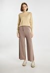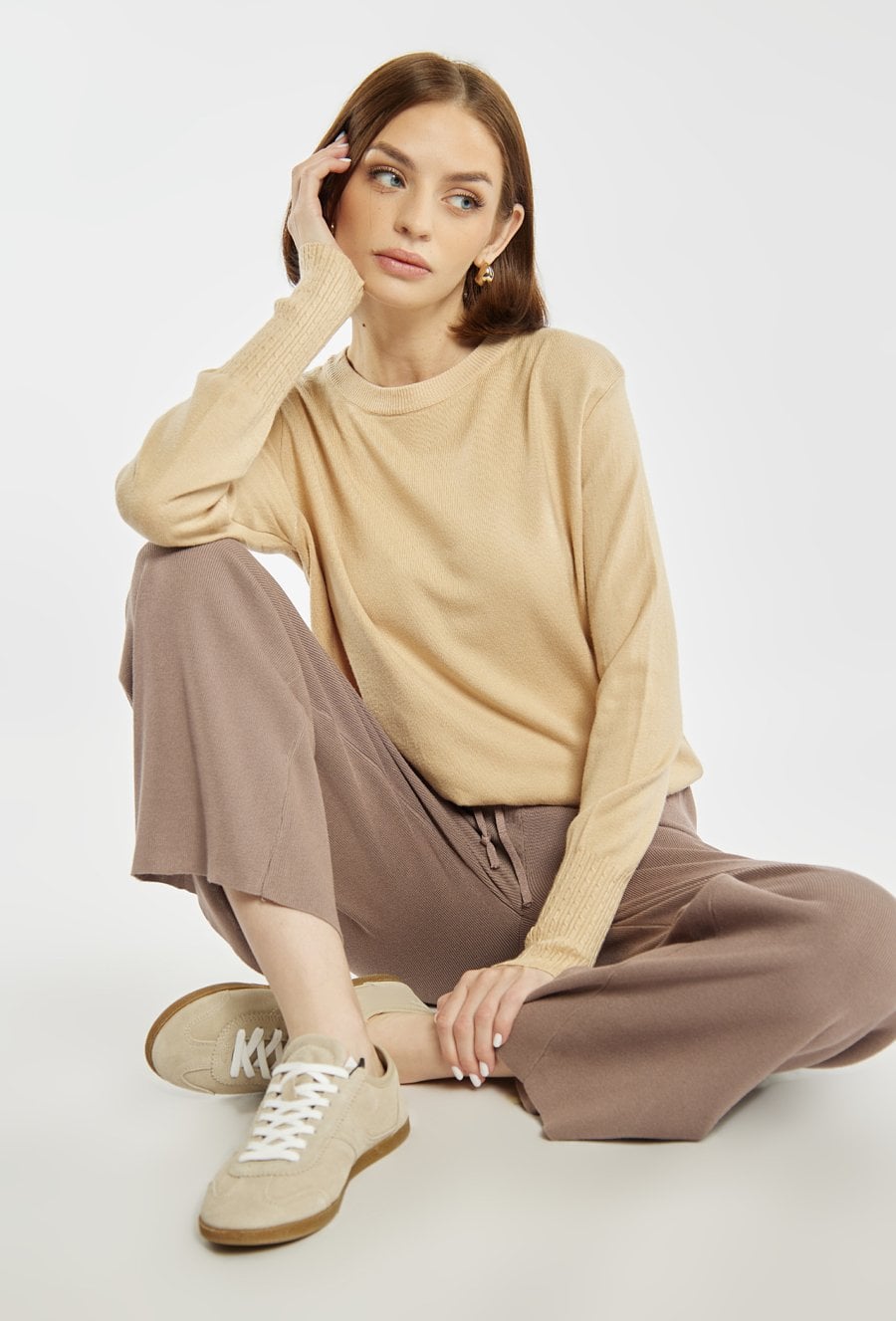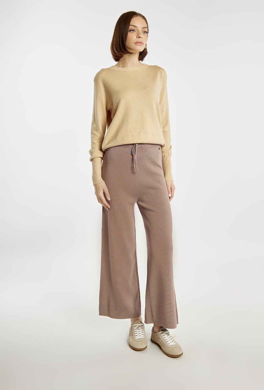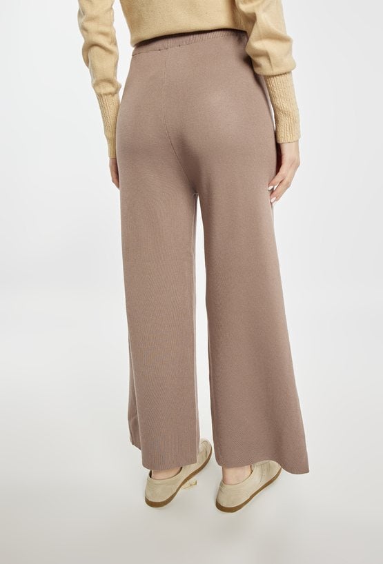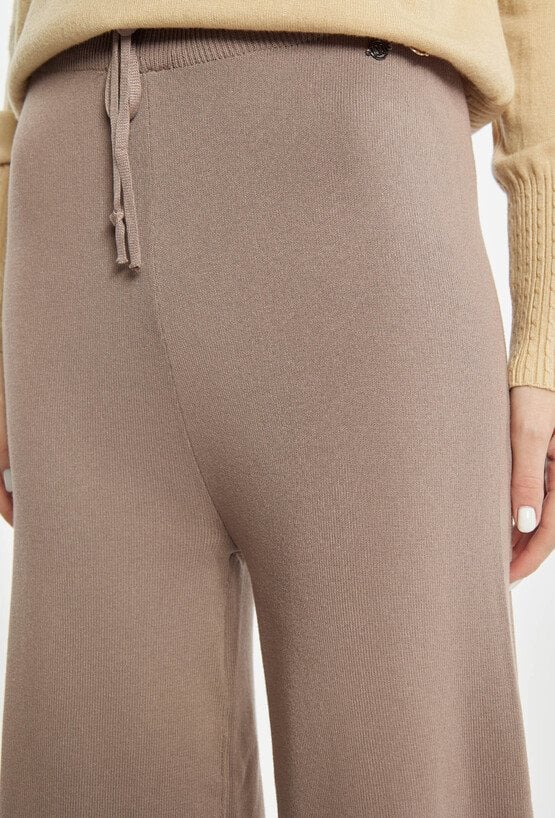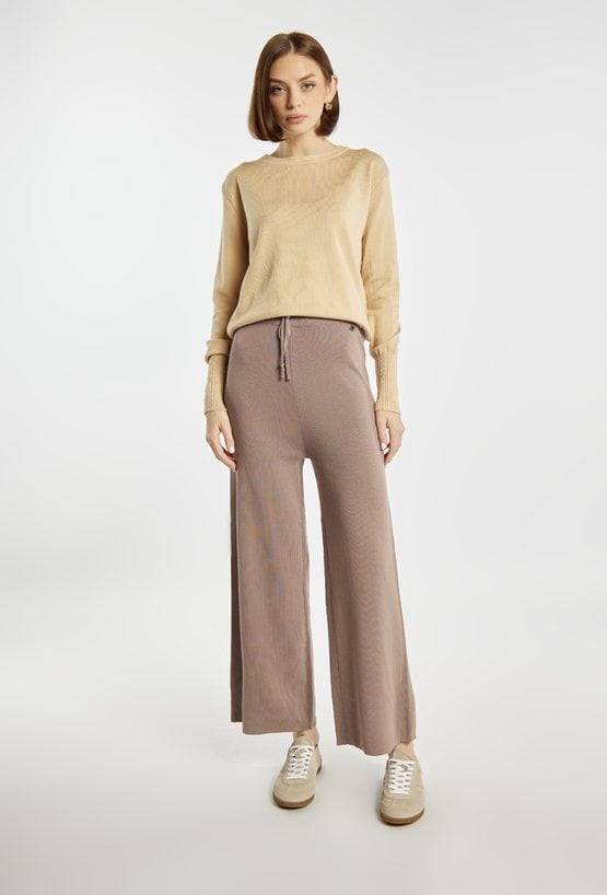 Spodnie o swobodnym kroju z szeroką nogawką, idealne na co dzień i do relaksu. Elastyczna talia ze sznurkiem umożliwia wygodne dopasowanie, a miękki, przyjemny w dotyku materiał zapewnia komfort noszenia. Dostępne w pięciu wariantach kolorystycznych. Modelka na zdjęciu ma 177 cm wzrostu i prezentuje rozmiar S/M.