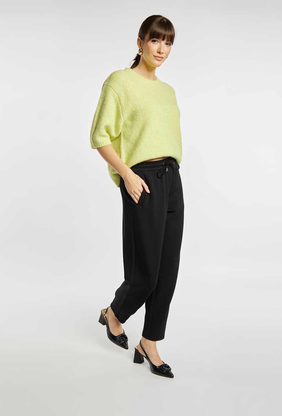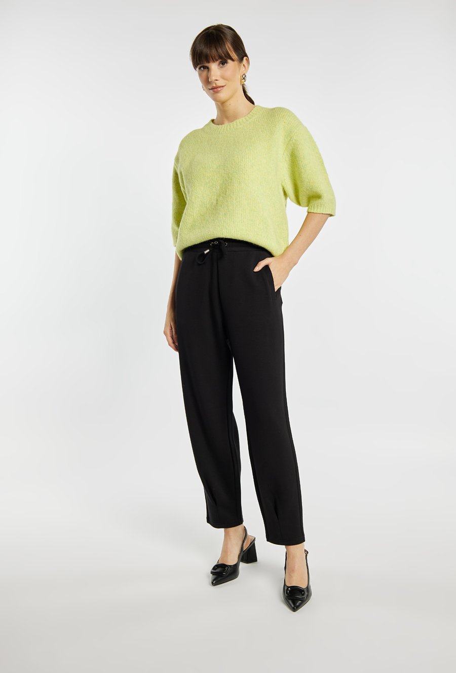 Spodnie damskie o wygodnym, lekko zwężanym kroju w klasycznej czerni. Spodnie mają elastyczną talię z troczkami oraz praktyczne kieszenie po bokach. Spodnie świetnie sprawdzą się na co dzień, łącząc komfort z eleganckim, uniwersalnym stylem. Modelka na zdjęciu ma 177 cm wzrostu i prezentuje rozmiar S.