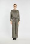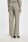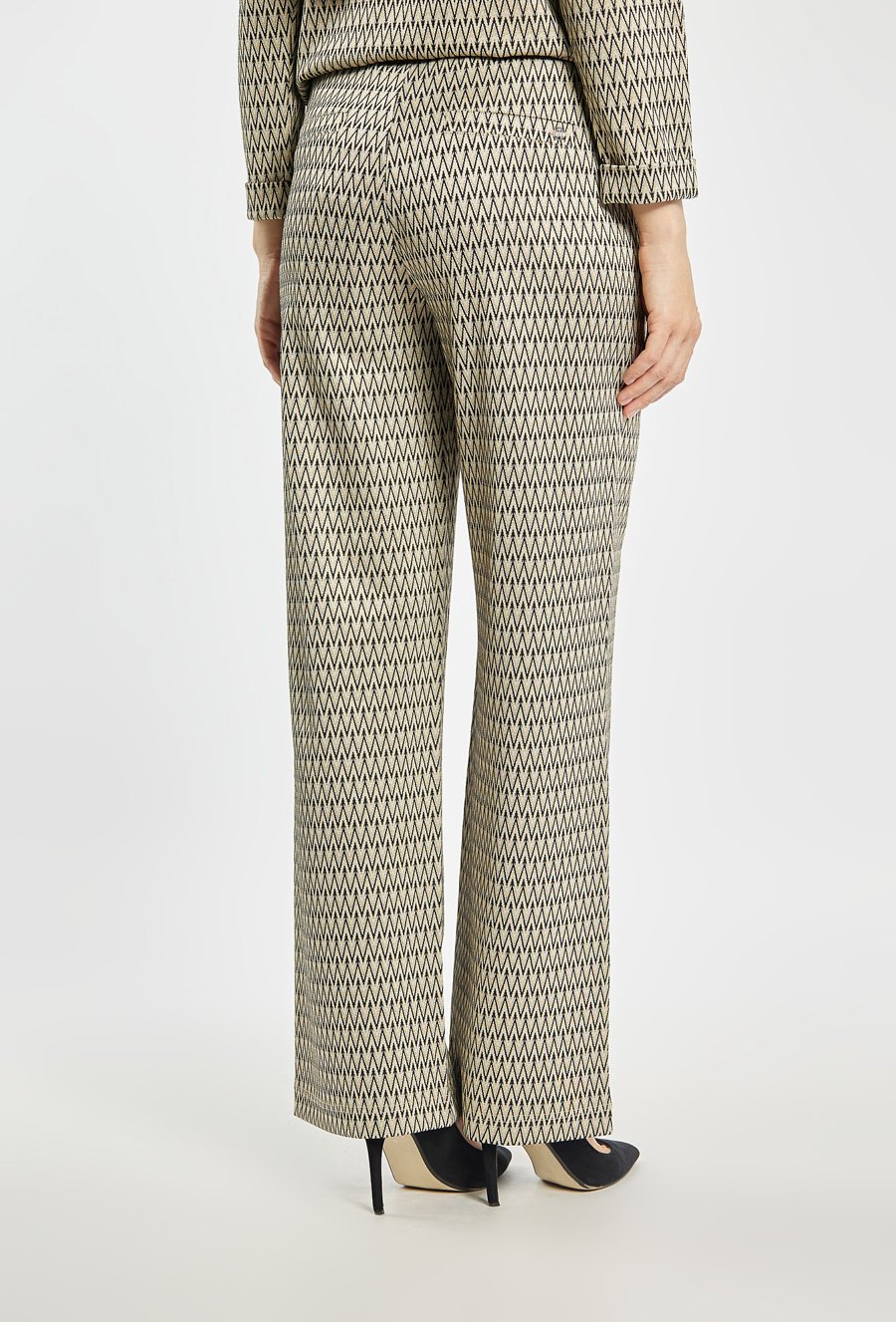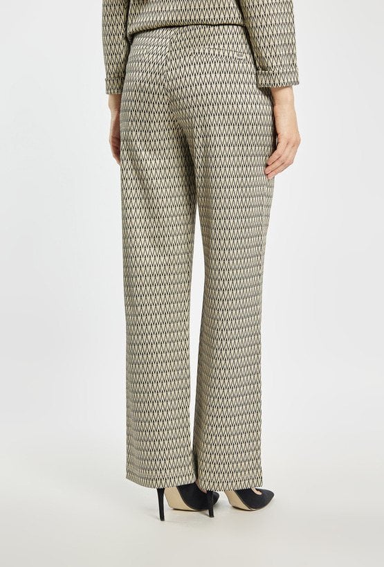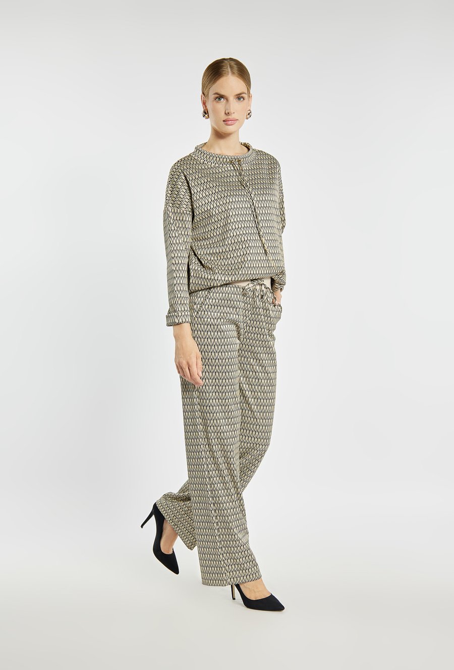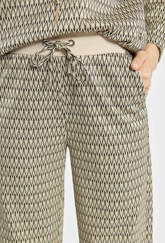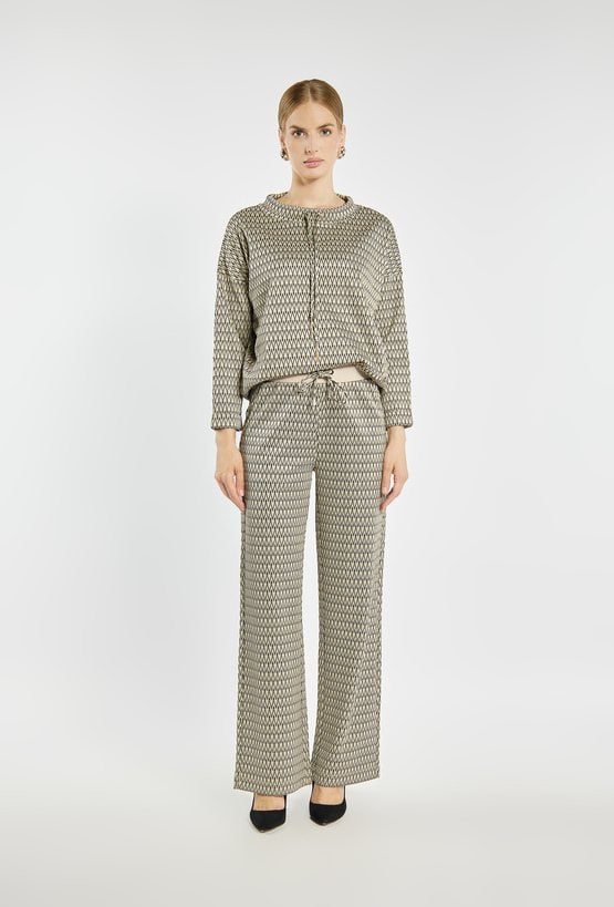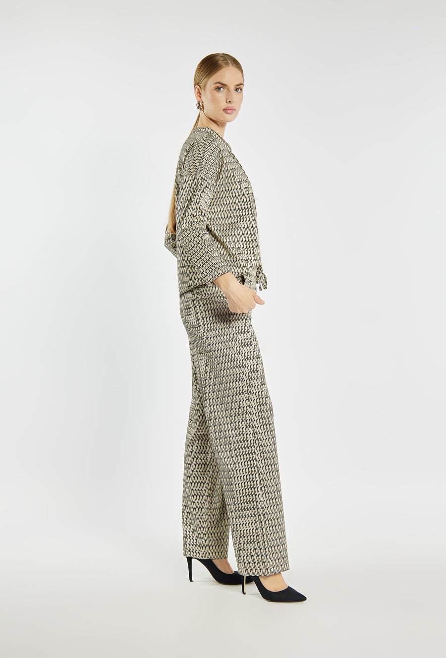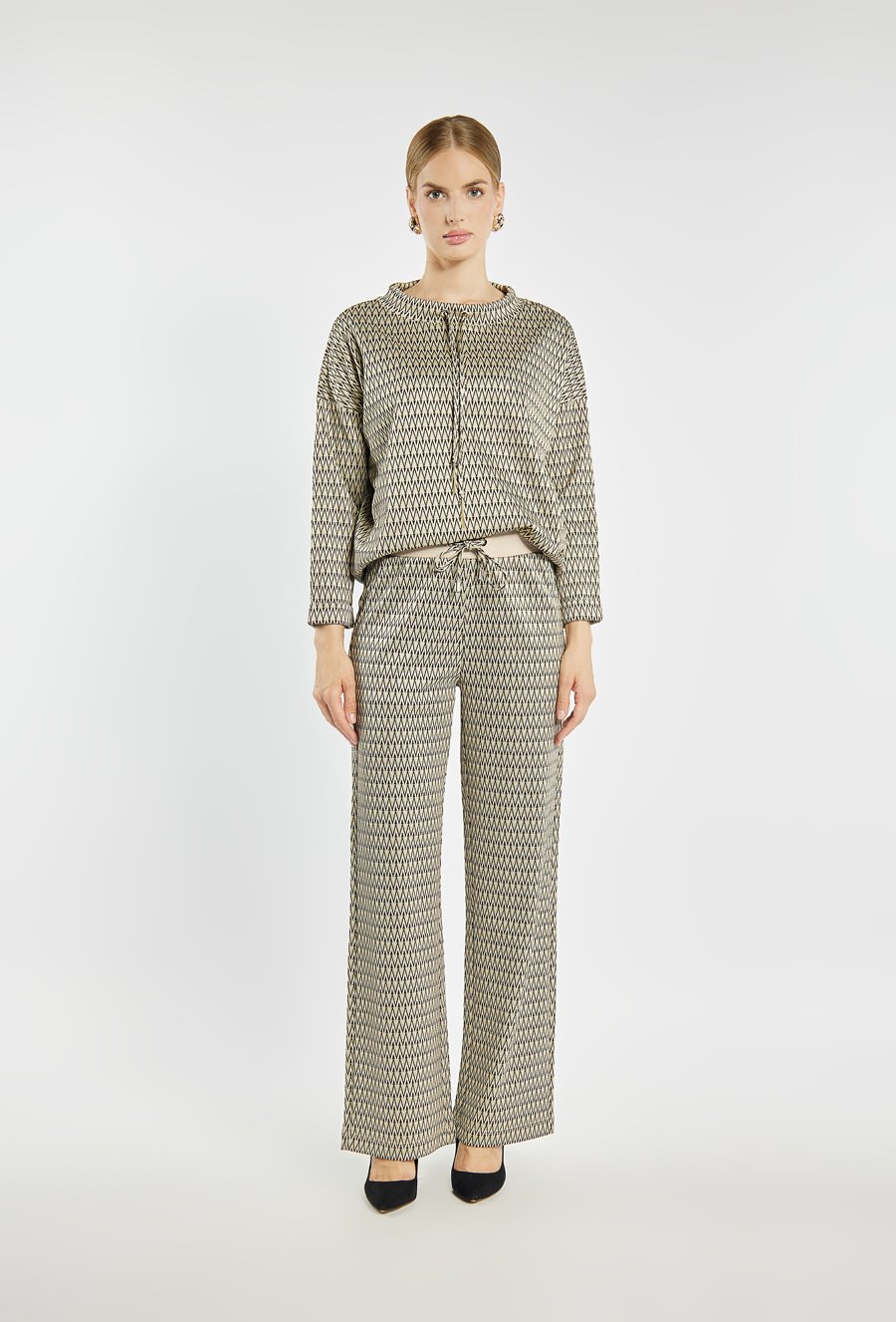 Spodnie damskie o prostym, lekko rozszerzanym kroju z wzorzystego materiału. W pasie elastyczna guma i troczek, co zapewnia wygodę i idealne dopasowanie. Stylowy wybór zarówno na co dzień, jak i w eleganckich zestawieniach. Polecamy zestawić z pasującą górą. Kod do bluzy: 25Z-JUM0990. Modelka na zdjęciu ma 177 cm wzrostu i prezentuje rozmiar S.