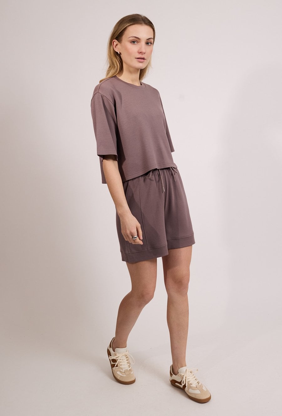 Stylowe spodenki damskie o prostym, wygodnym kroju. Model z elastycznym pasem, który zapewnia komfort noszenia i dobre dopasowanie do sylwetki. Spodenki doskonale sprawdzą się w codziennych i sportowych stylizacjach, na spacery oraz aktywny wypoczynek. Modelka na zdjęciu ma 177 cm wzrostu i prezentuje rozmiar S.