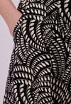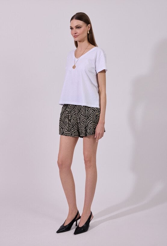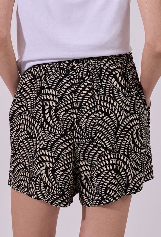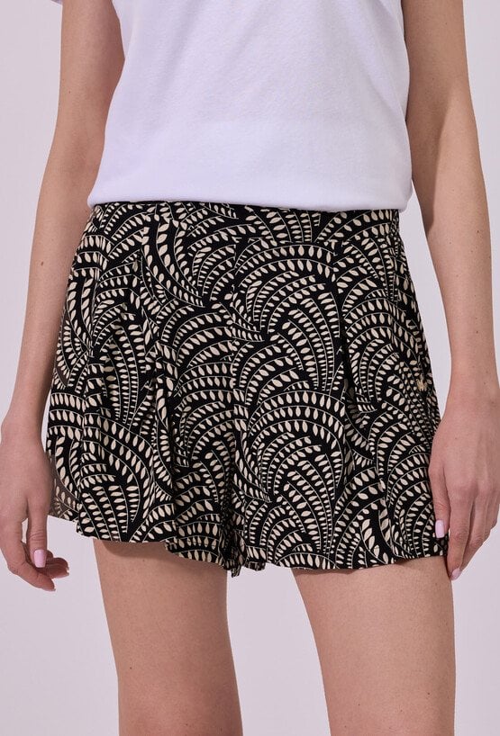 Szorty damskie o luźnym, komfortowym kroju z lekko rozkloszowaną nogawką. Model z wysokim stanem i elastyczną talią, który zapewnia wygodne dopasowanie oraz swobodę ruchów. Całość zdobi wyrazisty wzór, nadający stylizacji świeżego, letniego charakteru. Modelka na zdjęciu ma 177 cm wzrostu i prezentuje rozmiar 36.