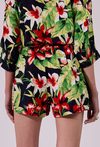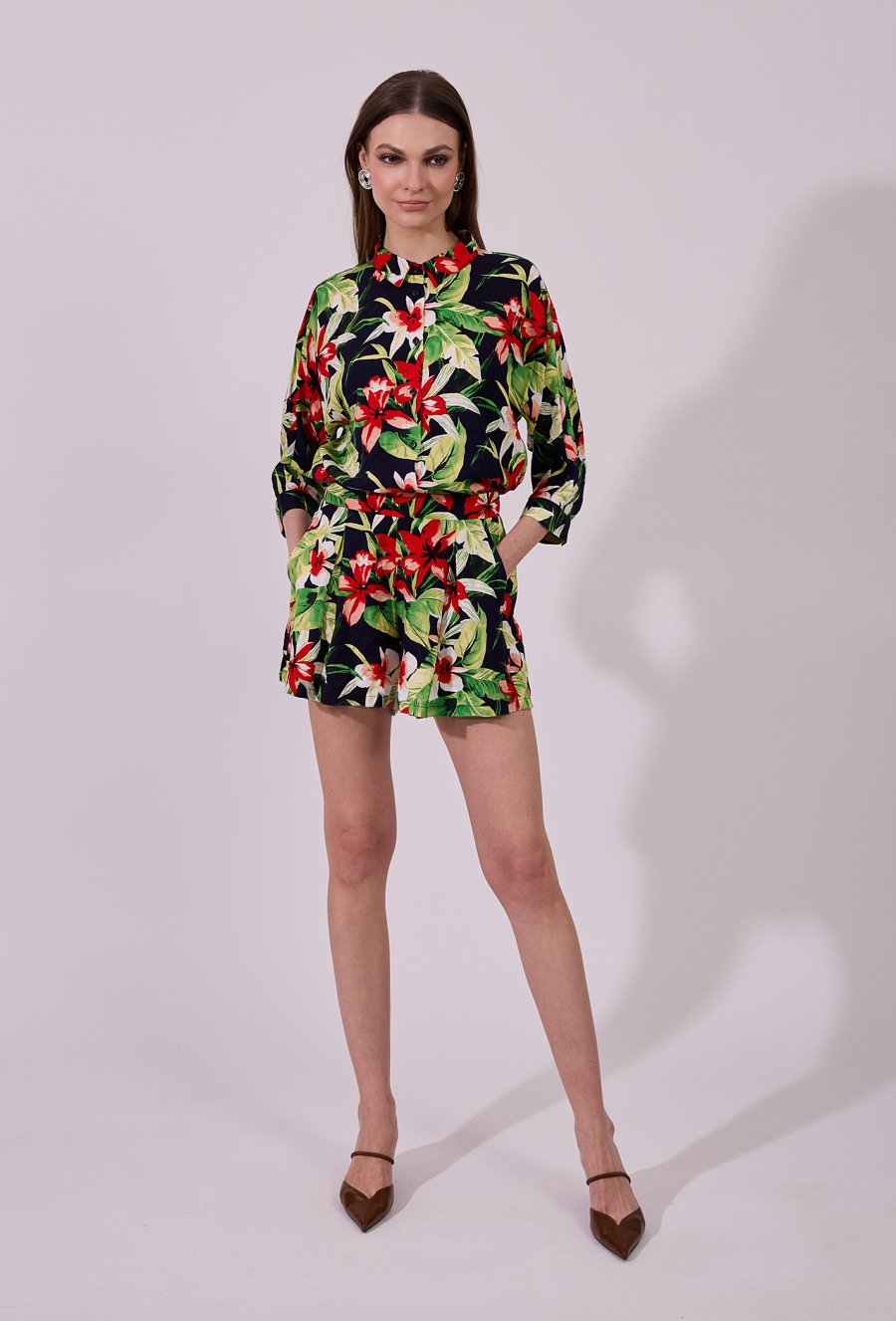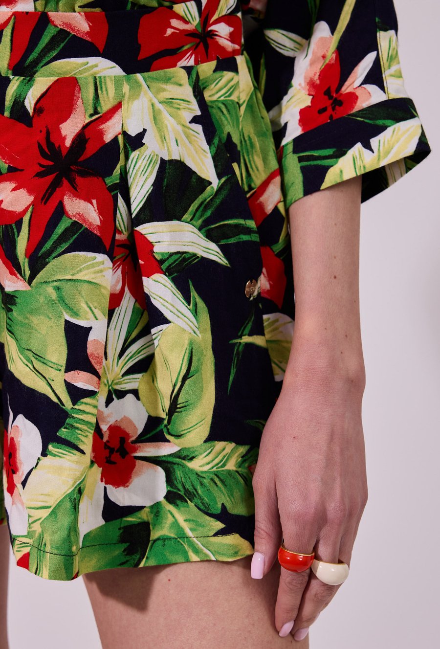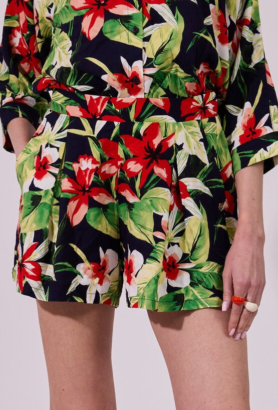 Szorty damskie o luźnym, komfortowym kroju z lekko rozkloszowaną nogawką. Model z wysokim stanem i elastyczną talią, który zapewnia wygodne dopasowanie oraz swobodę ruchów. Całość zdobi wyrazisty wzór, nadający stylizacji świeżego, letniego charakteru. Modelka na zdjęciu ma 177 cm wzrostu i prezentuje rozmiar 36.