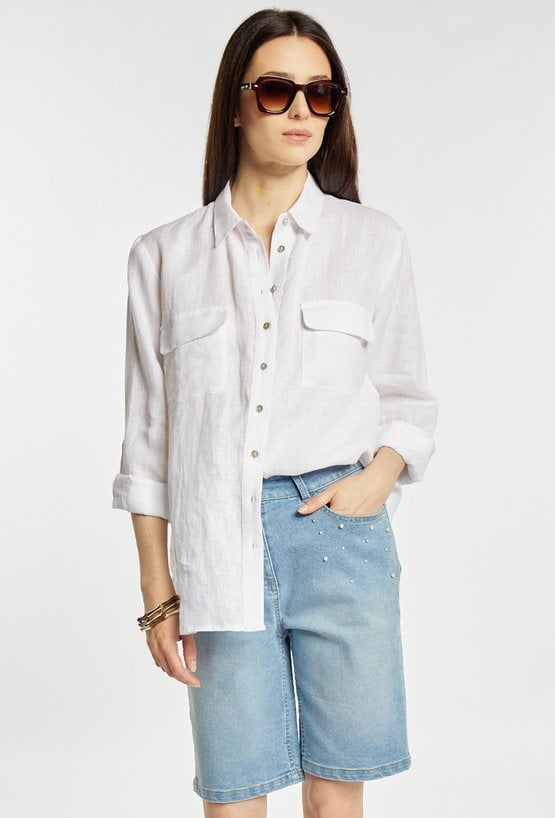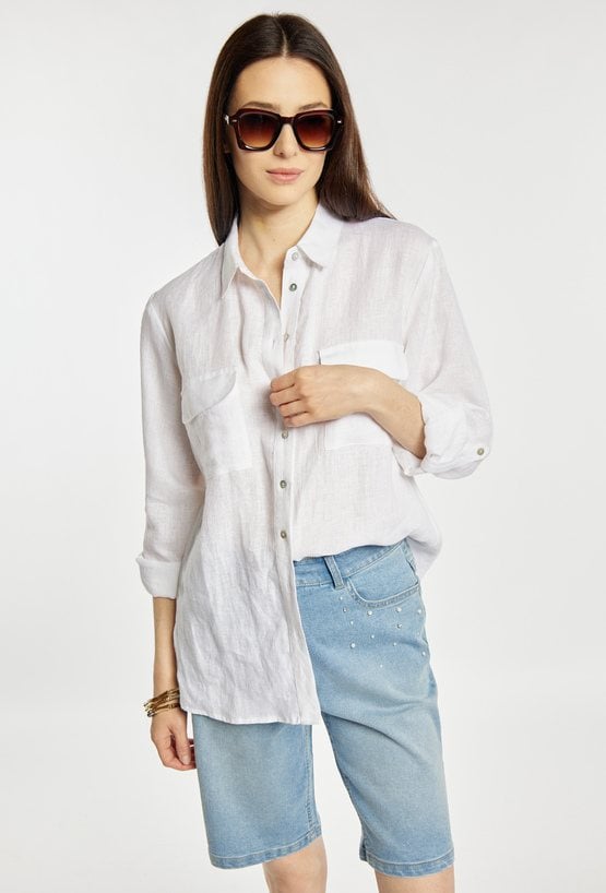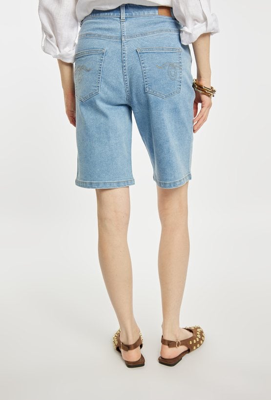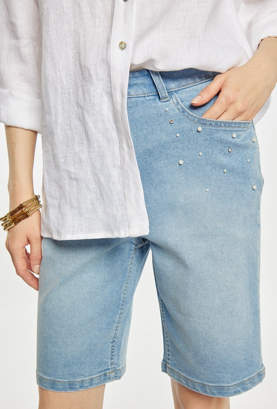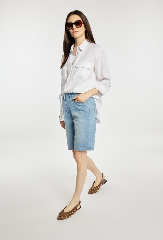Spodenki damskie o klasycznym, prostym kroju do kolan. Model z wysokim stanem oraz zapięciem na guzik i zamek, który zapewnia dobre dopasowanie. Ozdobne detale w postaci subtelnych aplikacji nadają całości modnego, kobiecego charakteru, a klasyczne kieszenie zwiększają funkcjonalność. Modelka na zdjęciu ma 177 cm wzrostu i prezentuje rozmiar 36.