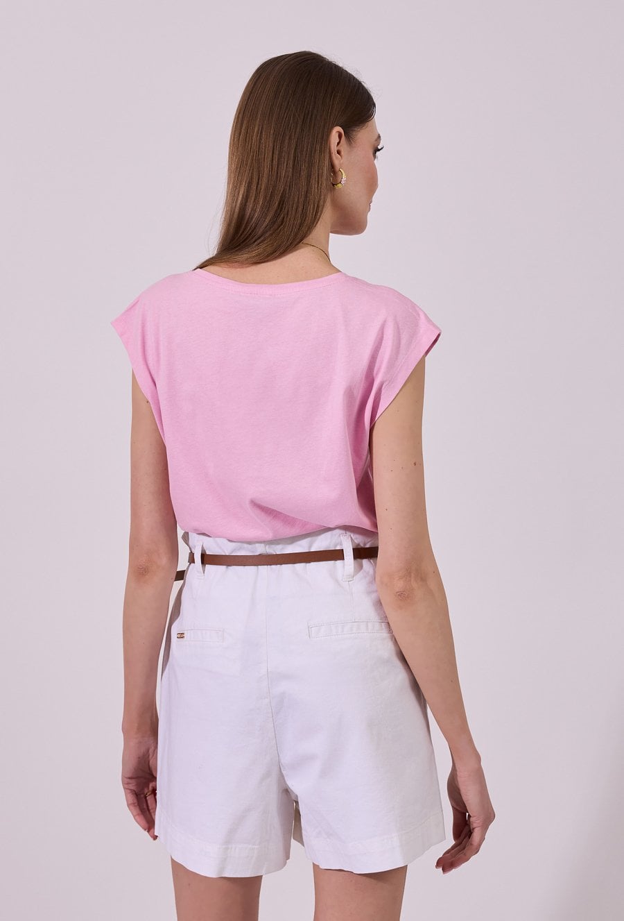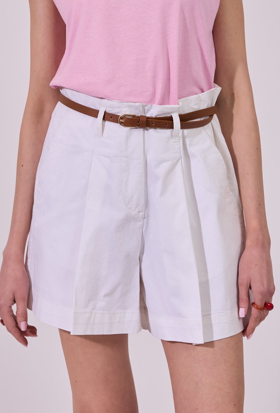 Szorty damskie o luźnym, lekko rozkloszowanym kroju. Model z wysokim stanem, wyposażony w klasyczne kieszenie. Wykonane z przyjemnego materiału, zapewniają komfort noszenia. Doskonałe zarówno do codziennych, jak i bardziej eleganckich stylizacji. Modelka na zdjęciu ma 177 cm wzrostu i prezentuje rozmiar 36.
