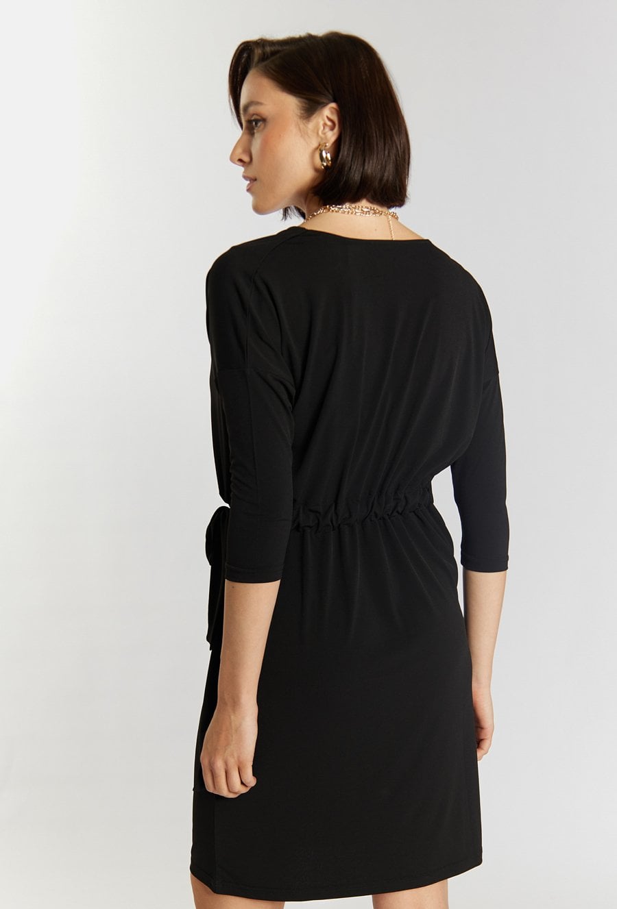 Elegancka sukienka damska mini z ozdobnym marszczeniem. Sukienka z lejącym dekoltem, rękawami 3/4 oraz wiązaniem na boku, które pięknie podkreśli sylwetkę. Model ten idealnie sprawdzi się w wyjątkowych okazjach. Modelka ma na zdjęciu 177 cm i prezentuje rozmiar 36.